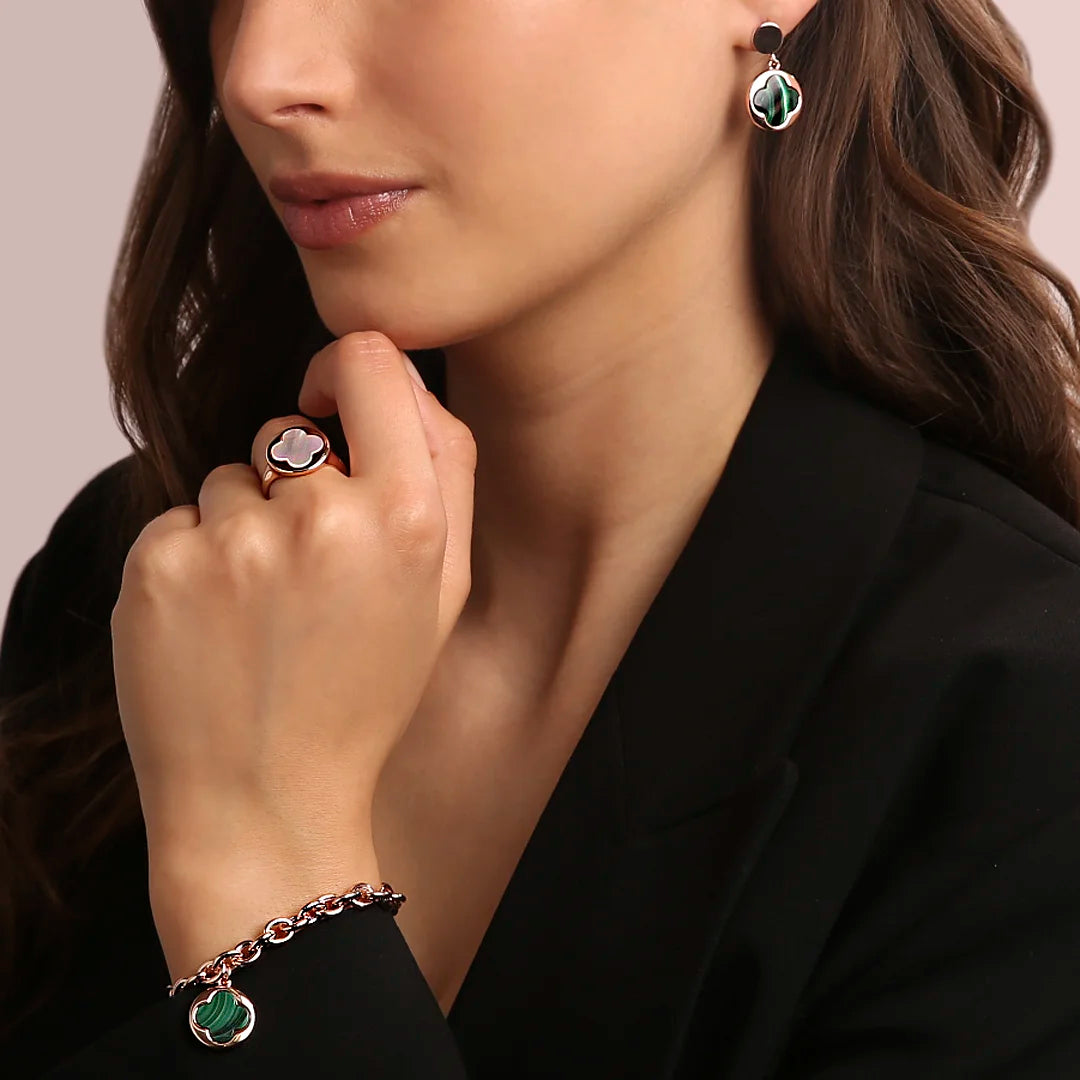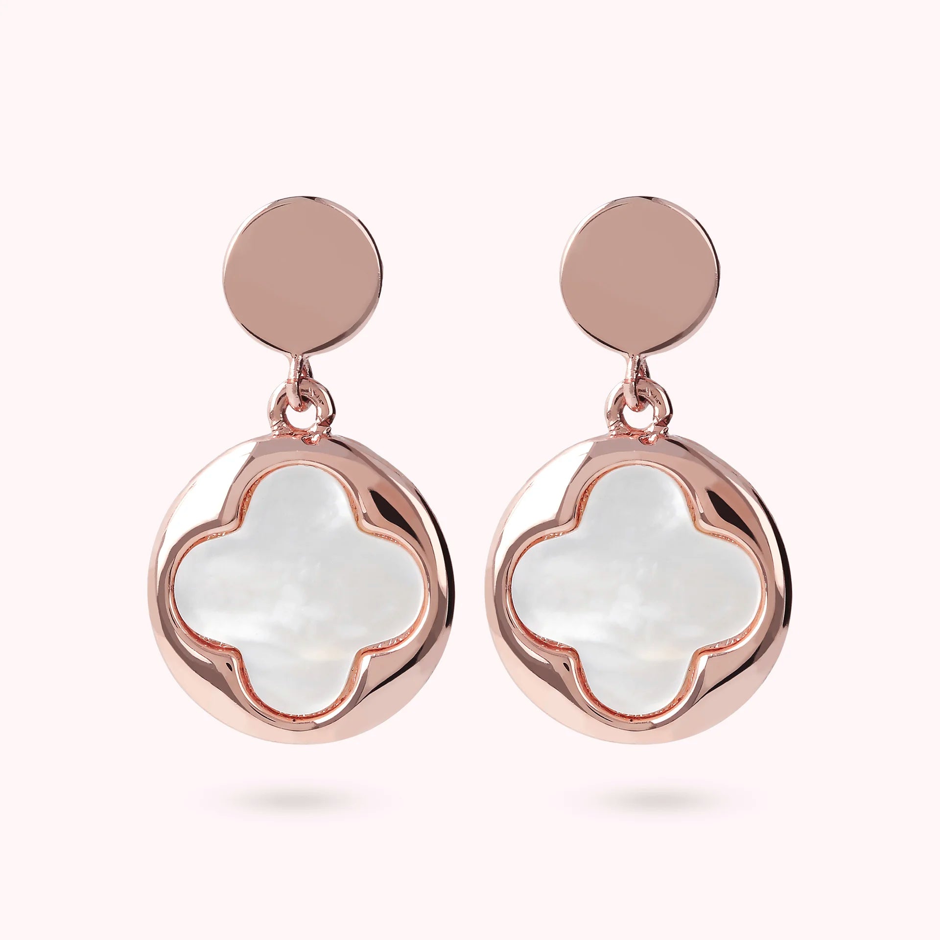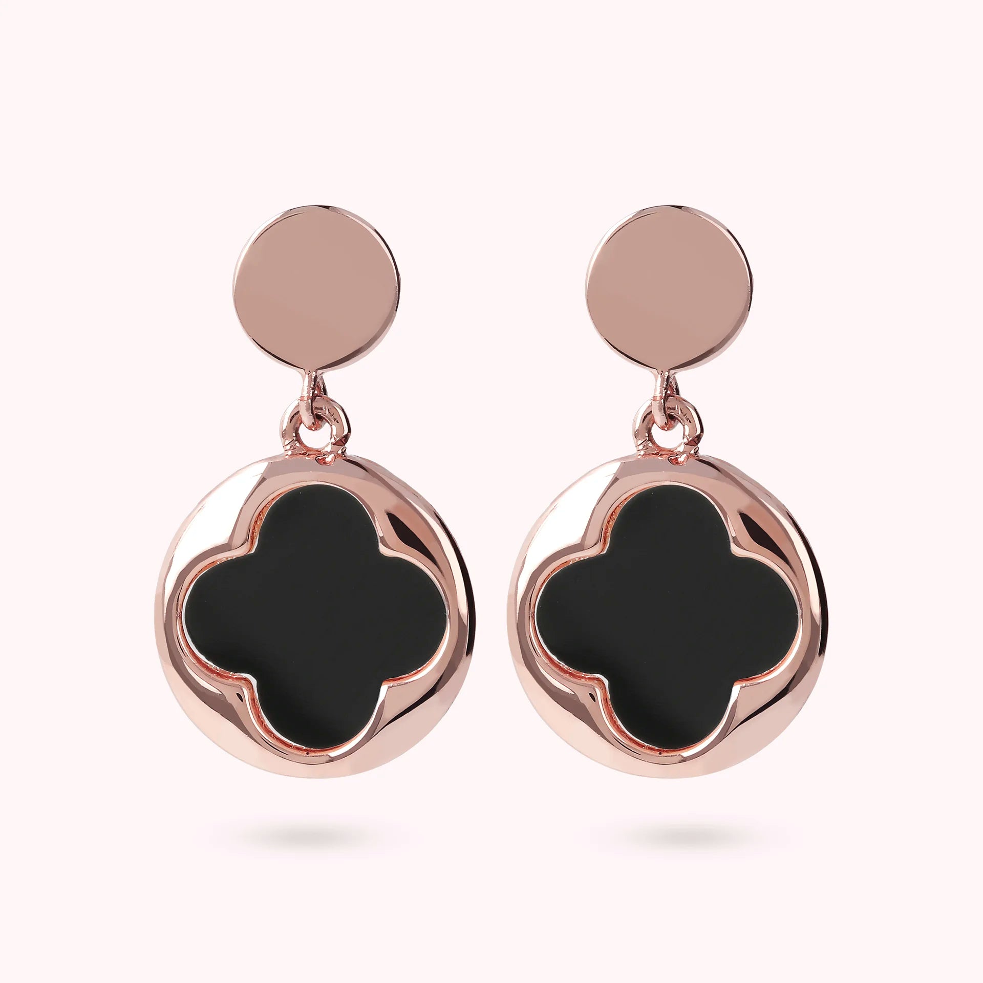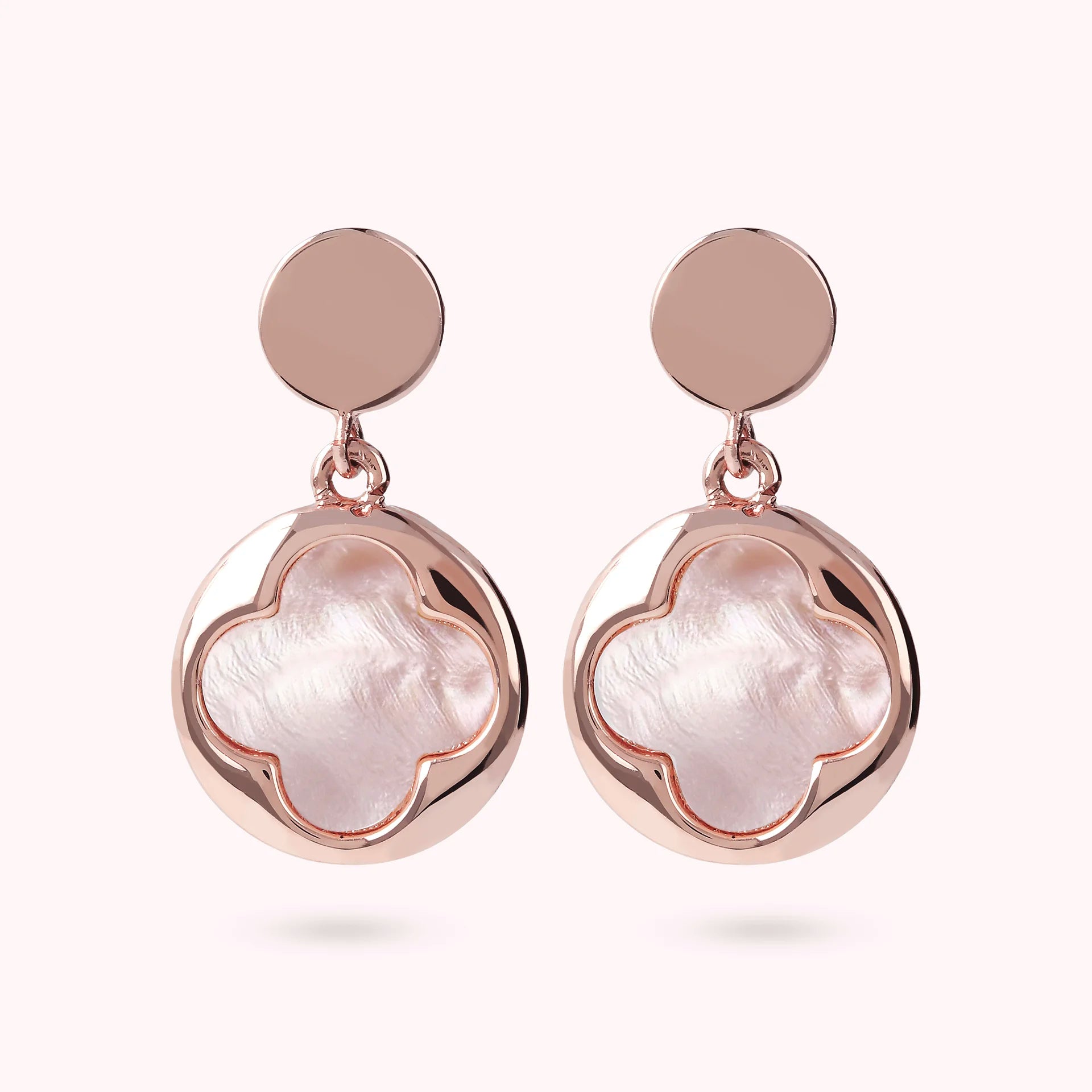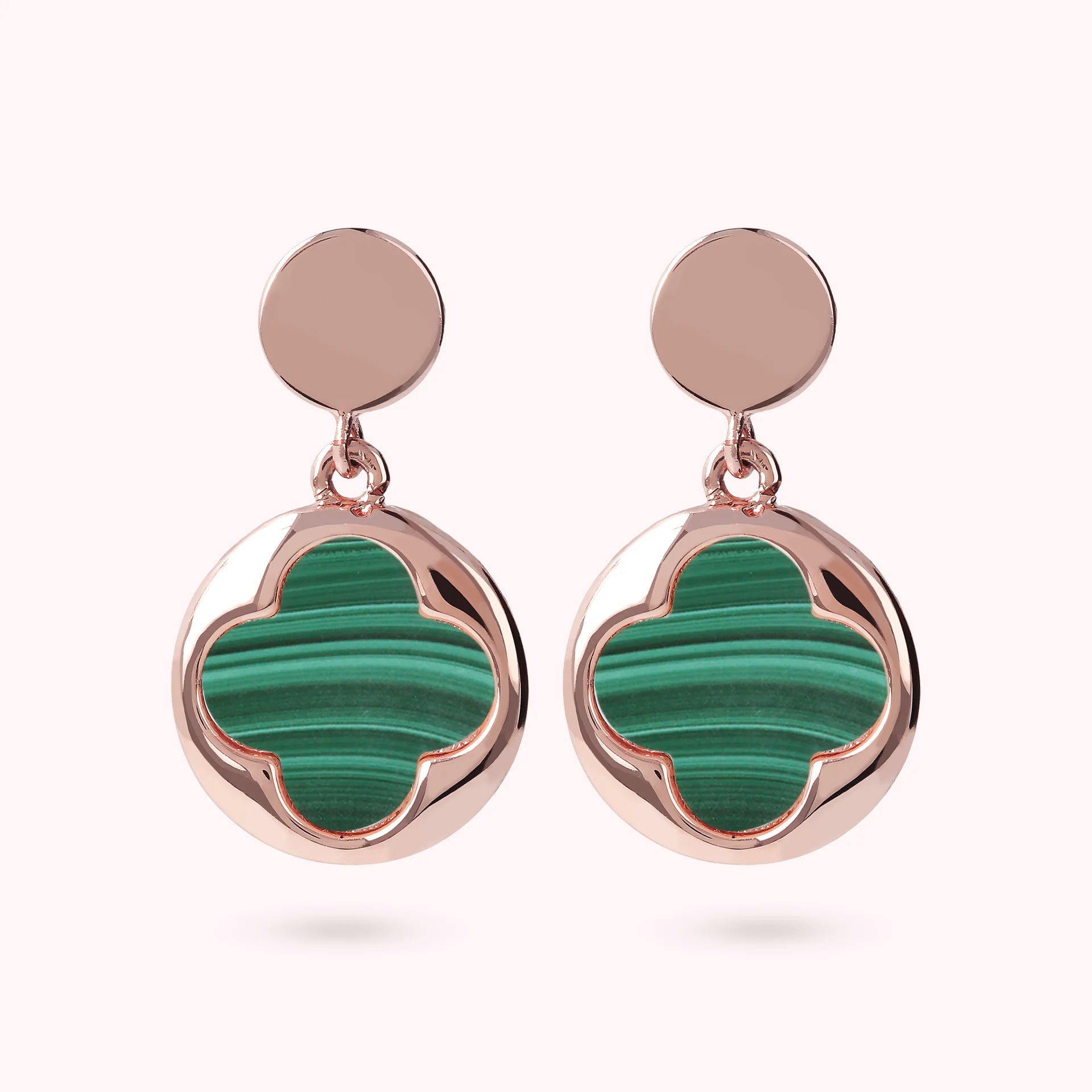 Bronzallure pendant earrings made of Golden Rosé alloy, 18kt rose gold plated with round pendant (1.5 cm) characterized by a four-leaf clover in natural stone, mounted on an 18kt rose gold plated base; stud and butterfly closure.