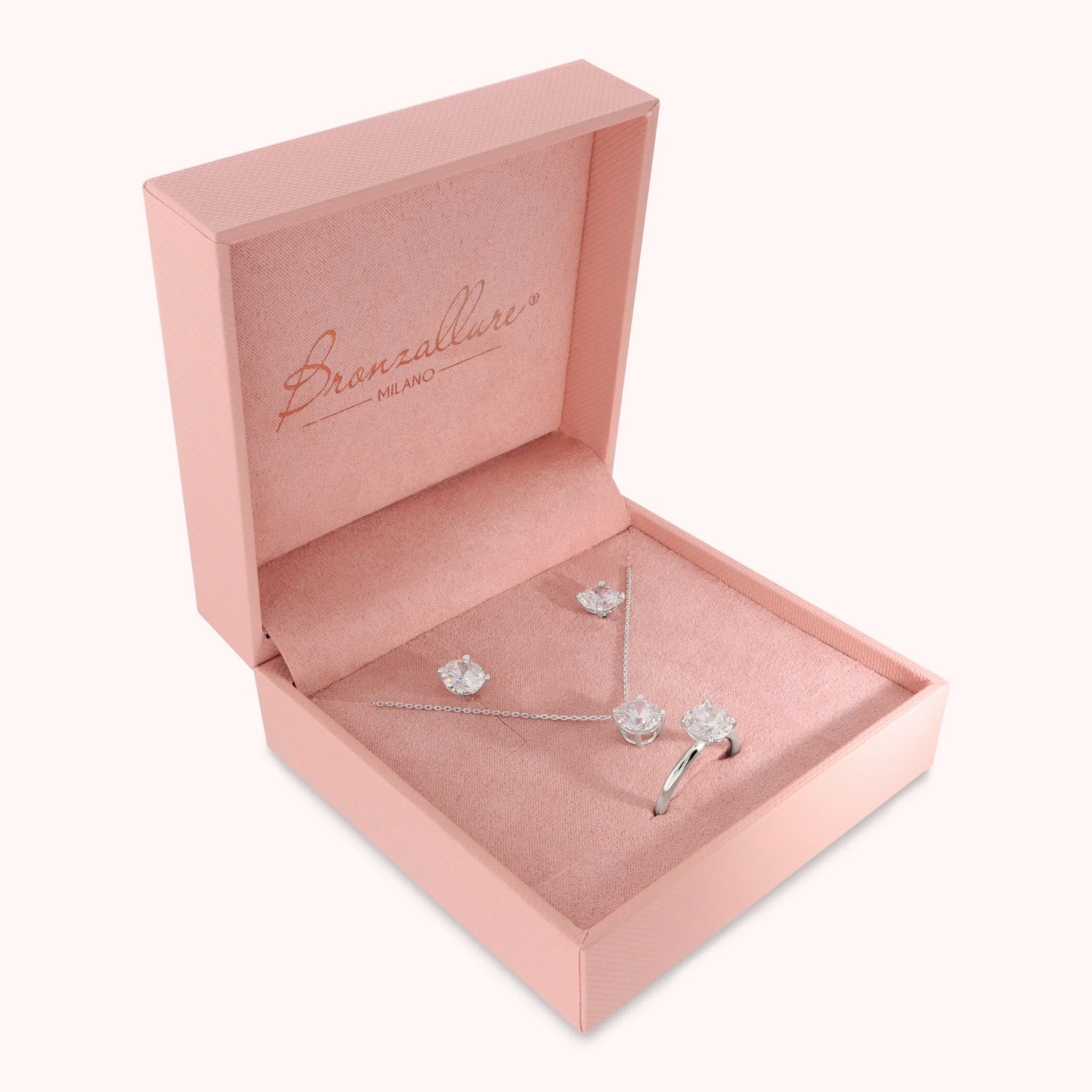 Bronzallure set made of Golden Rosé alloy, rhodium plated, consisting of a necklace with rolo chain and point light pendant (length 39+4cm), a pair of stud earrings with cubic zirconia stone (8mm), and a solitaire ring.