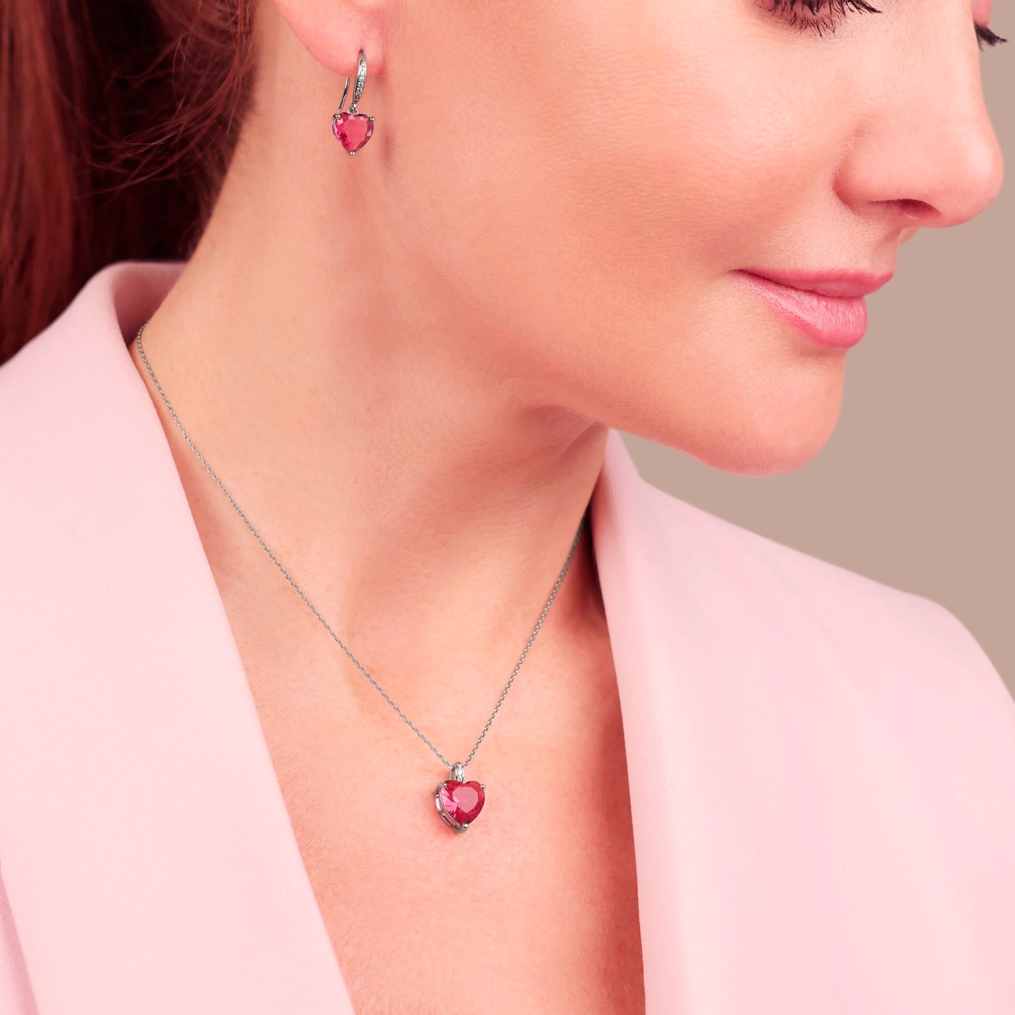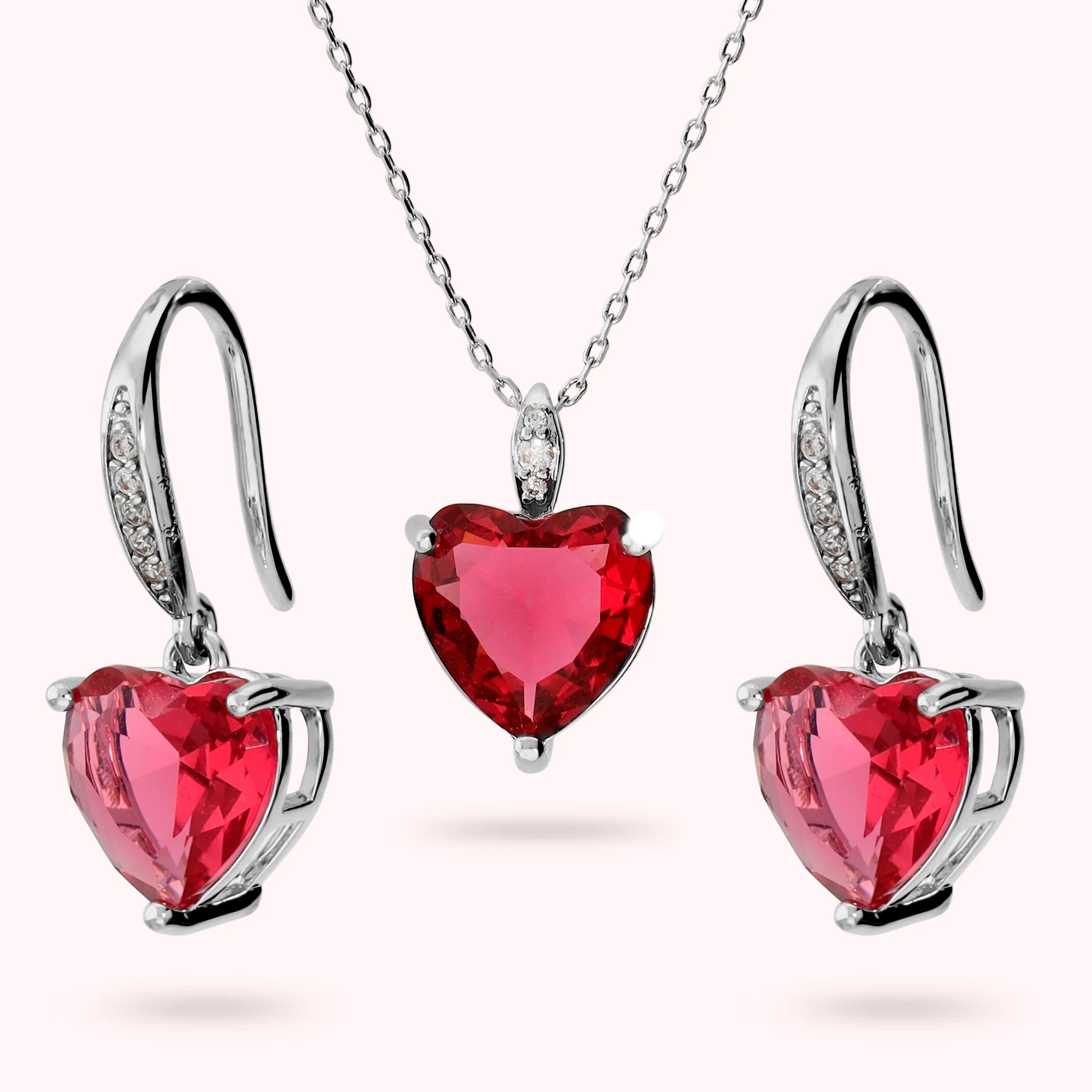Un delicato gioco di luce e colore: la collana con pendente a cuore rosso e gli orecchini coordinati brillano grazie ai dettagli in pavé bianco, creando un insieme romantico e raffinato, perfetto per esprimere dolcezza e stile in ogni occasione.