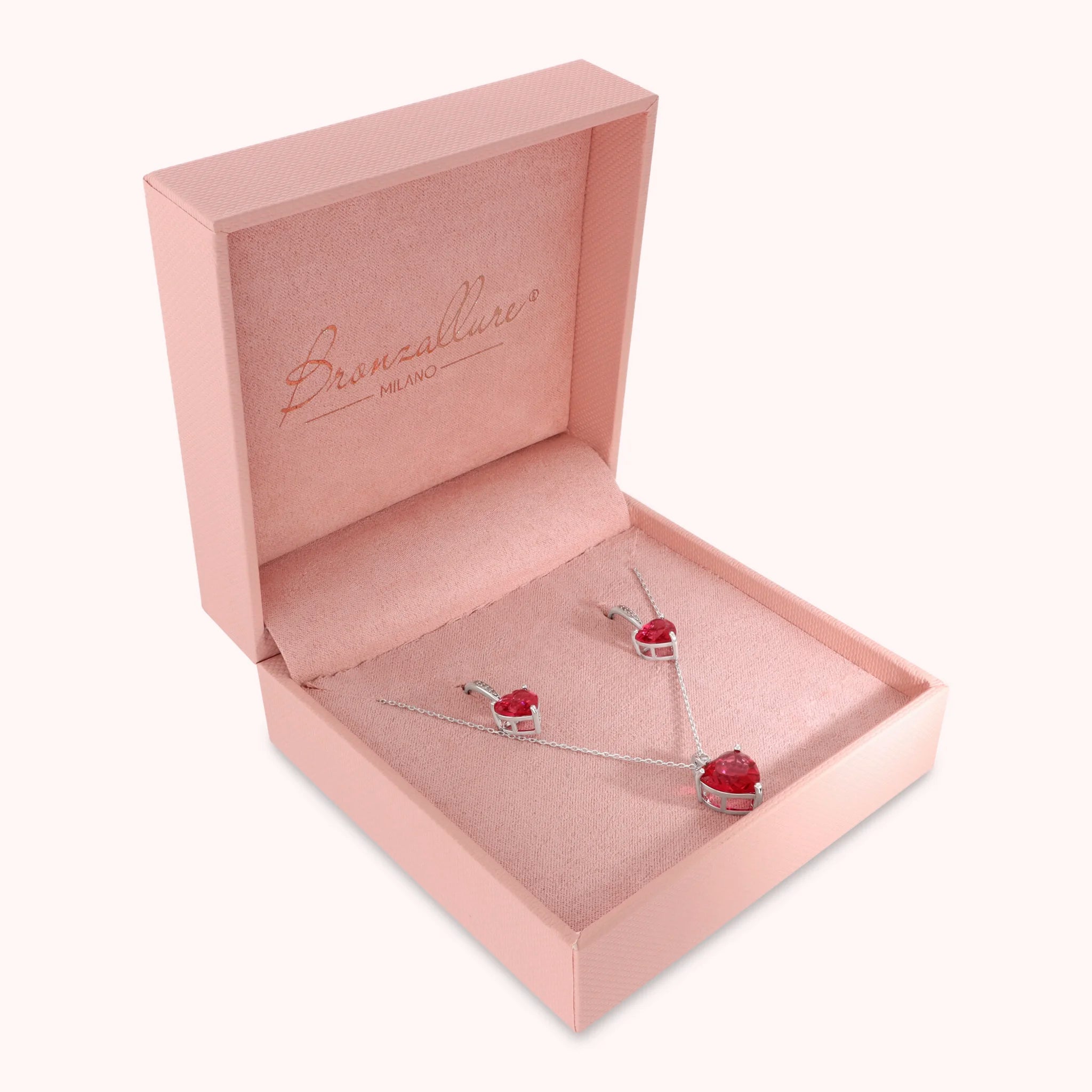Bronzallure heart set made of Golden Rosé alloy, rhodium plated, consisting of a necklace with rolo chain and red cubic zirconia heart pendant (length 39+4cm) and a pair of dangling earrings with hearts (8x8mm). Both items are embellished with a detail in white cubic zirconia pavé.