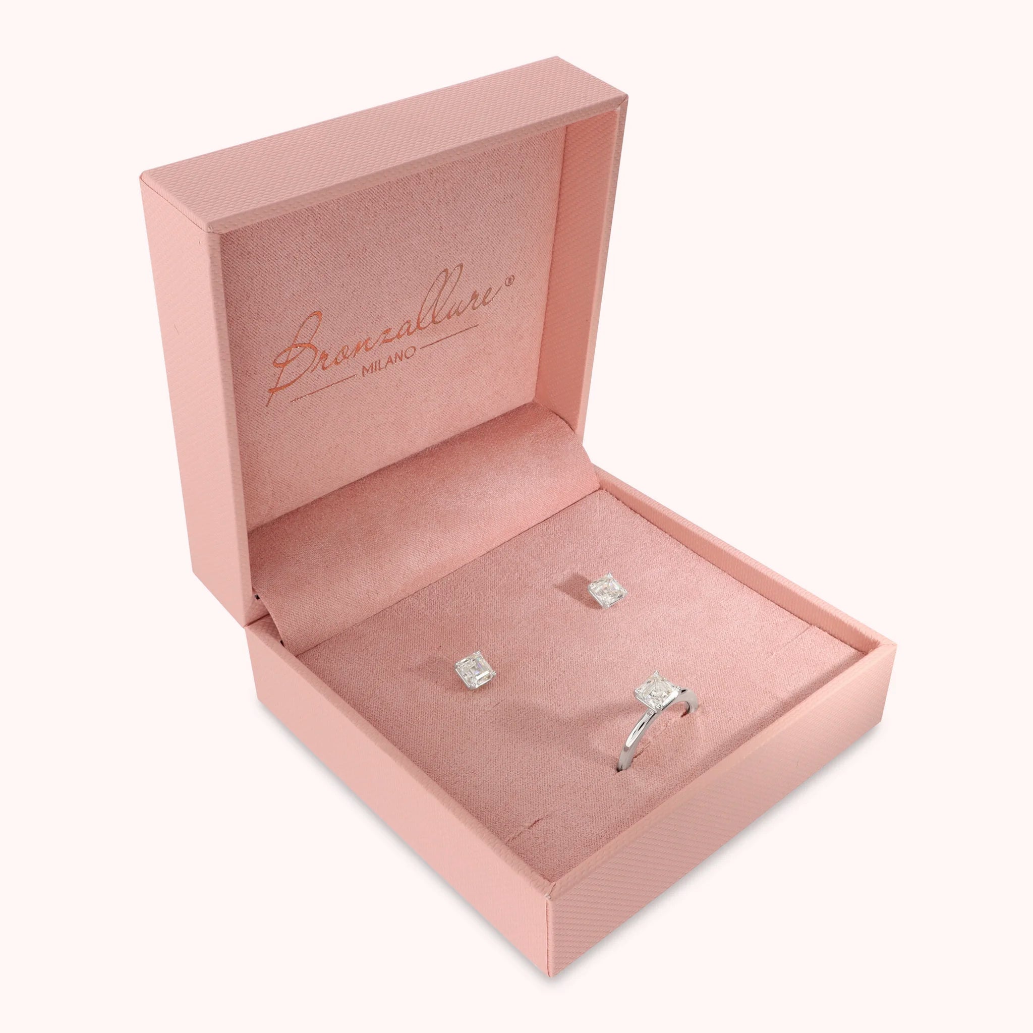 Bronzallure set made of Golden Rosé alloy, rhodium plated, consisting of a pair of stud earrings and a solitaire ring with white cubic zirconia, princess cut (6x6mm).