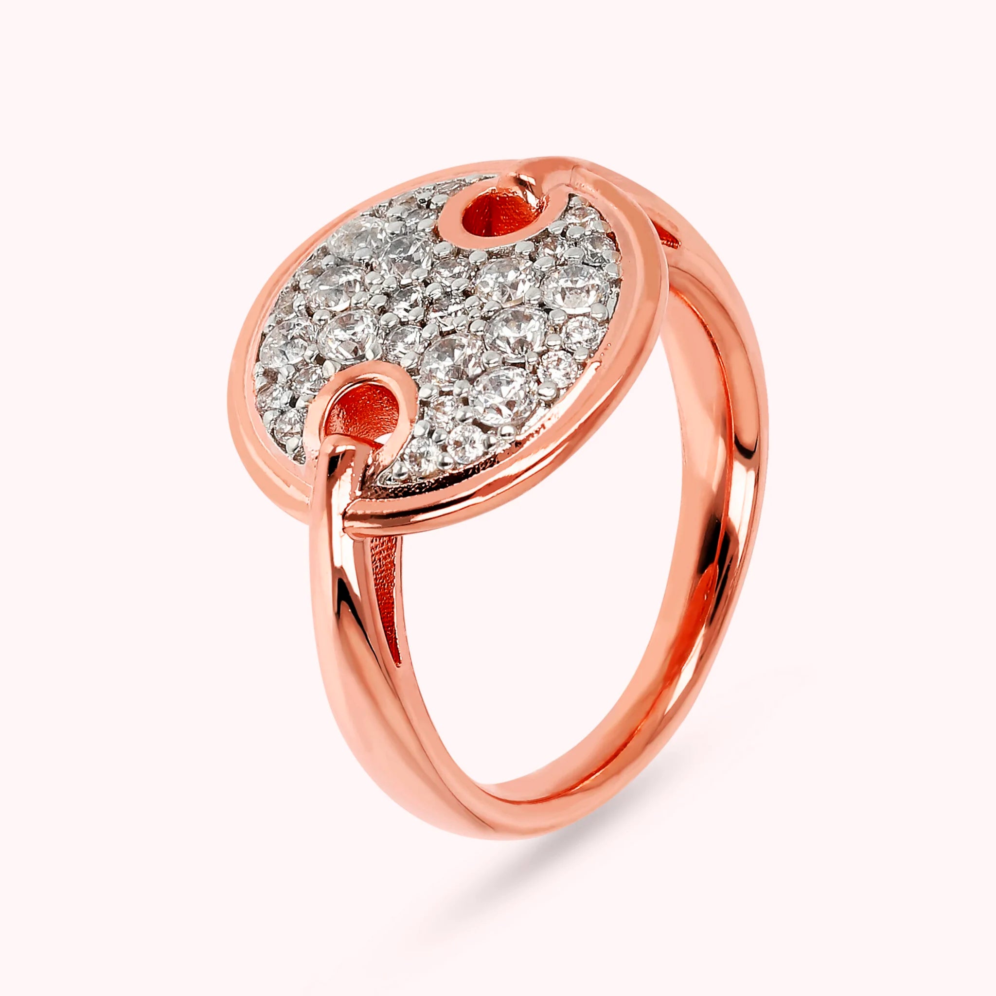 Bague bande Bronzallure en alliage Golden Rosé doré à l'or fin 18ct agrémentée d'un élément central rond (15 mm) avec une surface pavée d'oxydes de zirconium cubiques, qualité lumineuse.