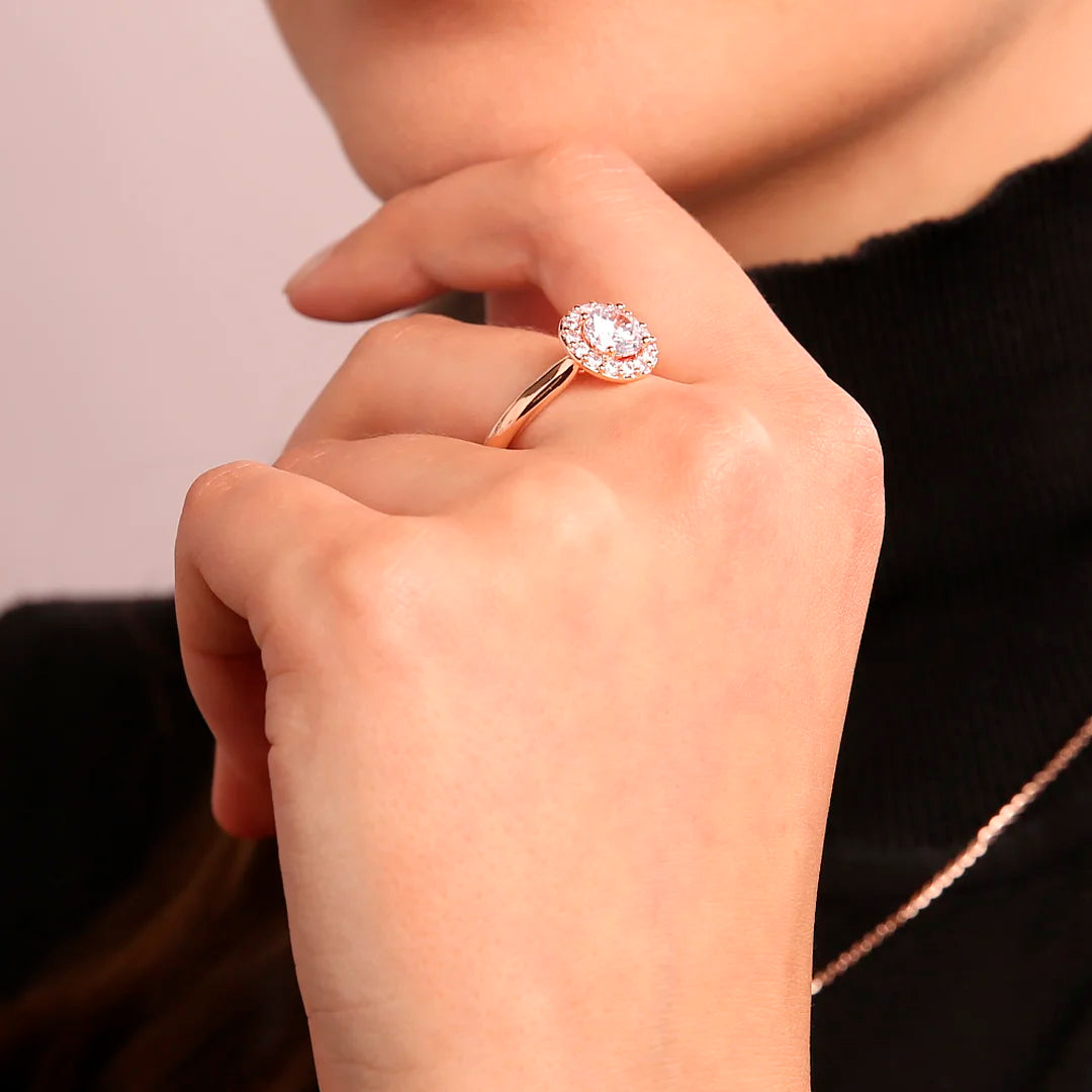 Bague solitaire Bronzallure en alliage Golden Rosé, doré à l'or fin 18ct, ornée d'un maxi zircon cubique entouré de petits zircons blancs.