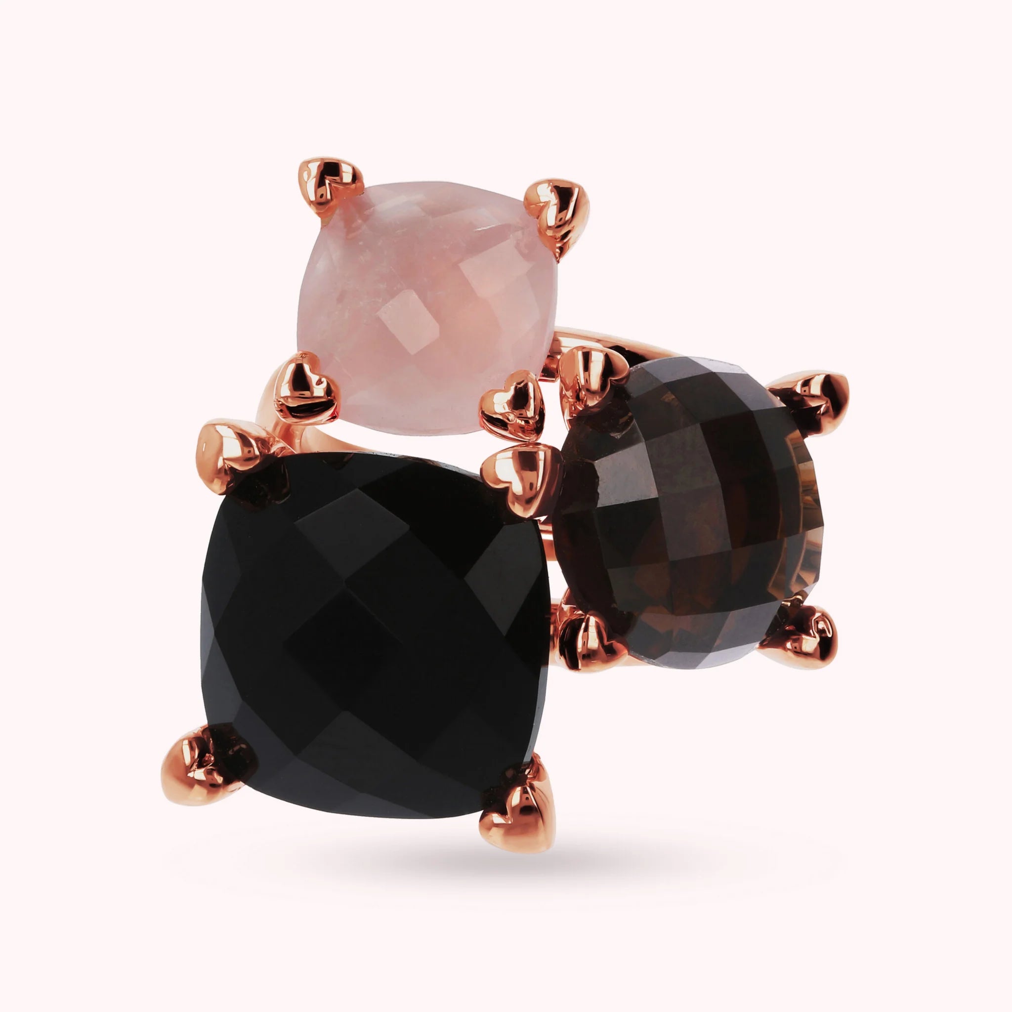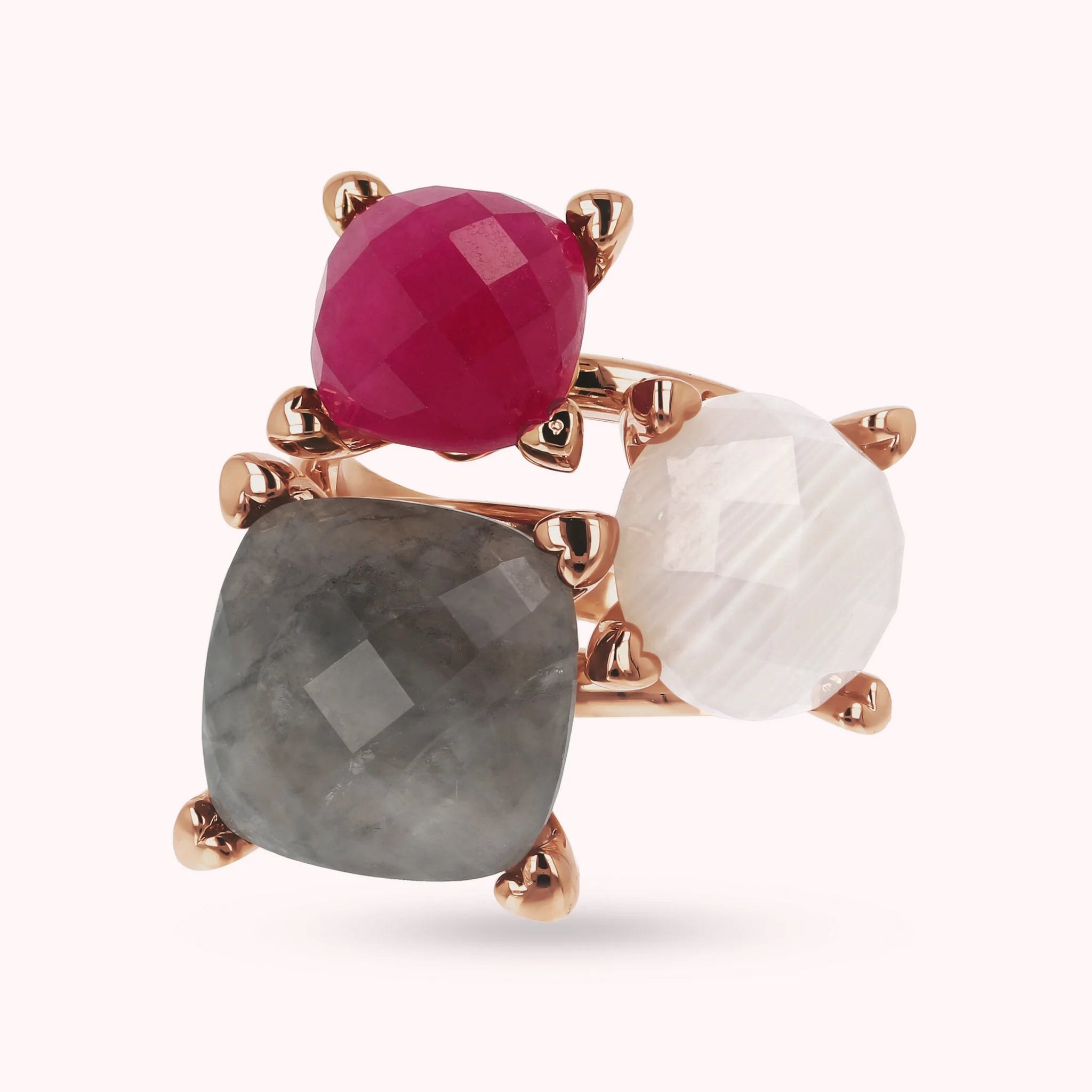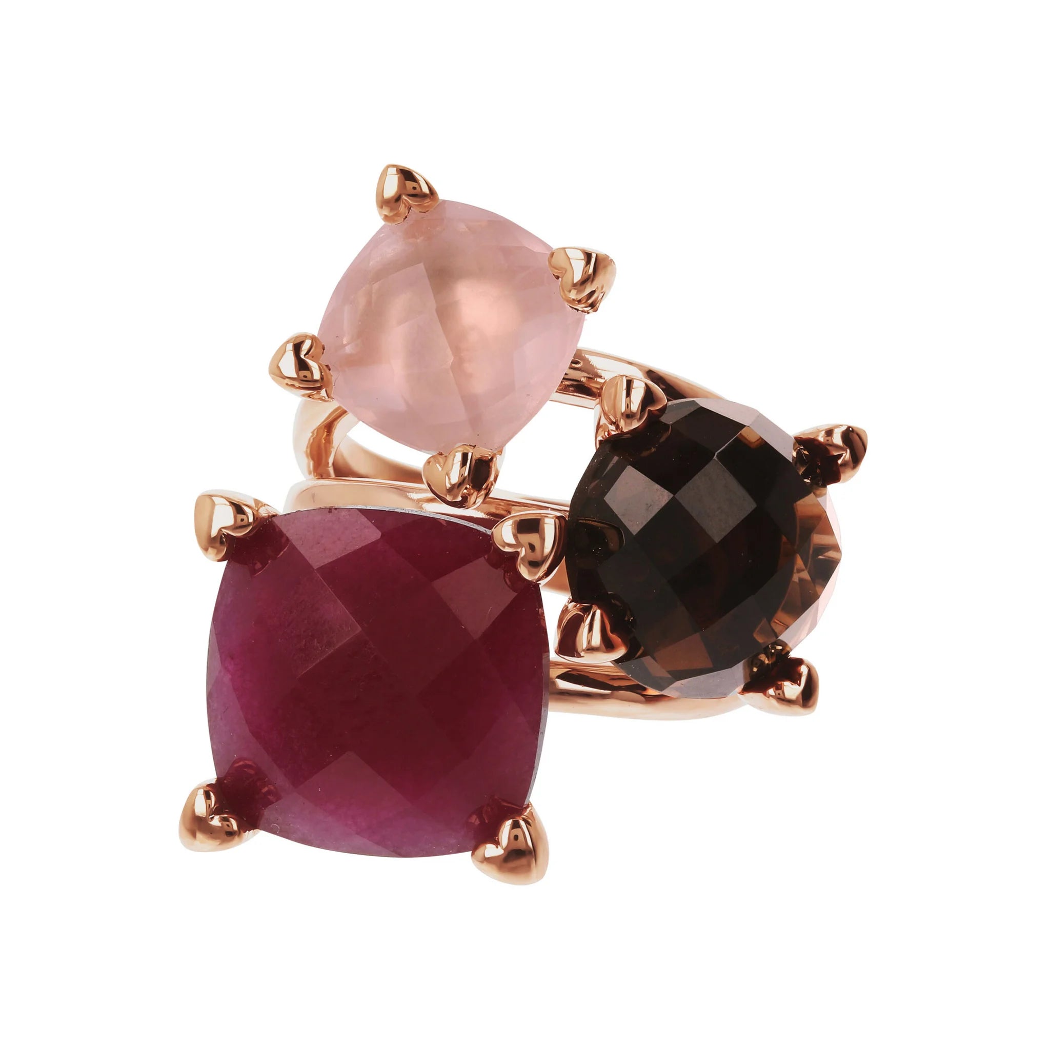 Bague trilogie multirangs Bronzallure en alliage Golden Rosé, doré à l'or fin 18ct, avec des chatons en forme de cœur et agrémentée de trois pierres naturelles aux couleurs vives et à la surface facettée.