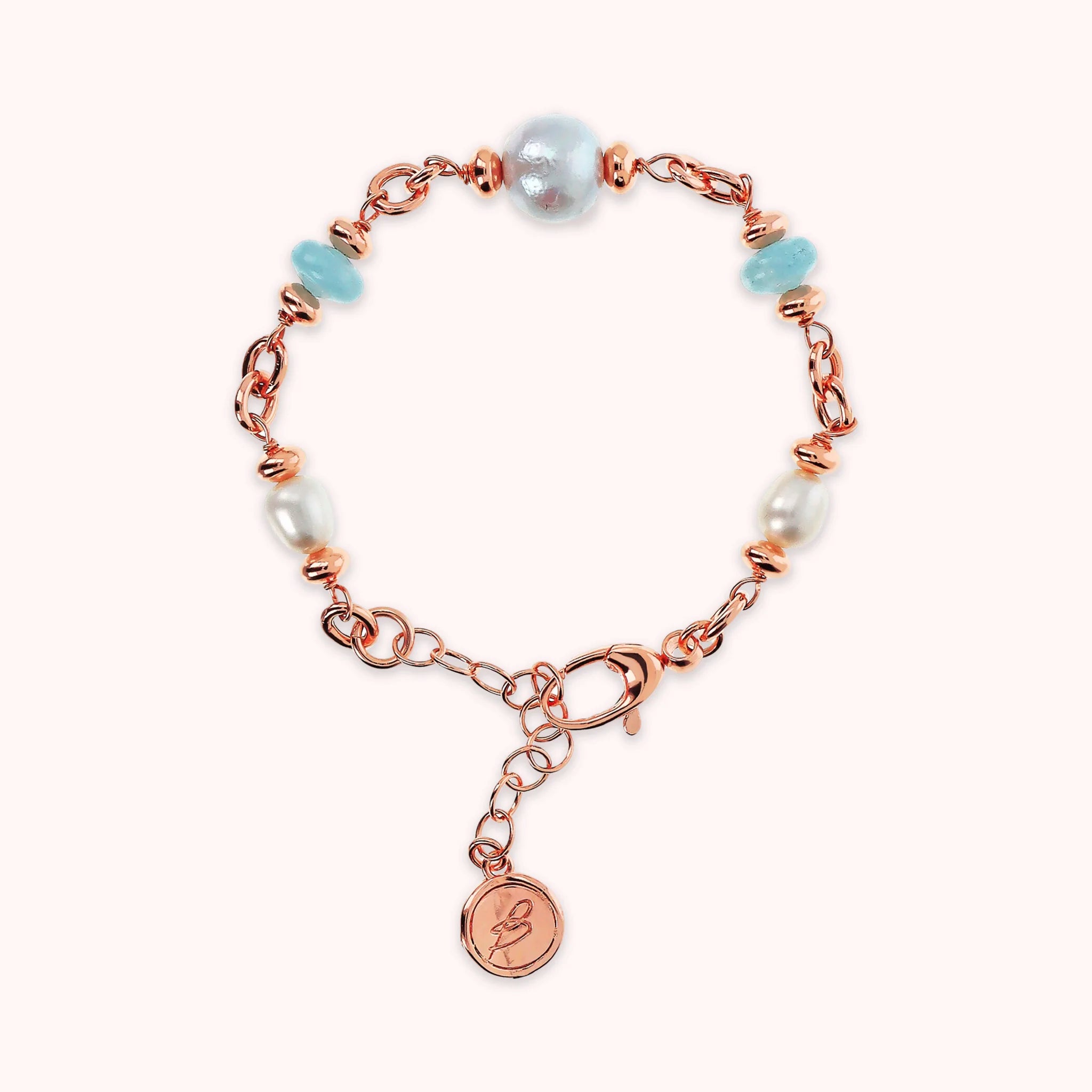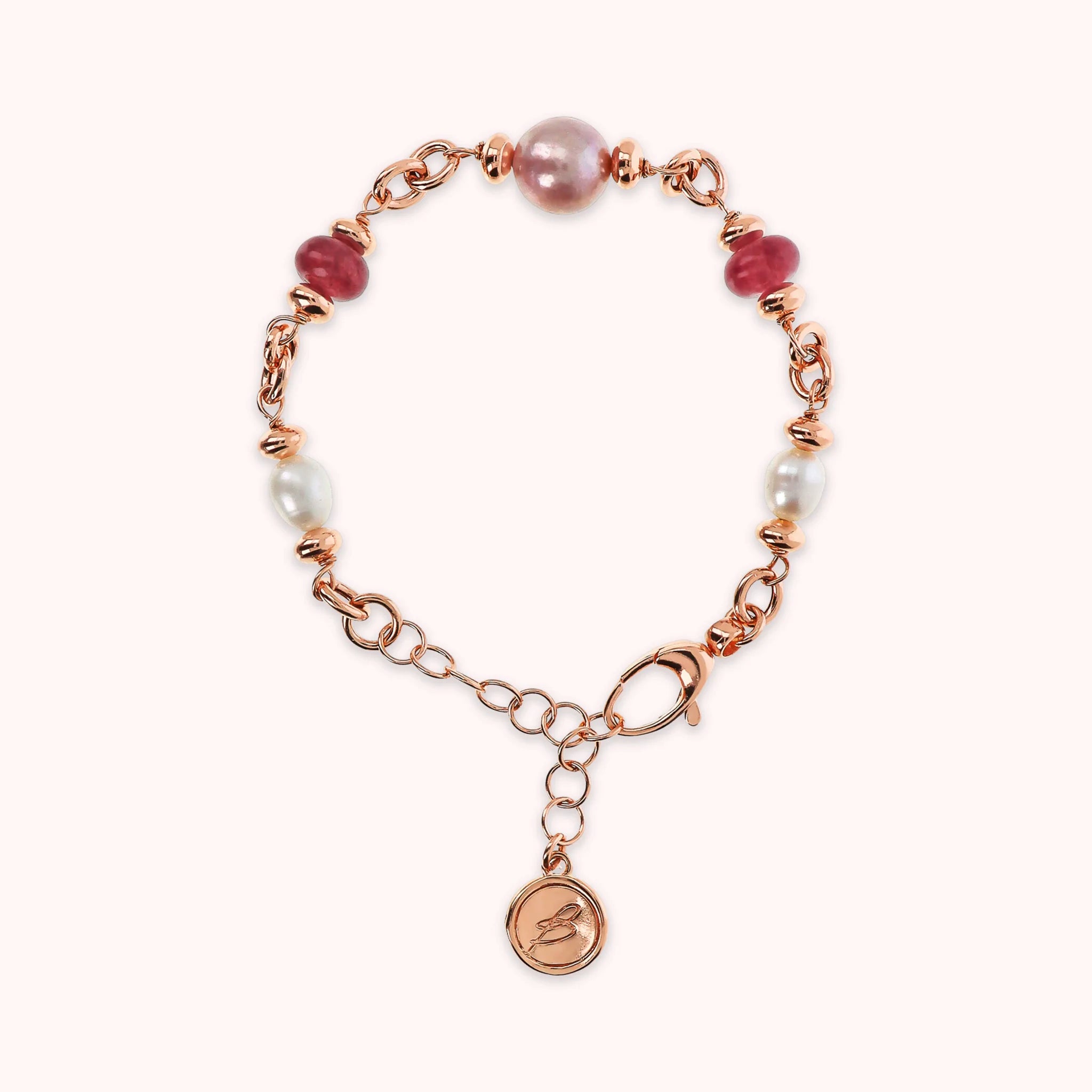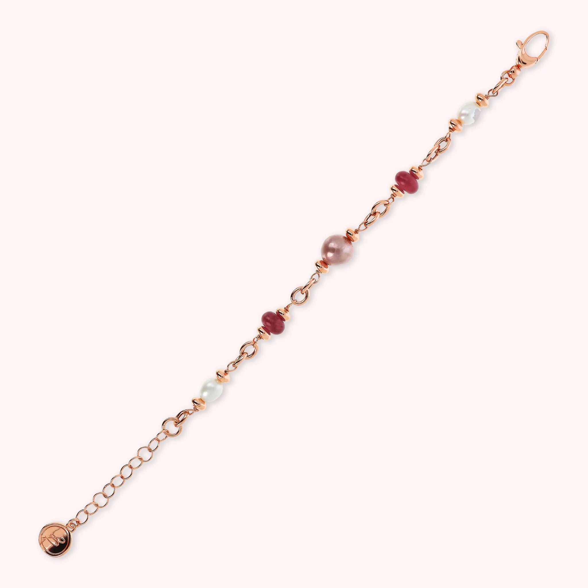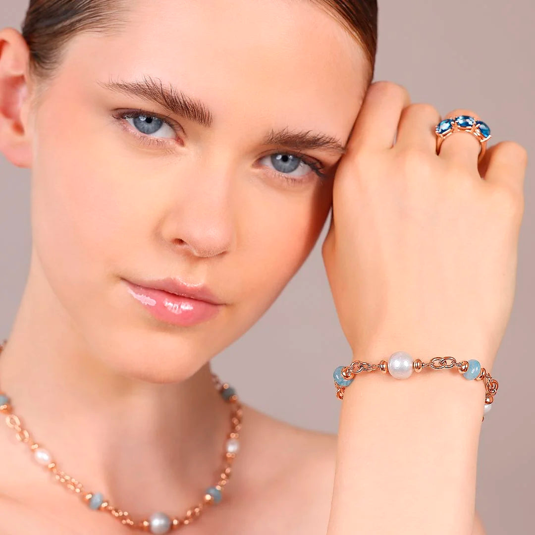 Bracelet Bronzallure en alliage Golden Rosé, plaqué or rose 18 carats, avec chaîne rolo ovale agrémentée de petites rondelles brillantes alternées avec des rondelles en pierre naturelle (8 mm) et des perles de culture d'eau douce de deux tailles différentes (6/7,5 mm et 9/11 mm) . Longueur 17+4 cm de rallonge. Fermoir mousqueton.