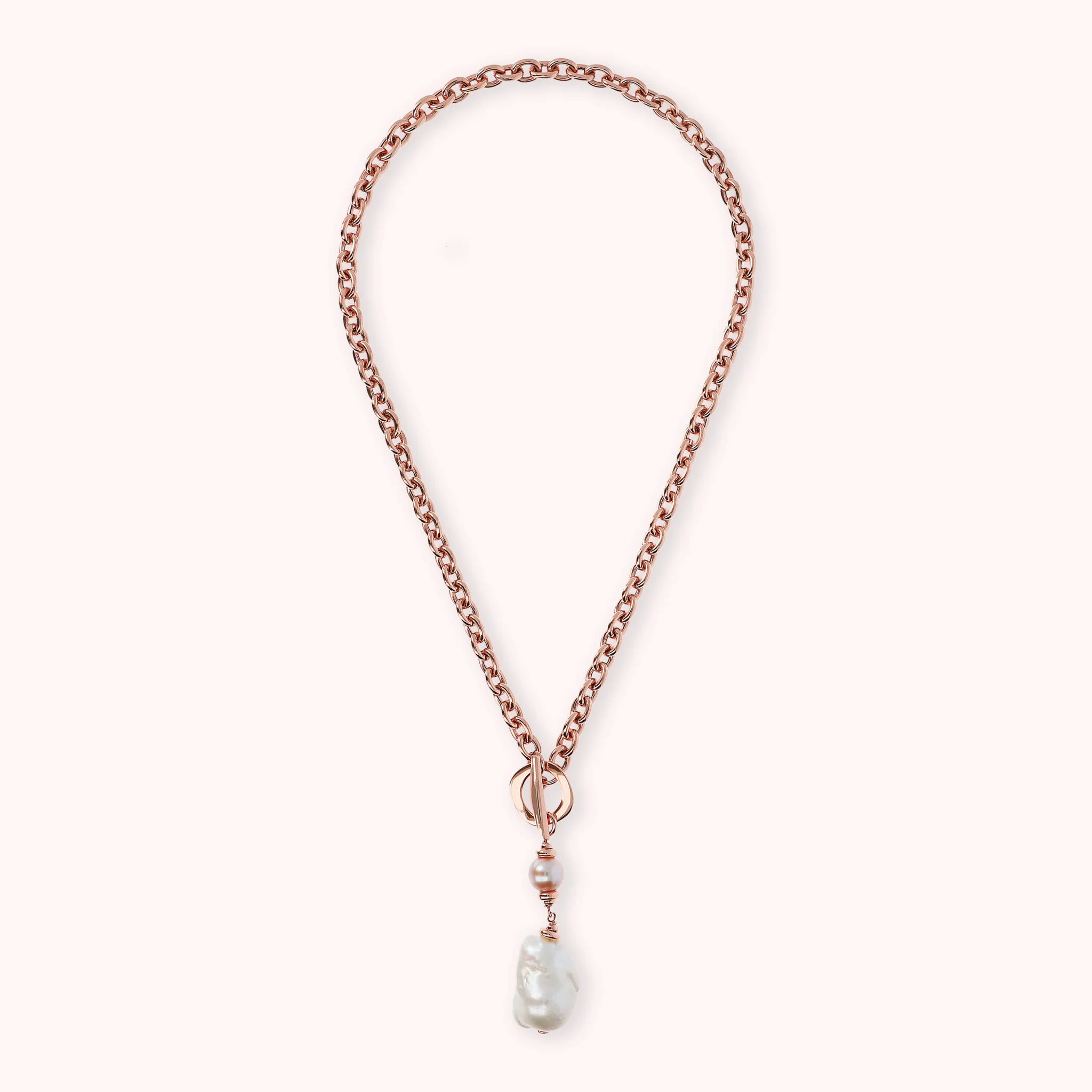 Collier cravate Bronzallure en alliage Golden Rosé, doré à l'or fin 18ct, avec chaîne rolo agrémentée de perles de culture d'eau douce : perle rose et perle scaramazza, fermoir T-Bar.