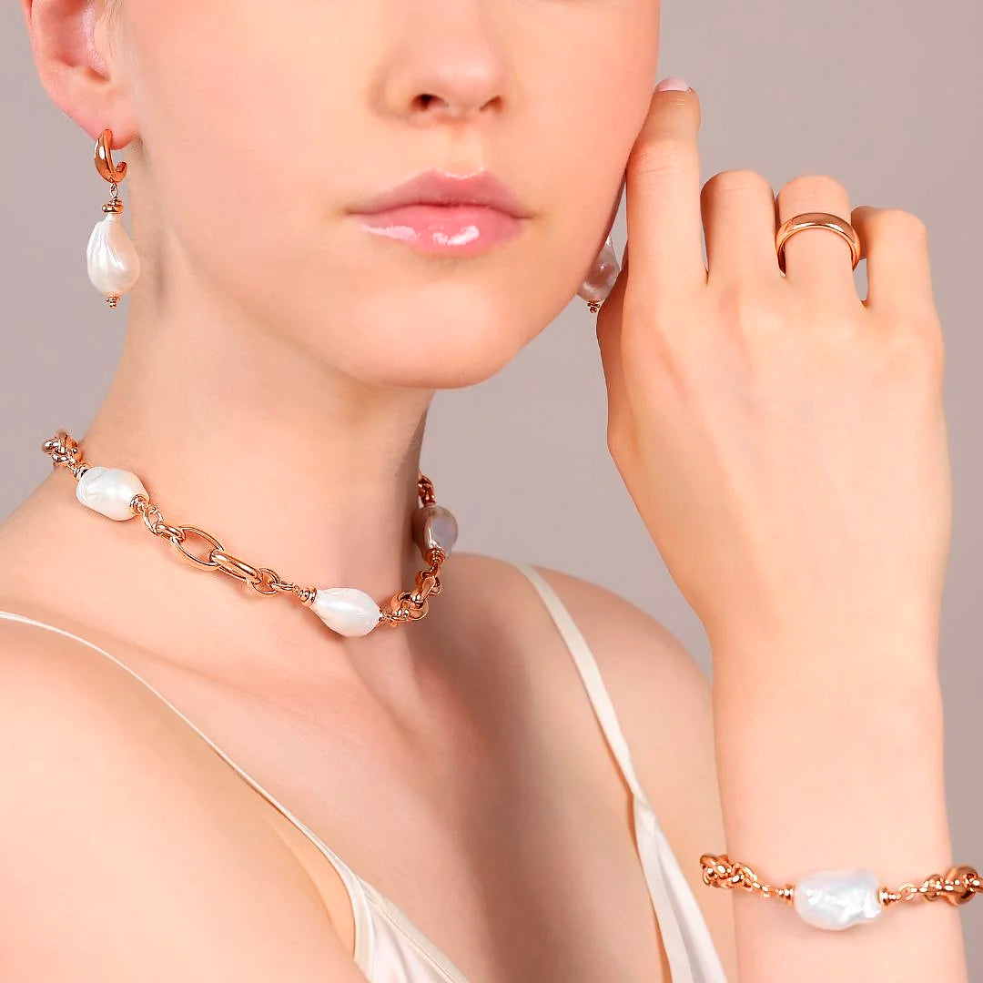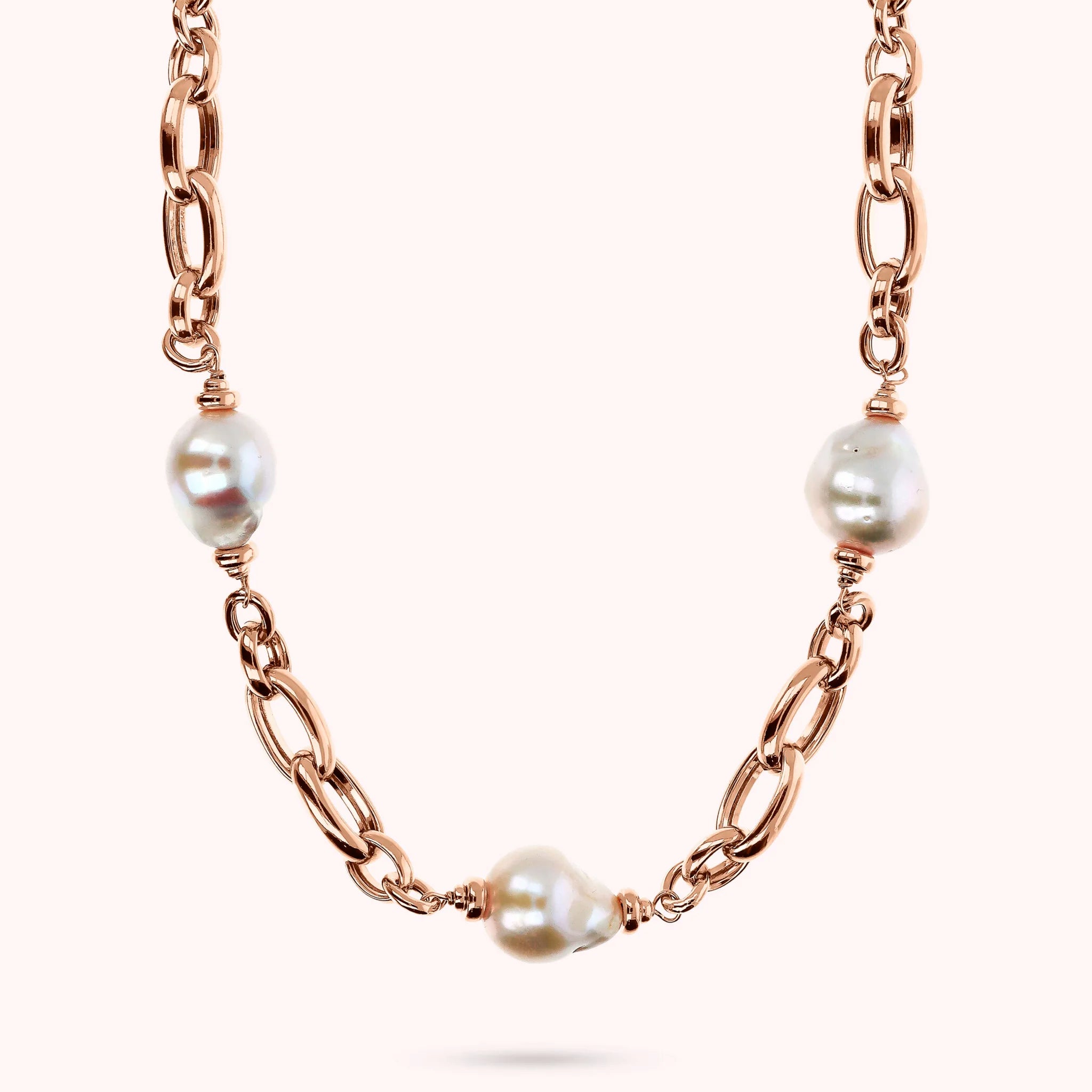 Collier ras de cou Bronzallure en alliage Golden Rosé, plaqué or rose 18 carats, avec chaîne rolo agrémentée de stations de maillons ovales entrelacés (16x10 mm) alternés de trois perles de culture d'eau douce blanches baroques d'un diamètre d'environ 13/14 mm. Longueur 40+extension 4,5 cm. Fermoir mousqueton.