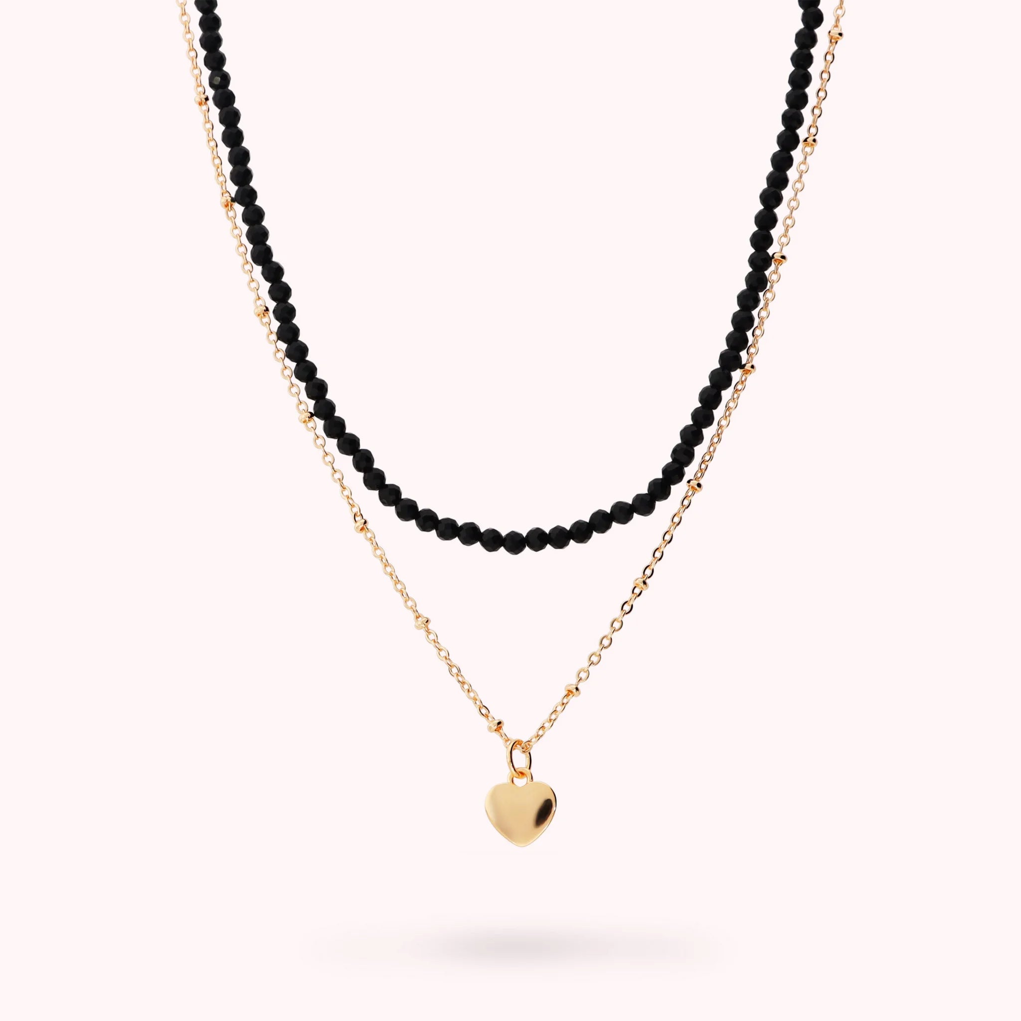 Un doppio filo di luce e colore: pietre naturali sfaccettate che avvolgono il collo con delicatezza, mentre un cuore lucido scivola lungo la maglia creando un equilibrio romantico e leggero.