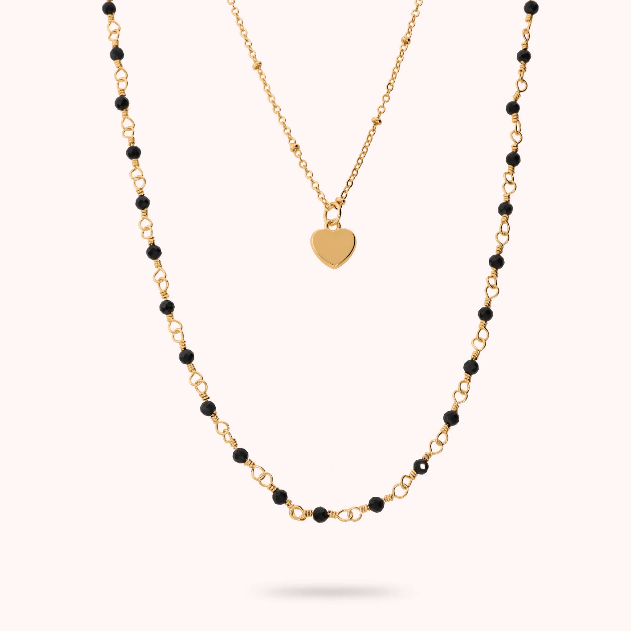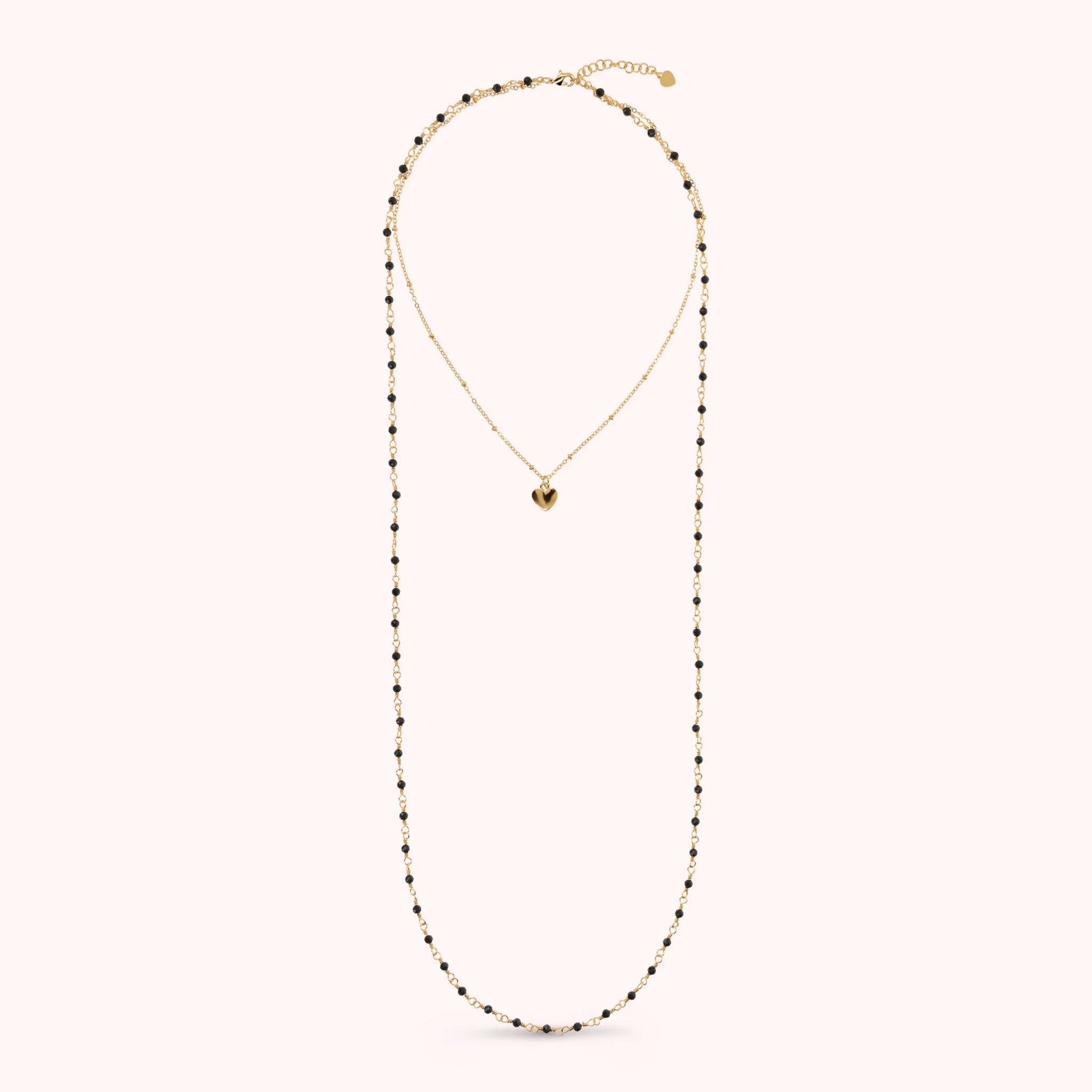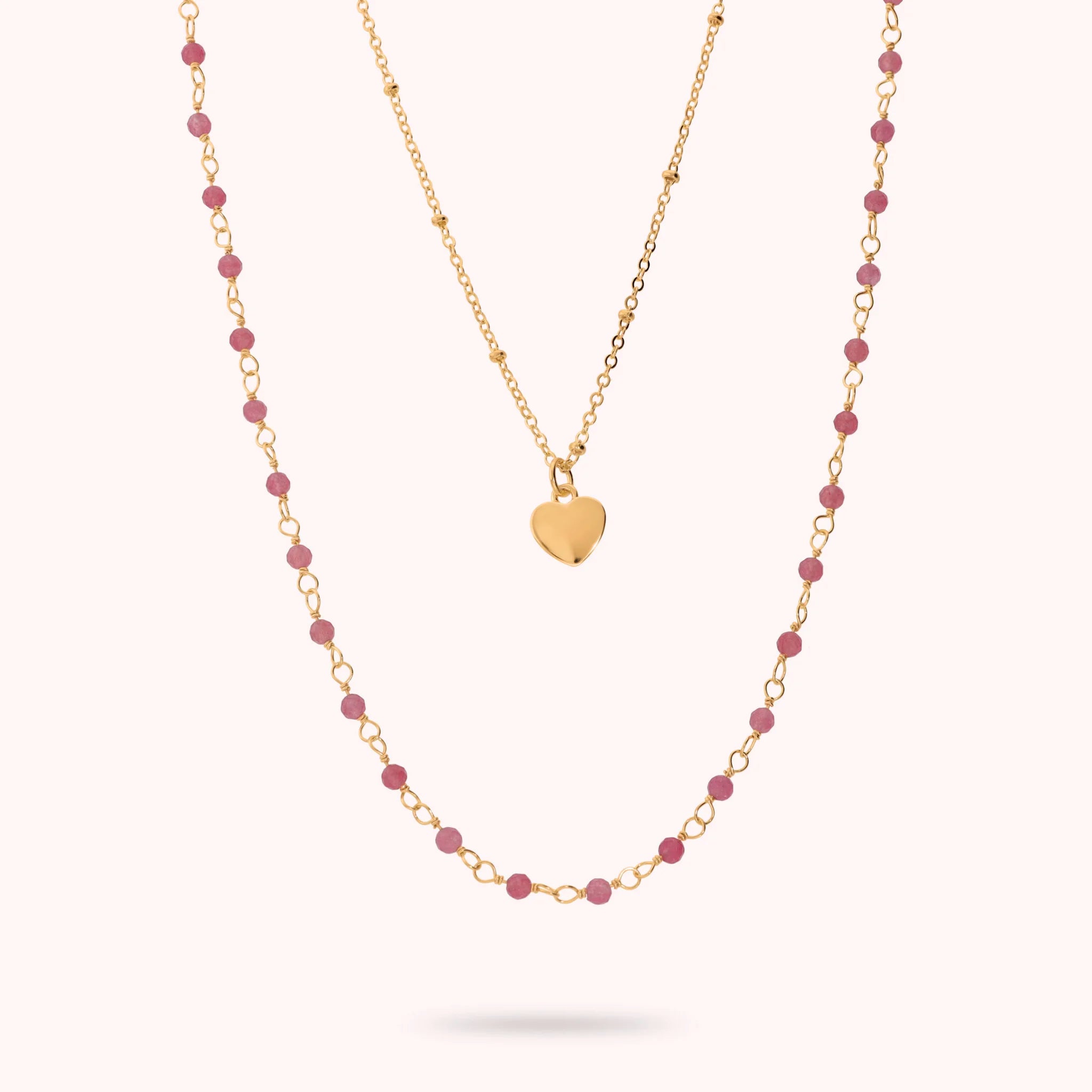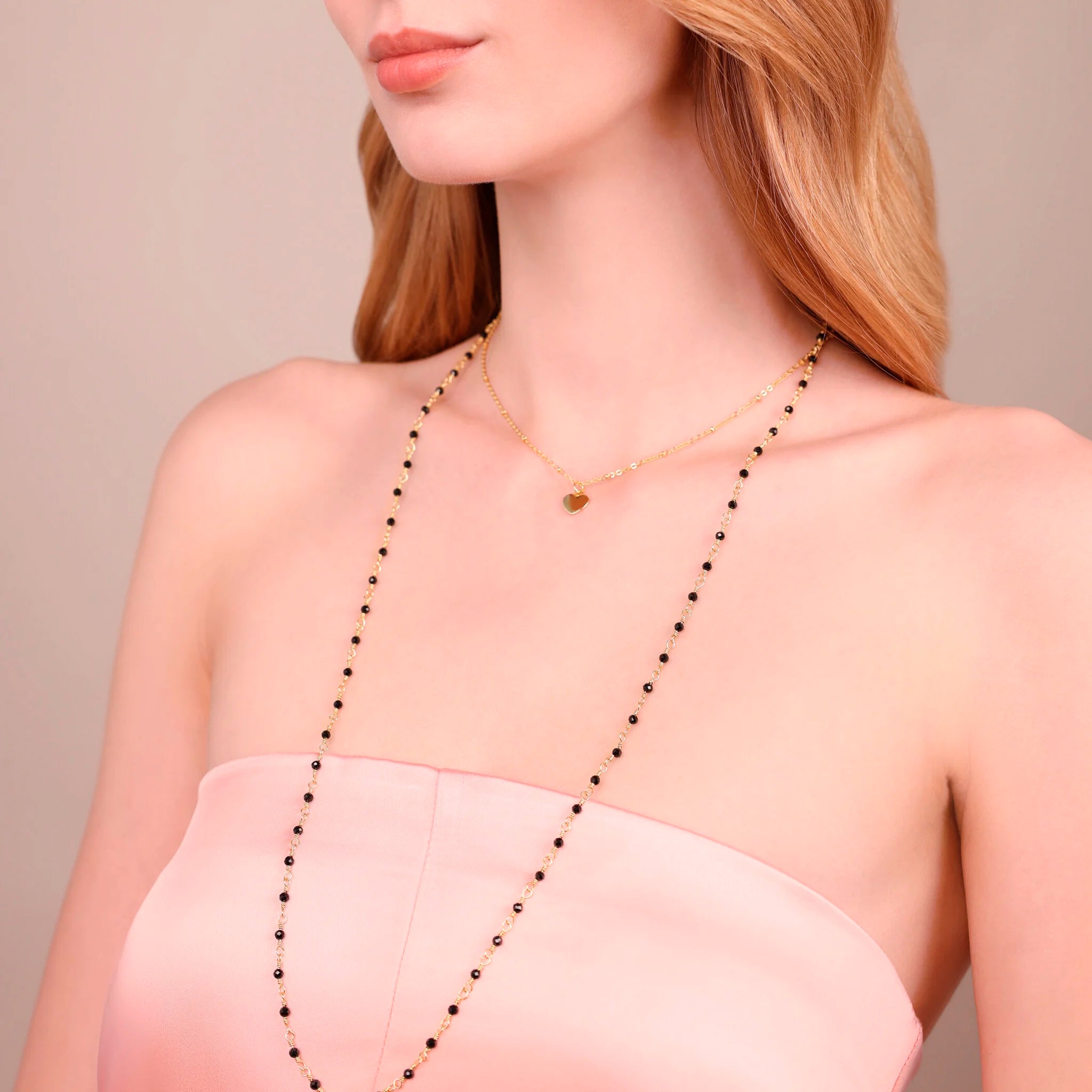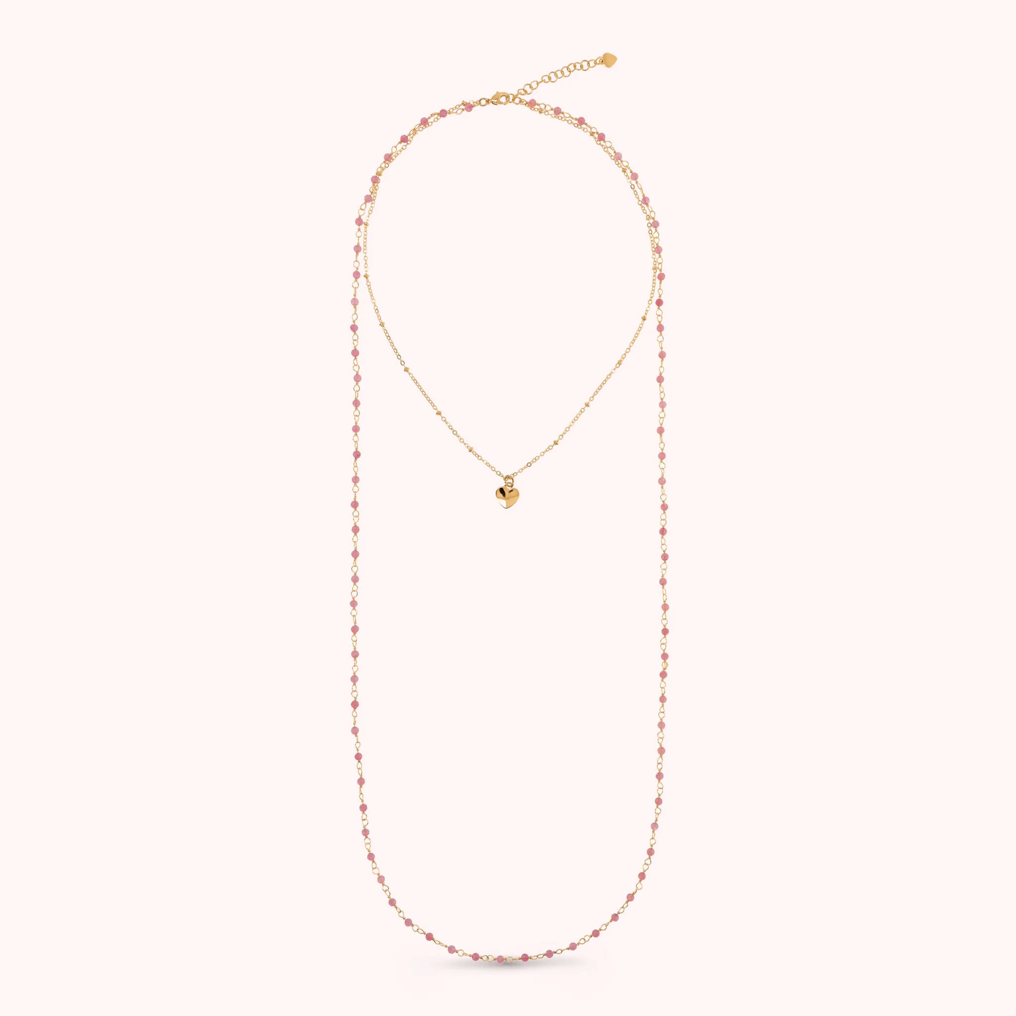 Collier long double rang Bronzallure réalisé en alliage Golden Rosé, plaqué or jaune 18kt, composé d'une chaîne ras-du-cou rolo (39cm) avec rondelles et pendentif cœur brillant et d'une chaîne chapelet avec pierres naturelles facettées de quartzite (3 mm). Fermoir mousqueton.