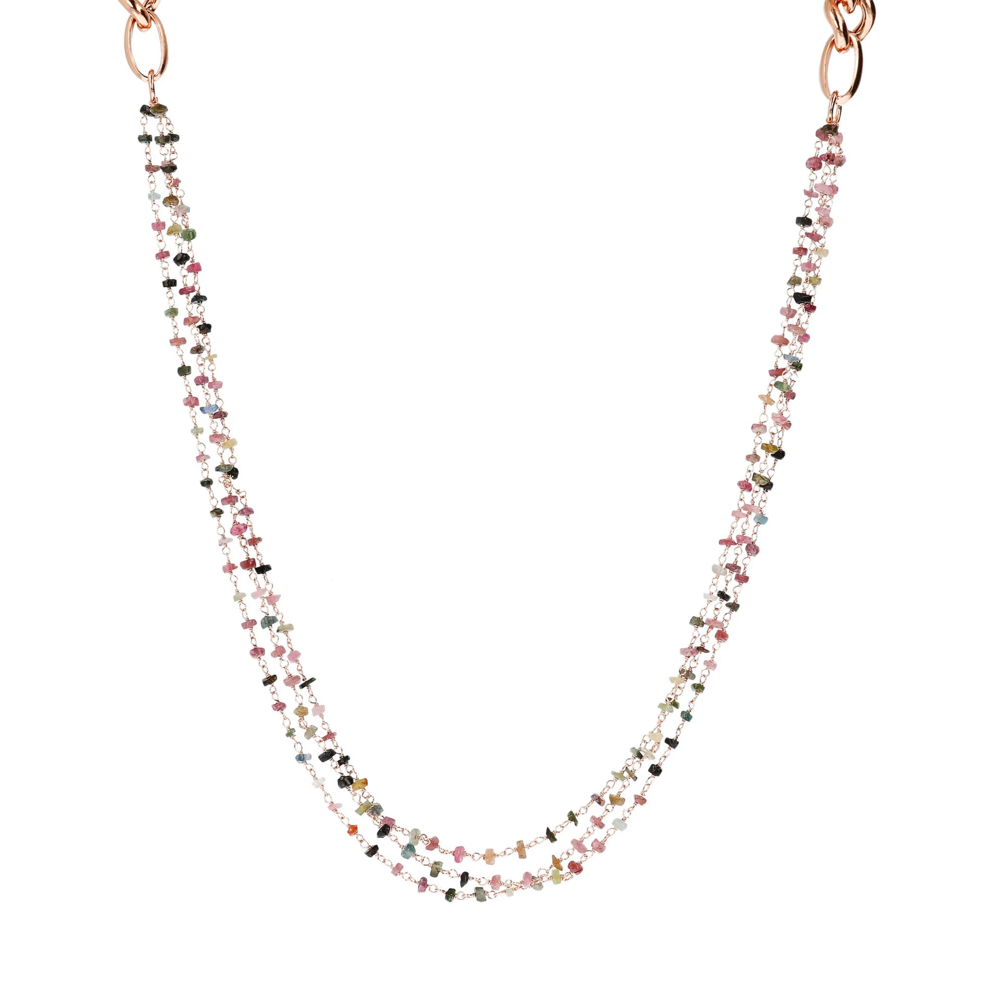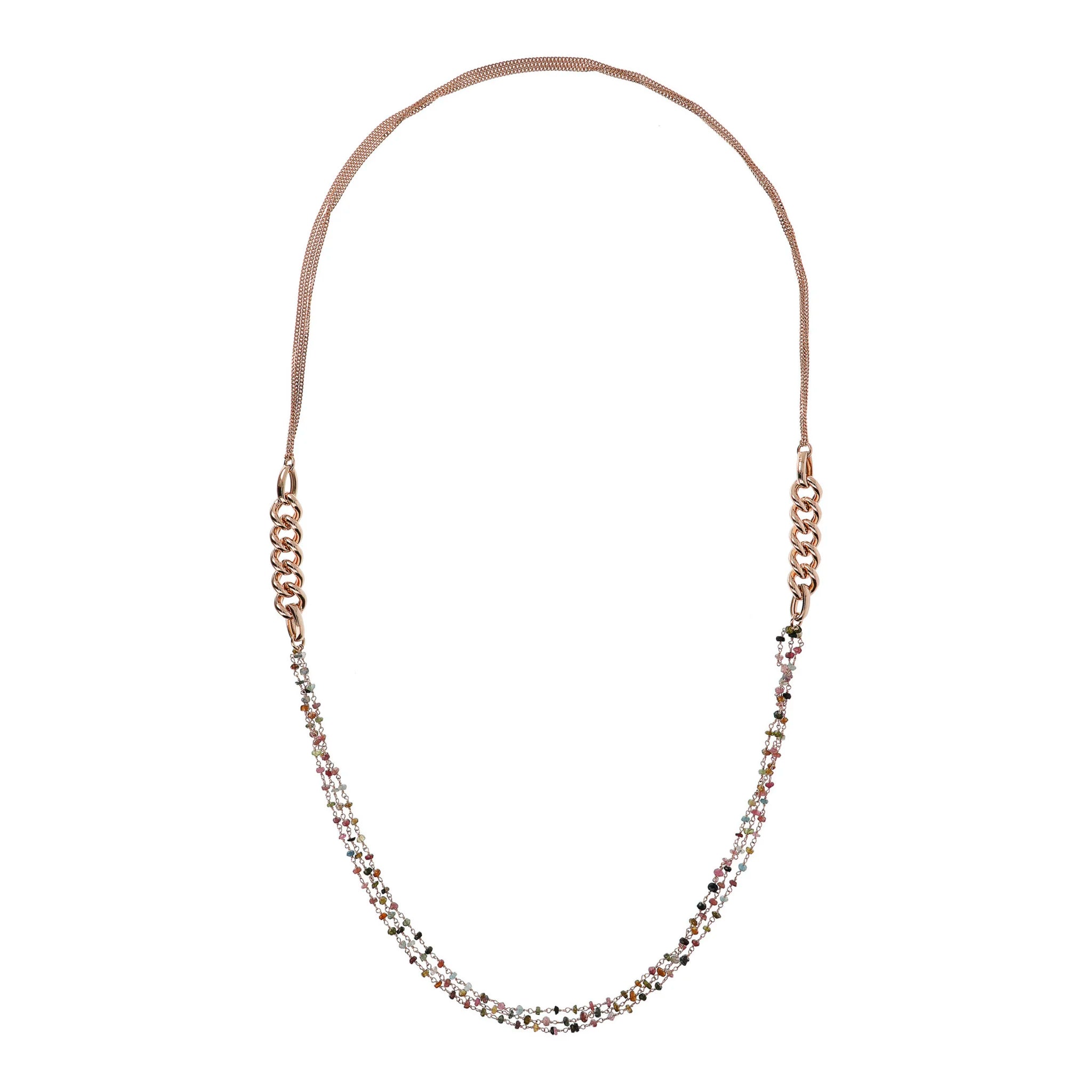 Sautoir Bronzallure en alliage Golden Rosé, doré à l'or fin 18ct, la partie supérieure est composée de trois rangs de gourmette fine, la partie inférieure est composée de trois chaînes de chapelet avec des pierres naturelles. Sur les côtés, il y a des éléments de gourmette en Golden Rosé.