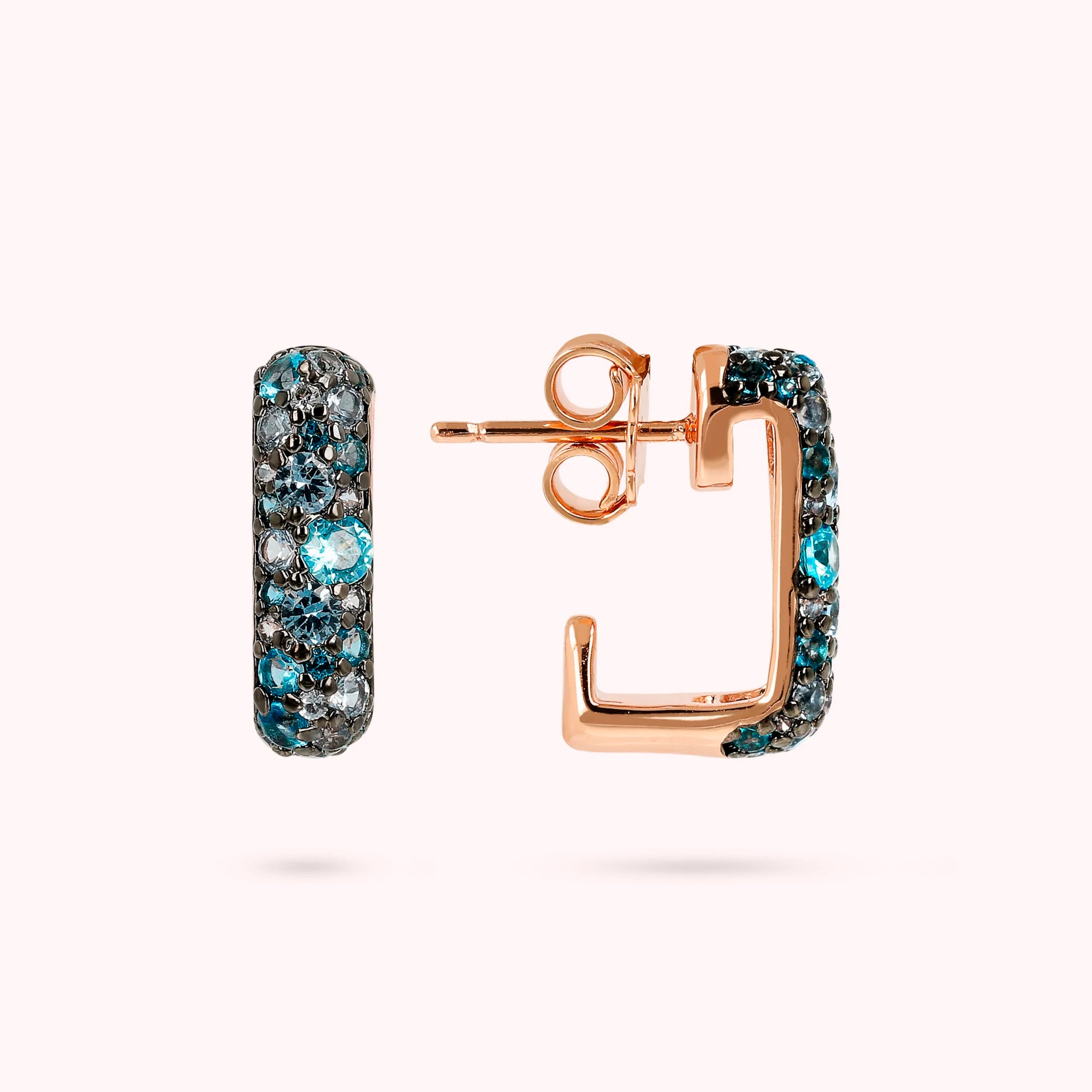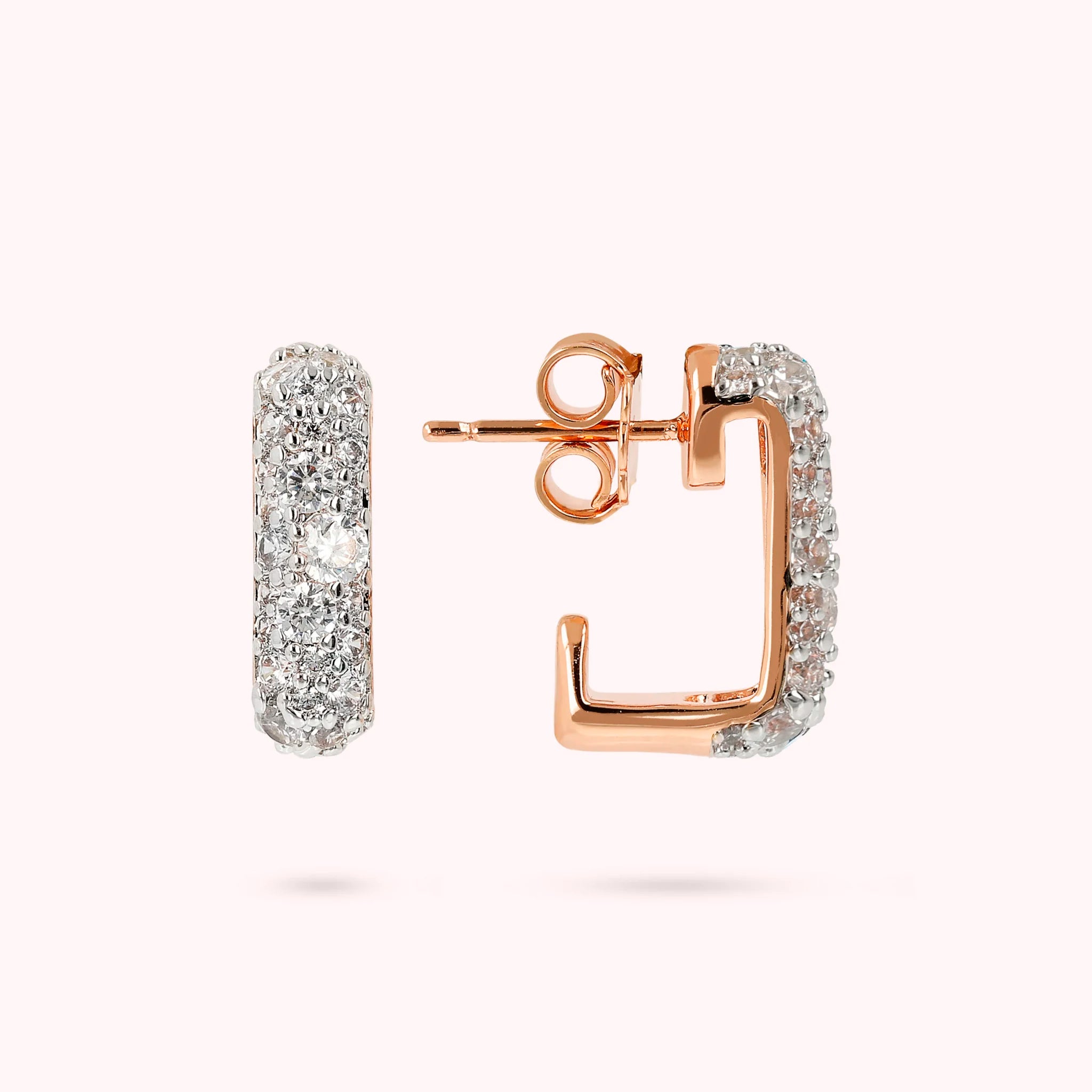 Boucles d'oreilles pavées Bronzallure, de forme carrée, réalisées sur une base Golden Rosé, doré à l'or fin 18ct, ornées de zircons cubiques, qualité lumineuse ; fermeture clou et papillon.