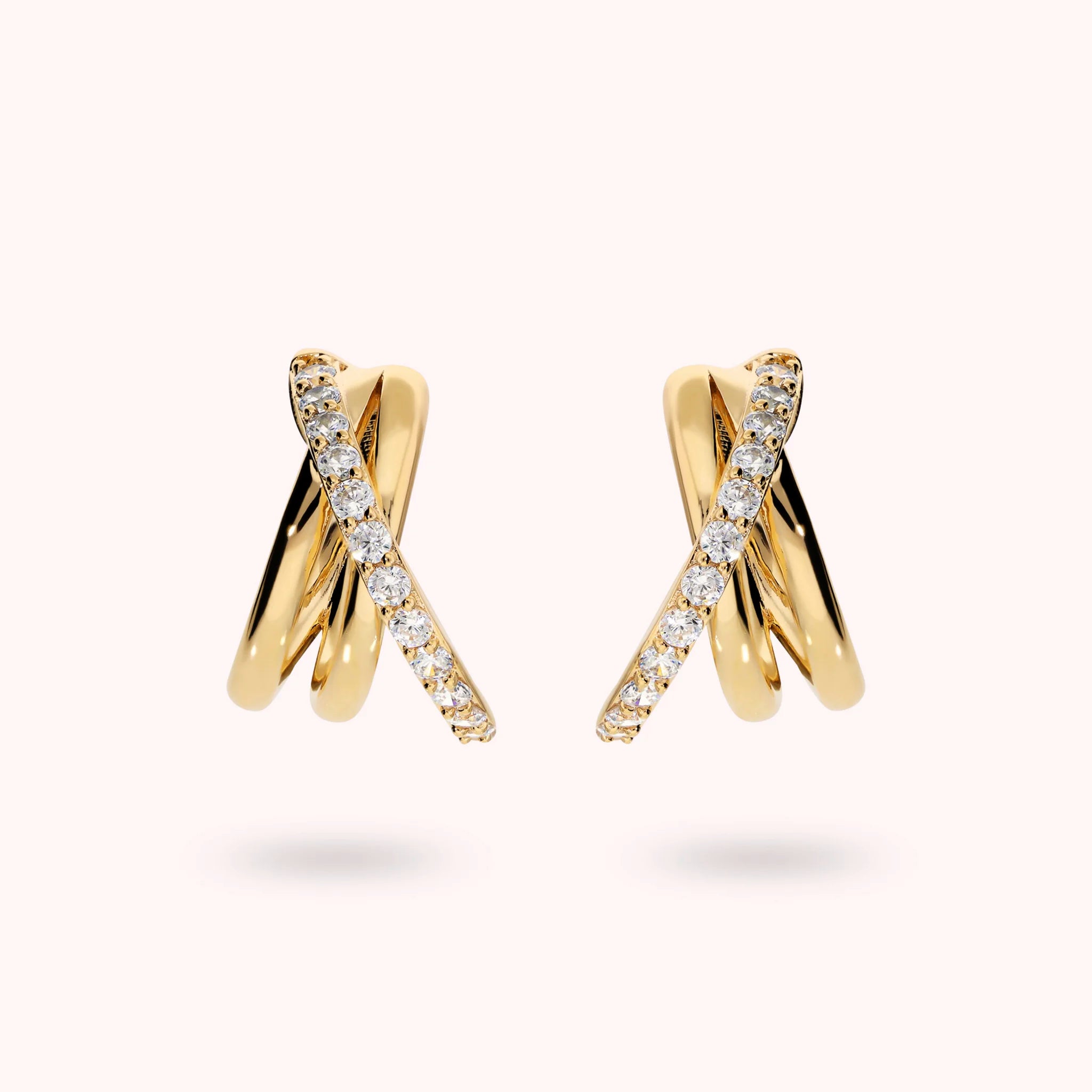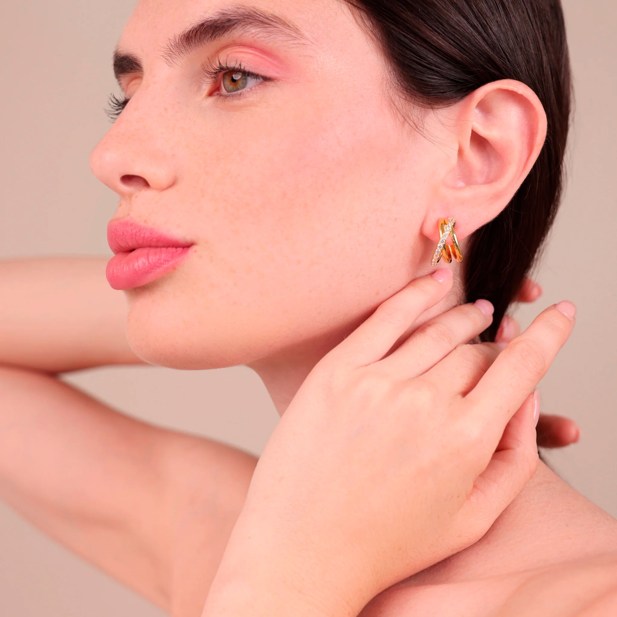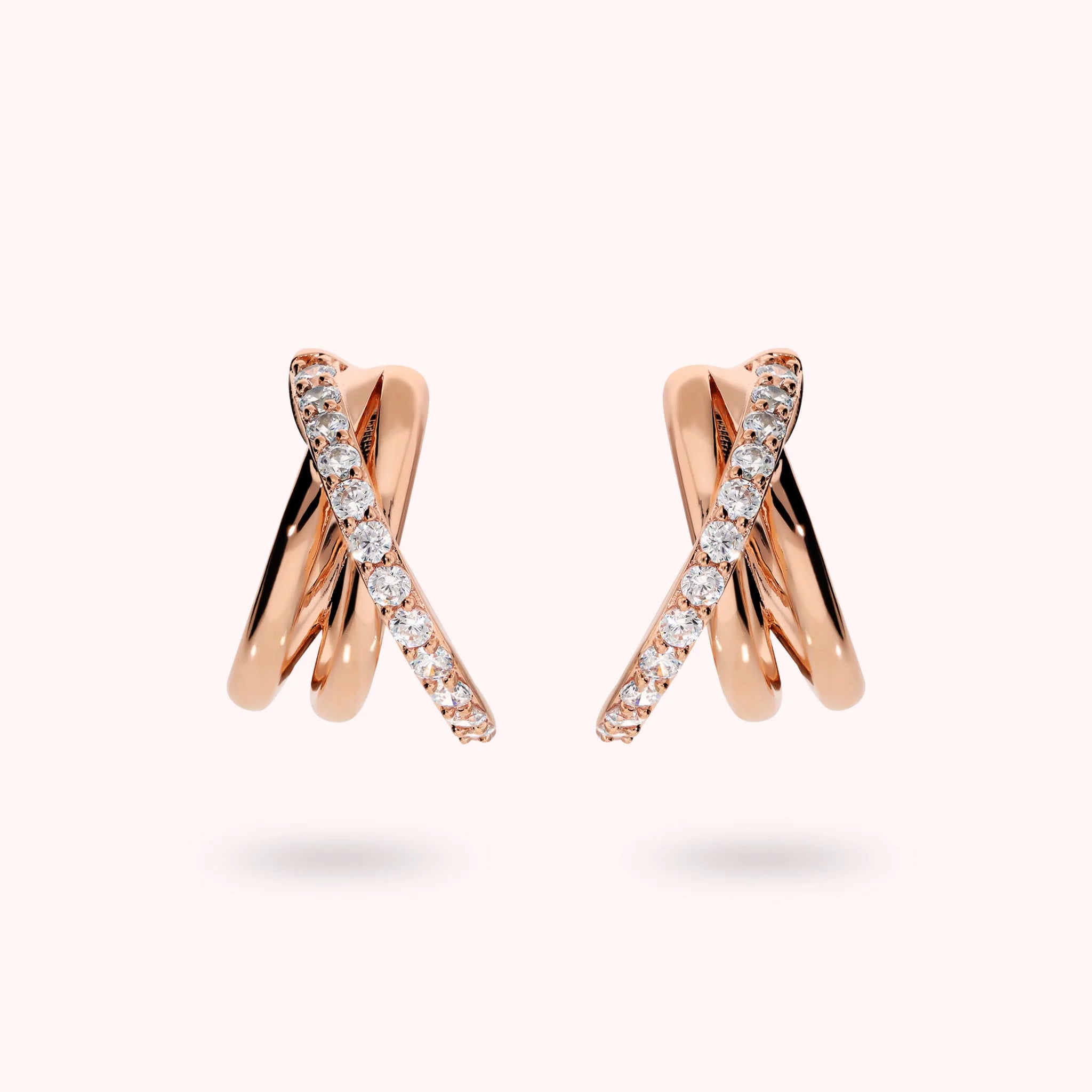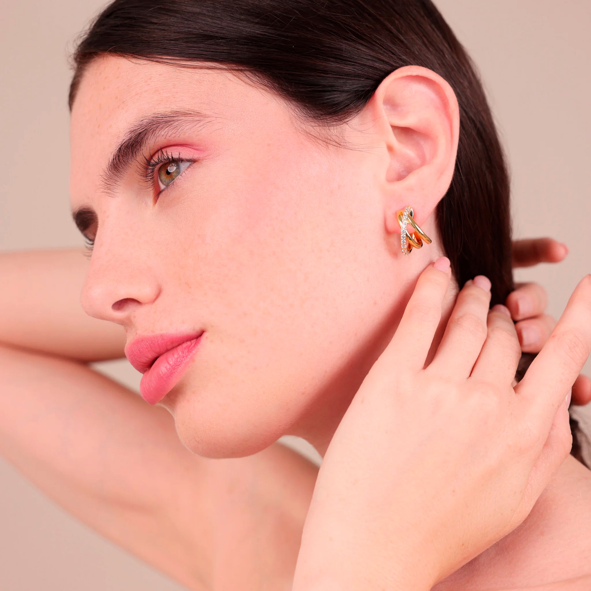 L’intreccio diventa simbolo di eleganza e armonia. Gli zirconi catturano la luce con sfumature preziose, donando al viso una brillantezza sofisticata e senza tempo.
