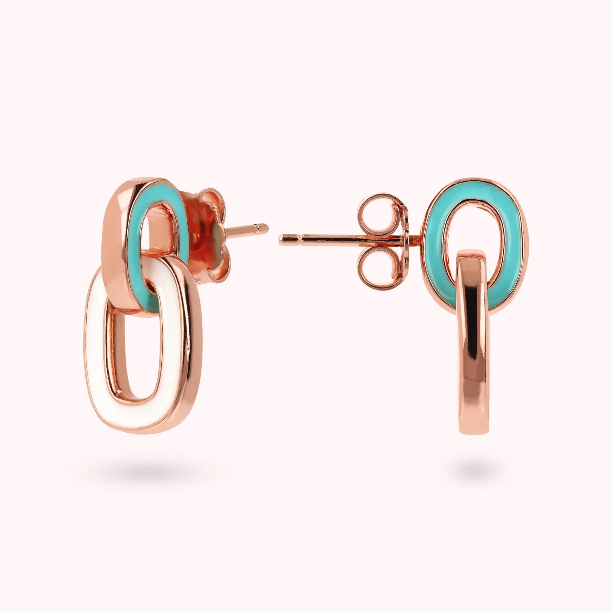 Boucles d'oreilles pendantes Bronzallure en alliage Golden Rosé doré à l'or fin 18ct agrémentées de deux maillons bicolores concaténés de forme ovale (11x9 mm) et rectangulaire (14,5x10,5 mm) avec une surface émaillée; fermoir papillon.