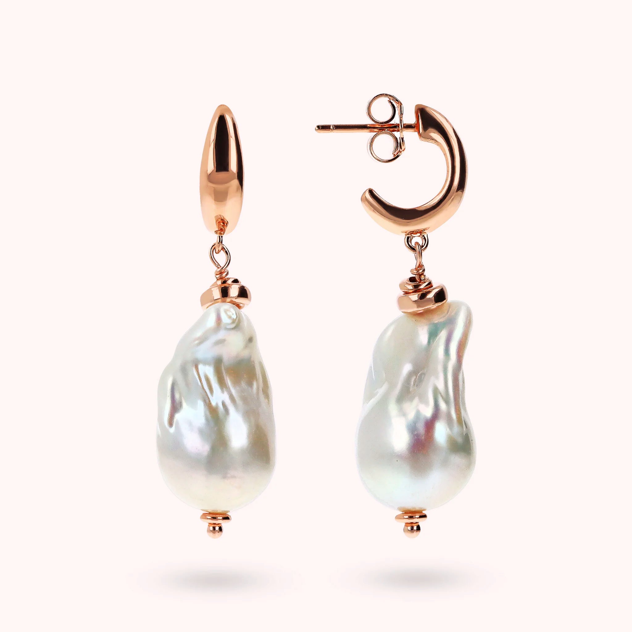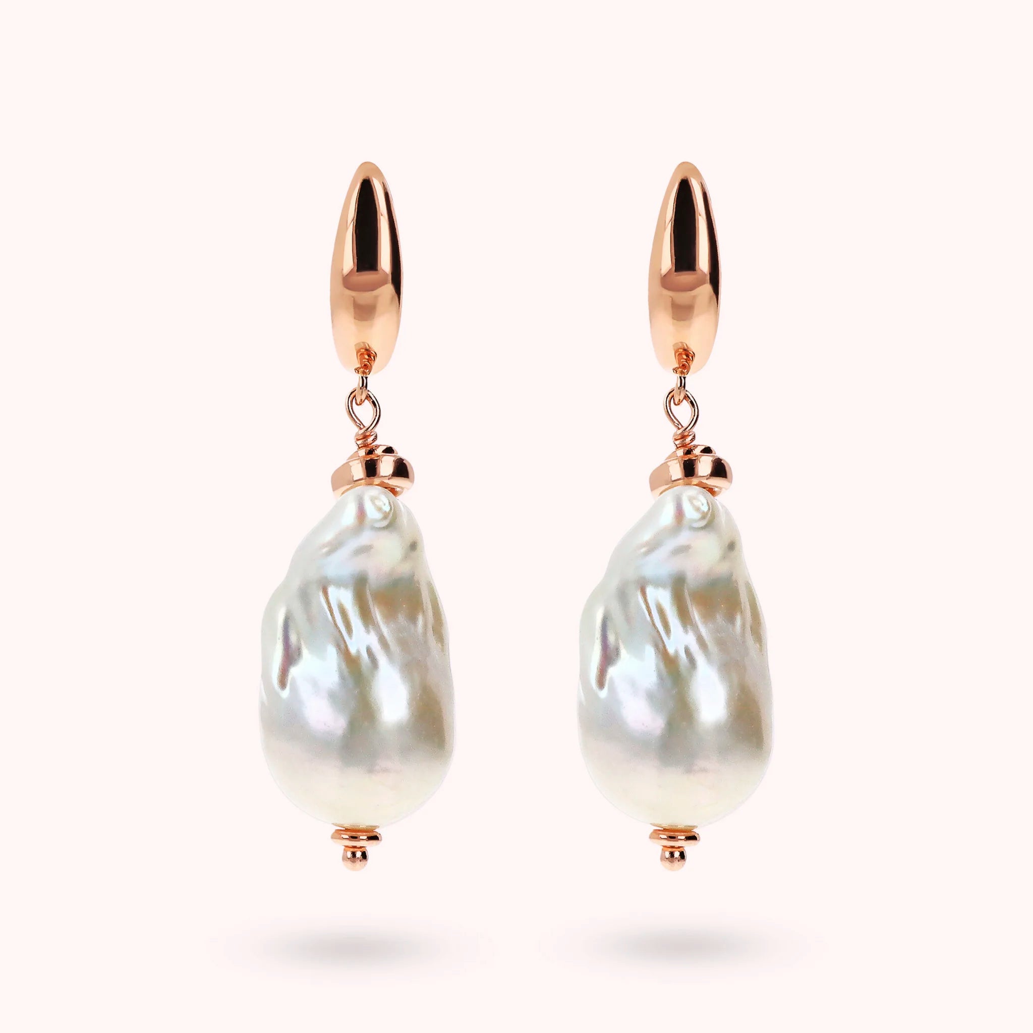 Boucles d'oreilles pendantes Bronzallure en alliage Golden Rosé, plaqué or rose 18 carats, avec dessus en forme de larme et perles de culture d'eau douce baroques blanches d'un diamètre d'environ 13/14 mm. Fermeture épingle et papillon.