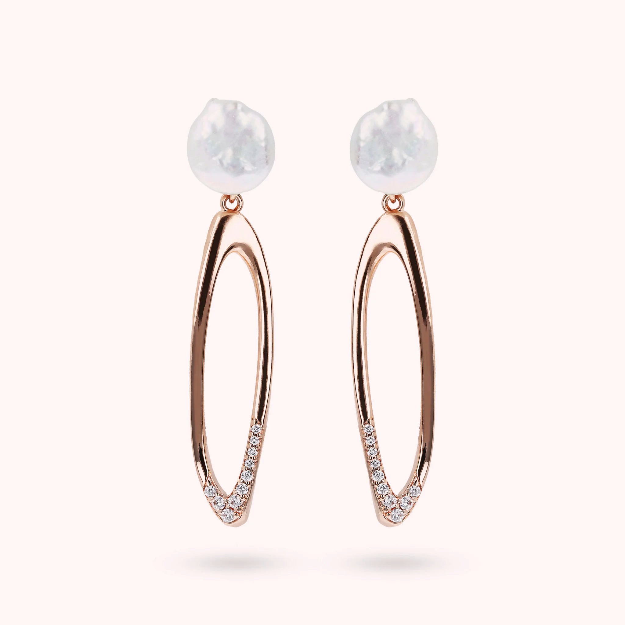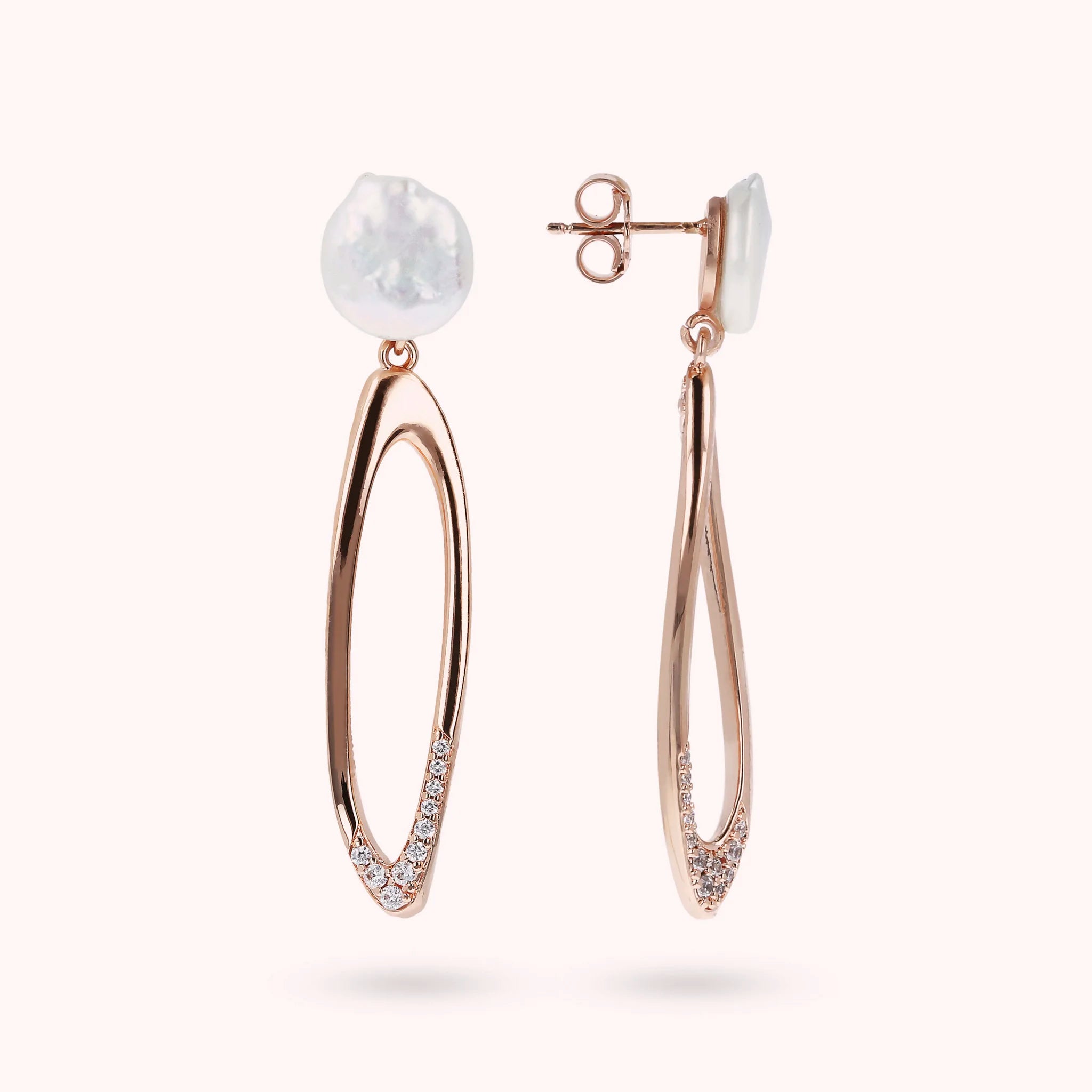 Boucles d'oreilles pendantes Bronzallure en alliage Golden Rosé, doré à l'or fin 18ct, composées d'une partie supérieure en perle de culture d'eau douce blanche Coin (environ 10 mm) et d'un pendentif ovale orné de zircons cubiques lumineux. La boucle d'oreille a un fermoir tige et papillon de 5,4 cm de long.