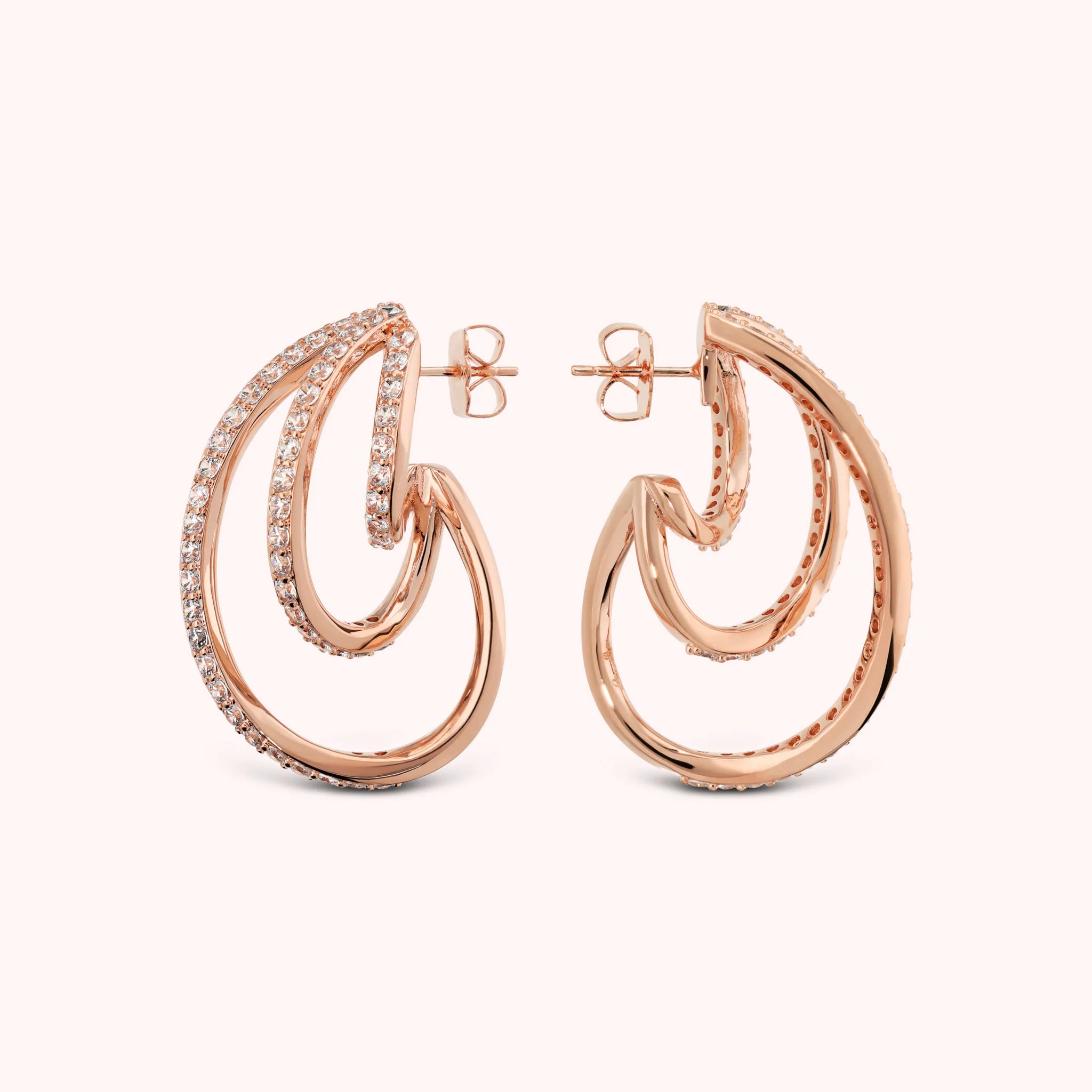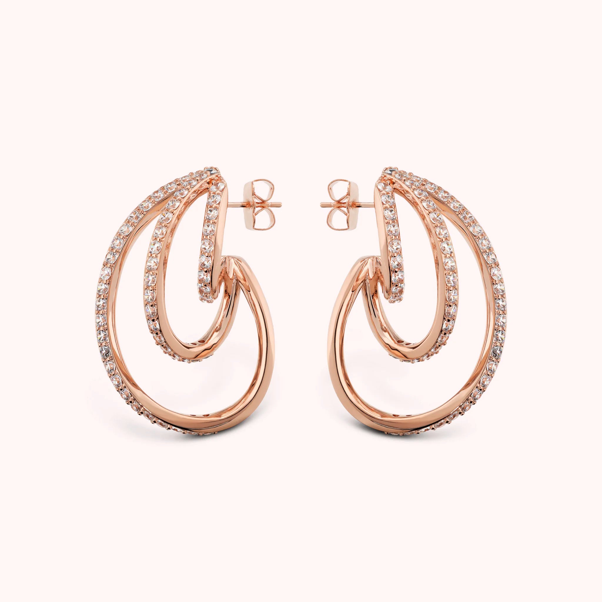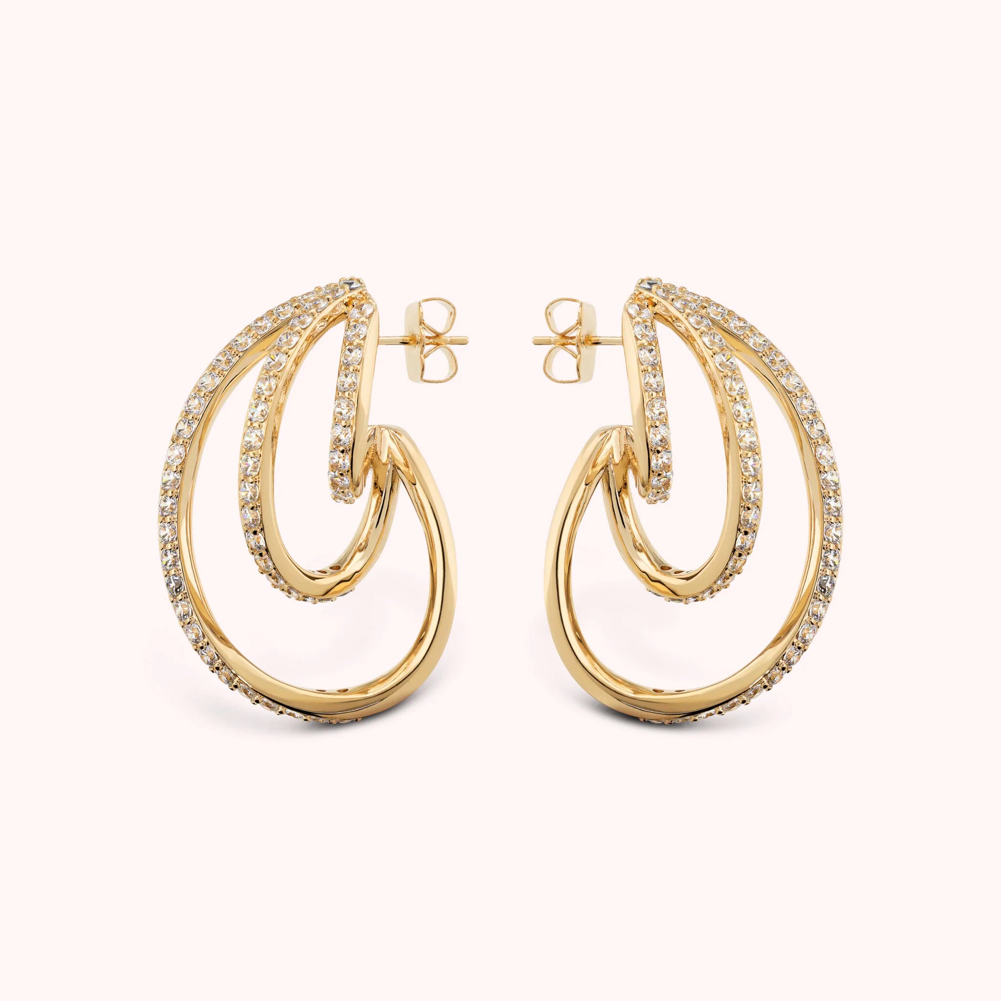 Orecchini che avvolgono il viso con linee sinuose e riflessi caldi, impreziositi da cristalli che catturano ogni sguardo. Un tocco di eleganza dorata, pensato per brillare in ogni momento.