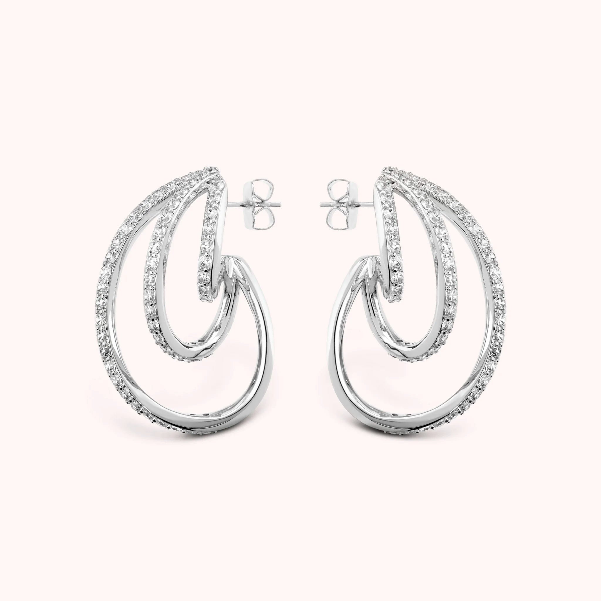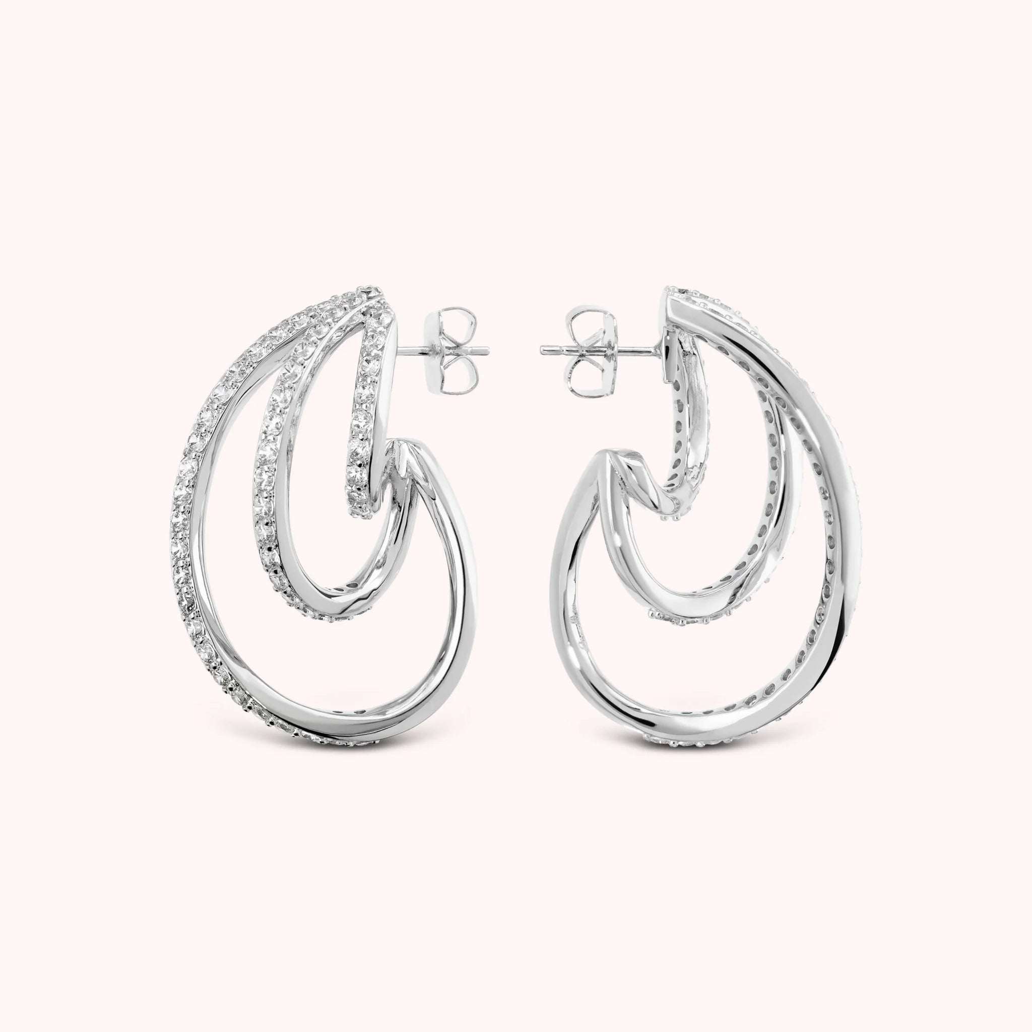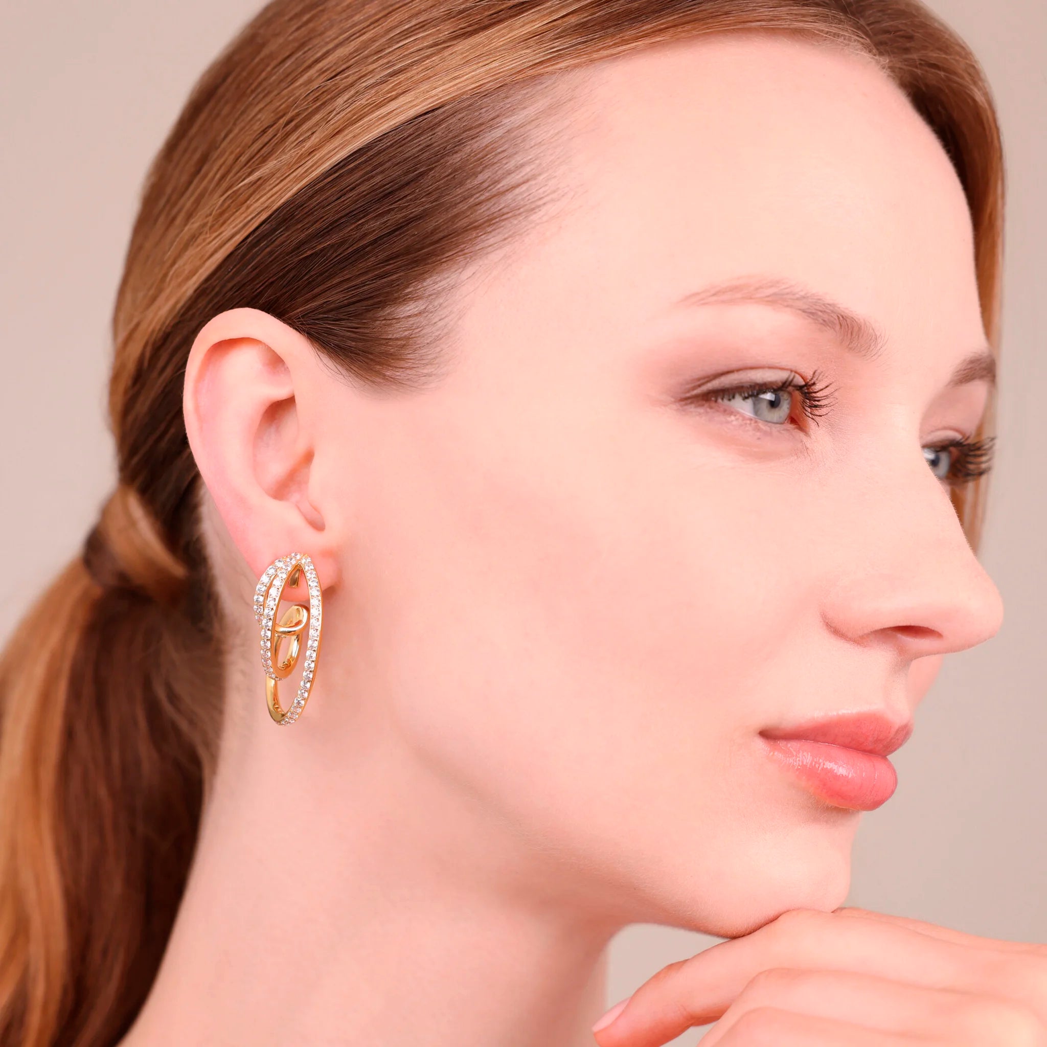 Orecchini che avvolgono il viso con linee sinuose e riflessi caldi, impreziositi da cristalli che catturano ogni sguardo. Un tocco di eleganza dorata, pensato per brillare in ogni momento.