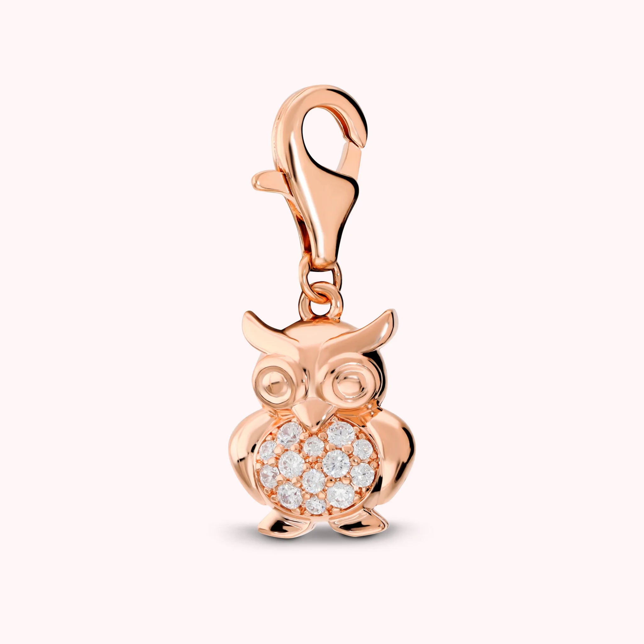 Pendentif hibou Bronzallure réalisé en alliage Golden Rosé, plaqué or 18 carats, avec pavé de zircone cubique, qualité éclatante. Équipé d’un mousqueton. Compatible avec le bracelet à breloques à maillons alternés.