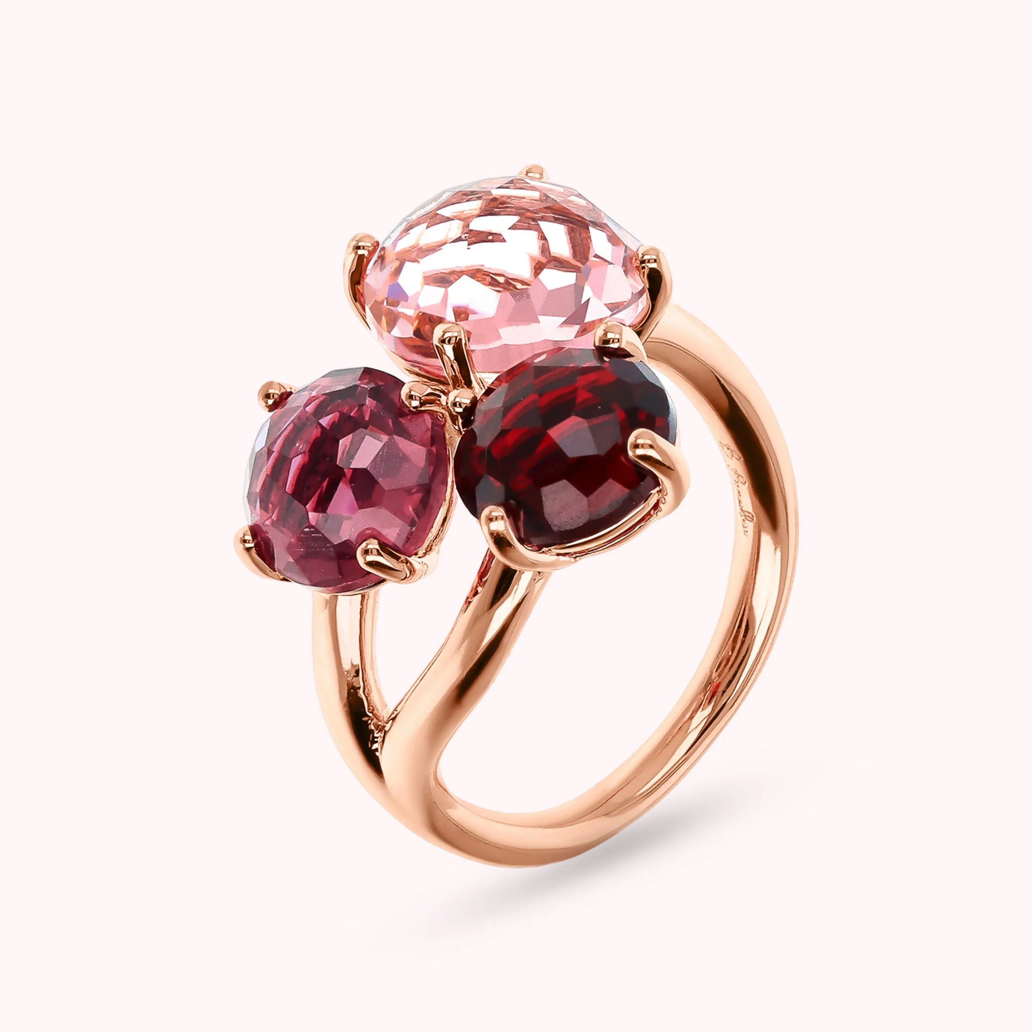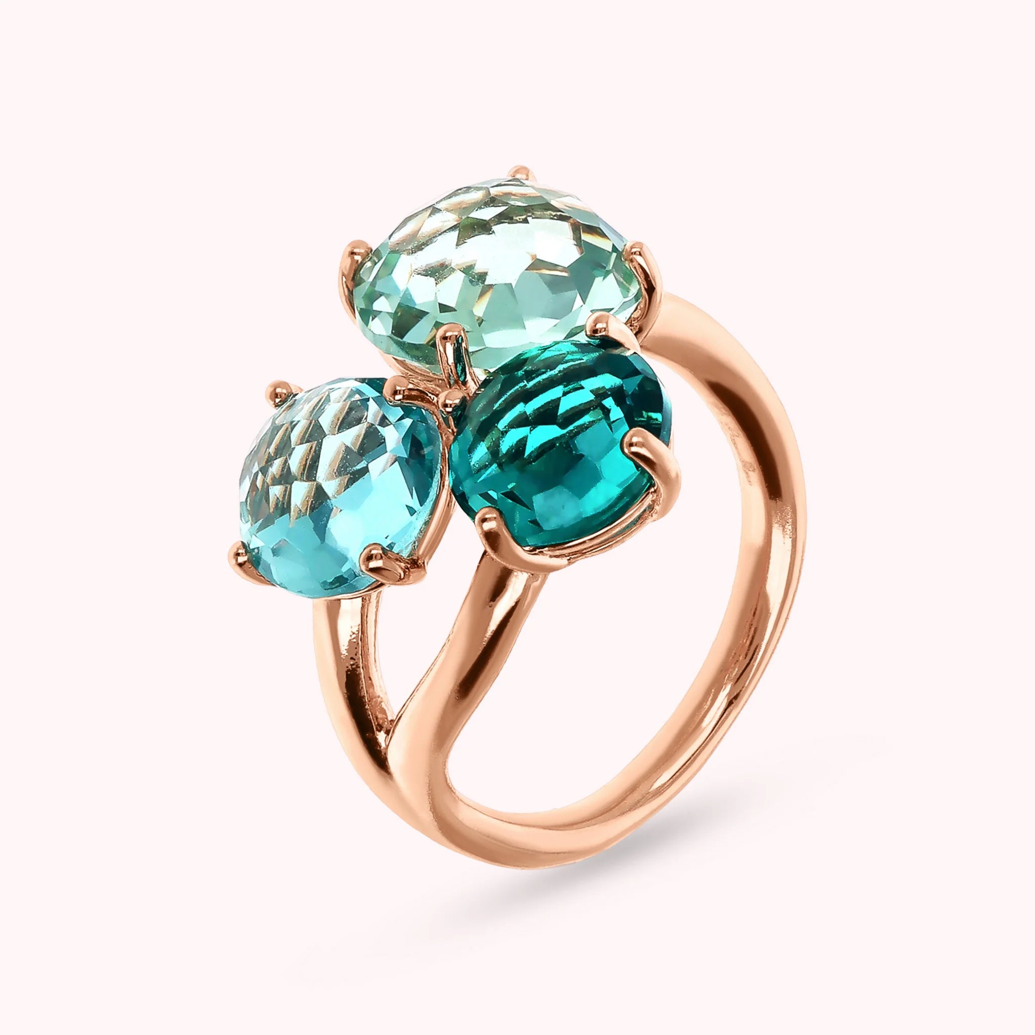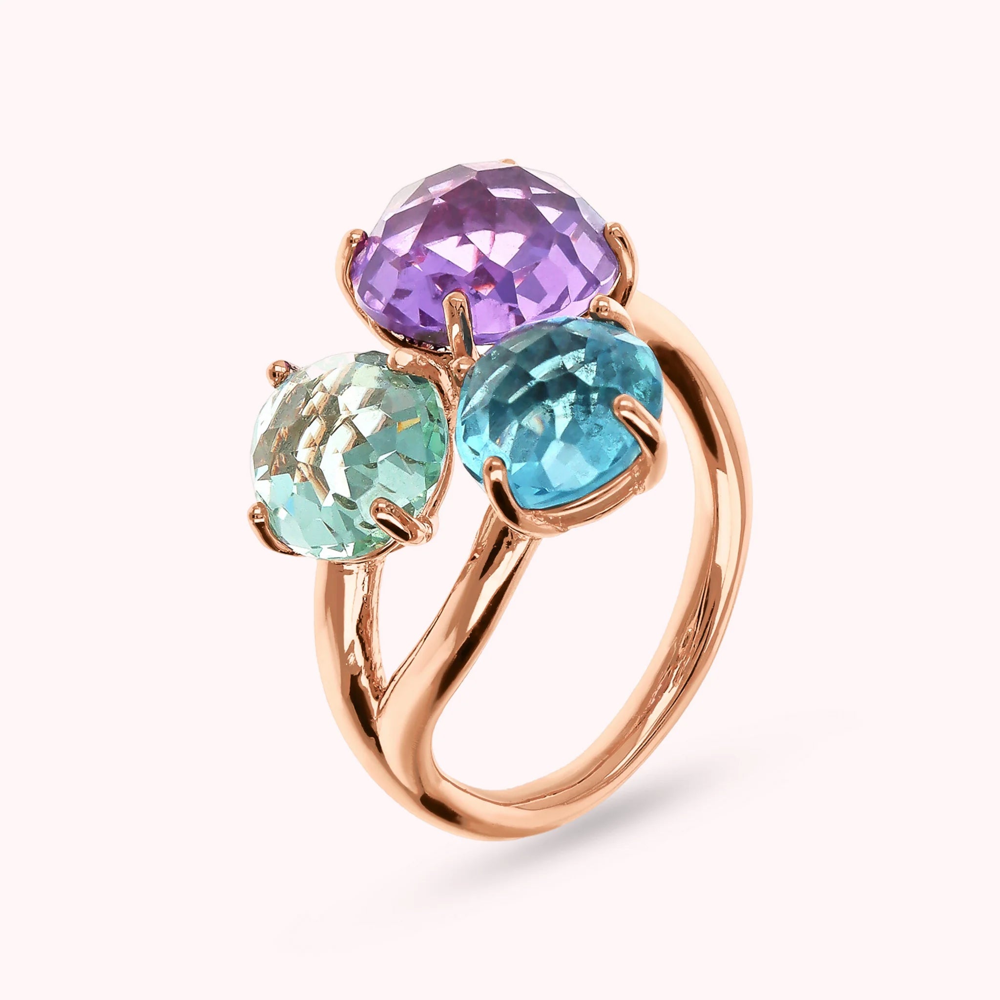 Bague trilogie Bronzallure en alliage Golden Rosé, plaqué or rose 18 carats, ornée de trois pierres gemmes rondes prismes (8/10 mm) taillées en mosaïque.