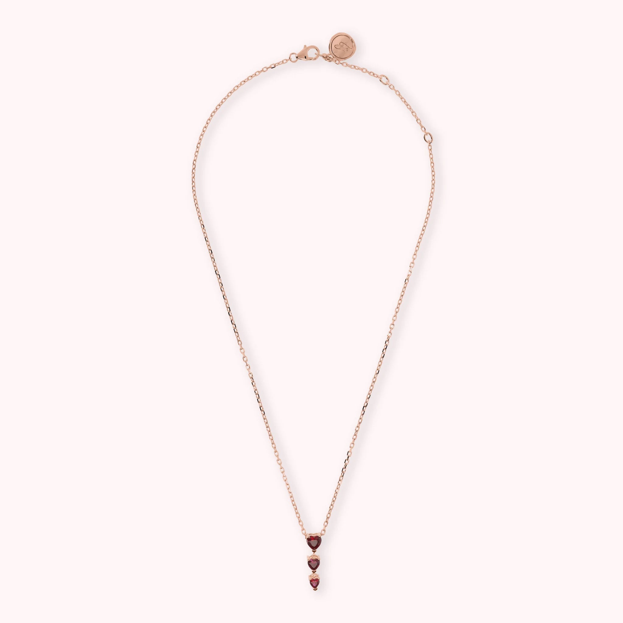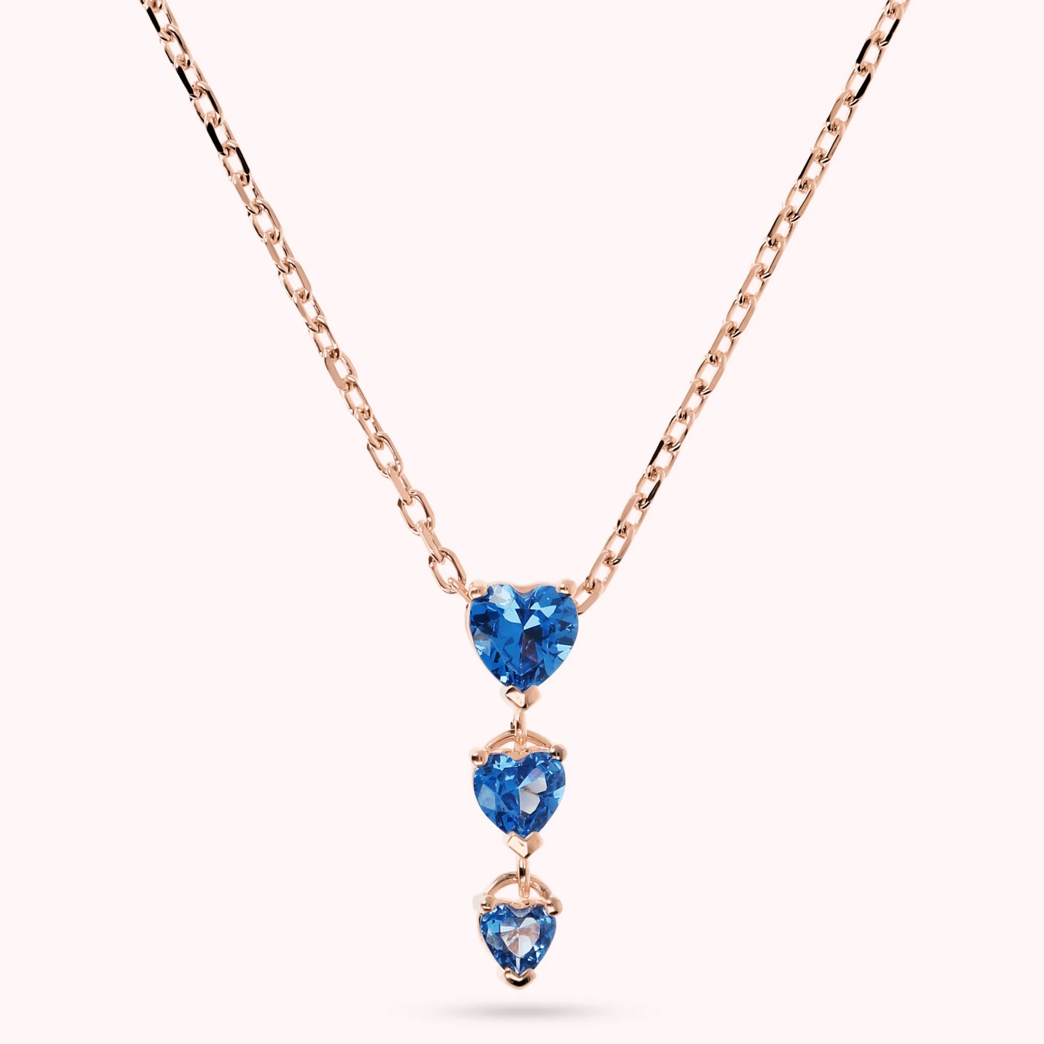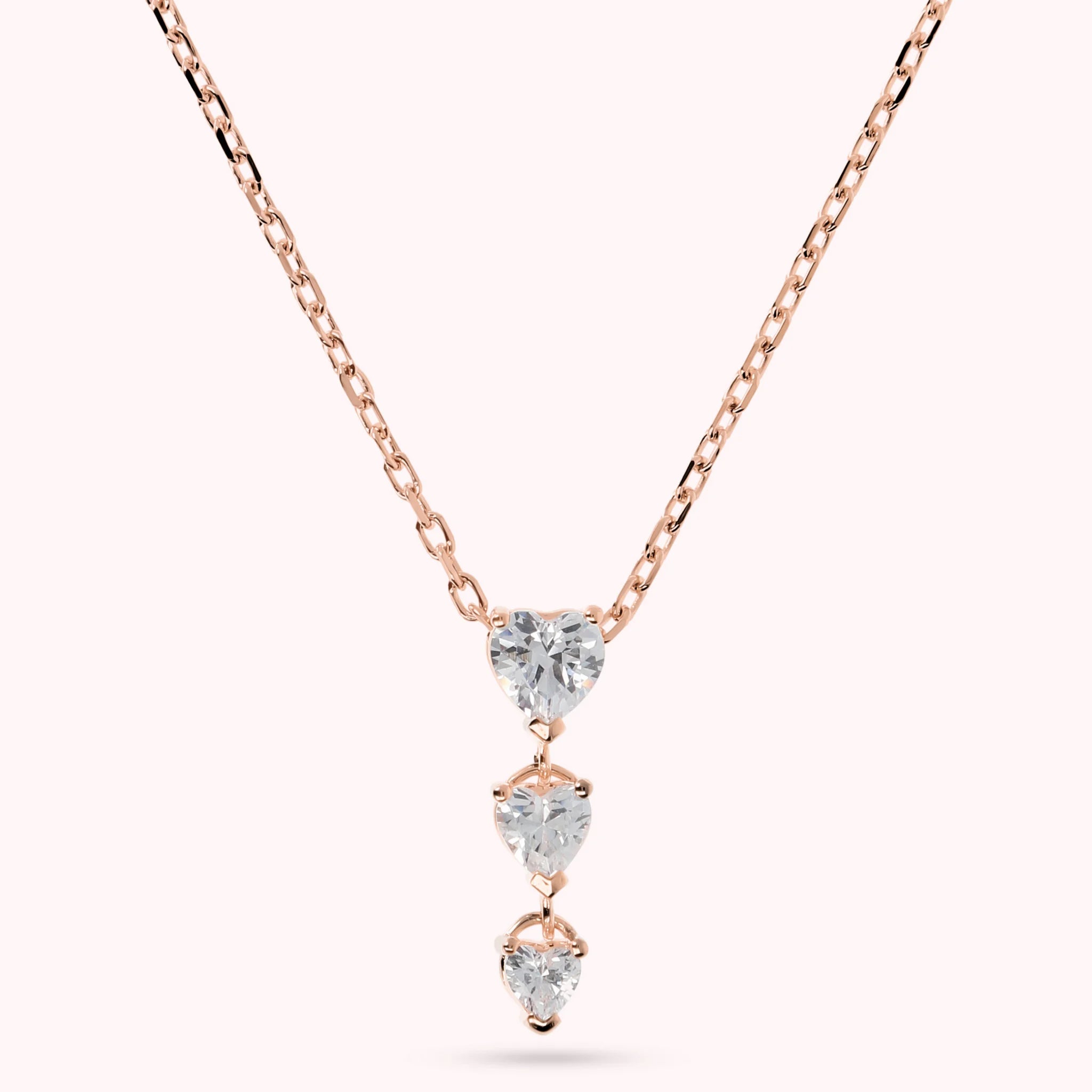 Collier Bronzallure en alliage Golden Rosé, doré à l'or fin 18ct, avec chaîne forçat ornée d'un pendentif avec trois cœurs gradués en zircons cubiques ; fermoir mousqueton. Longueur réglable par trois anneaux (41cm/44cm/47cm).