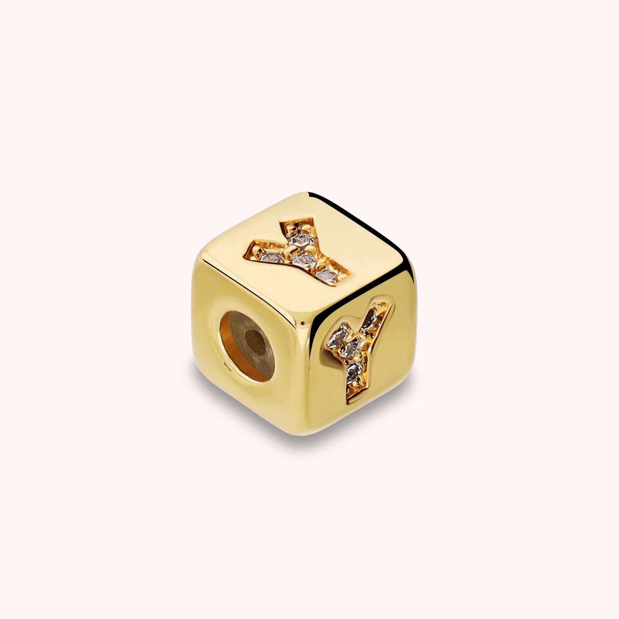Dado lettera Y Bronzallure realizzato in lega Golden Rosé, placcata Oro giallo 18kt, con cubic zirconia, qualità luminosa. Compatibile con la collana e il bracciale dado charm personalizzabili.