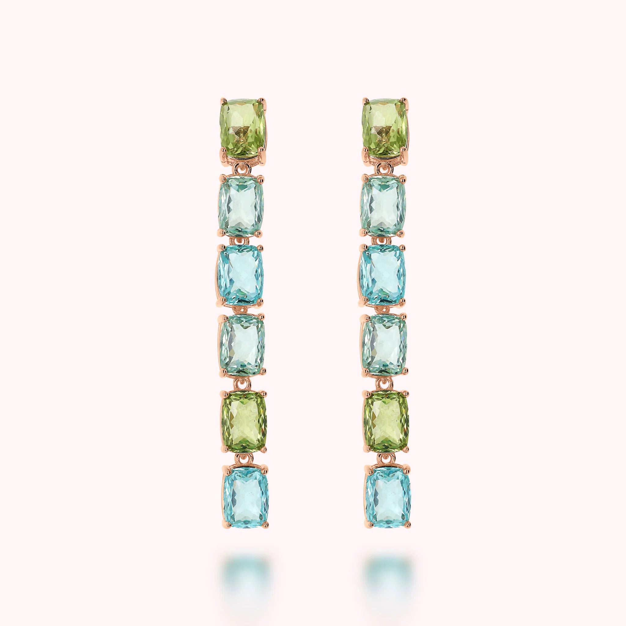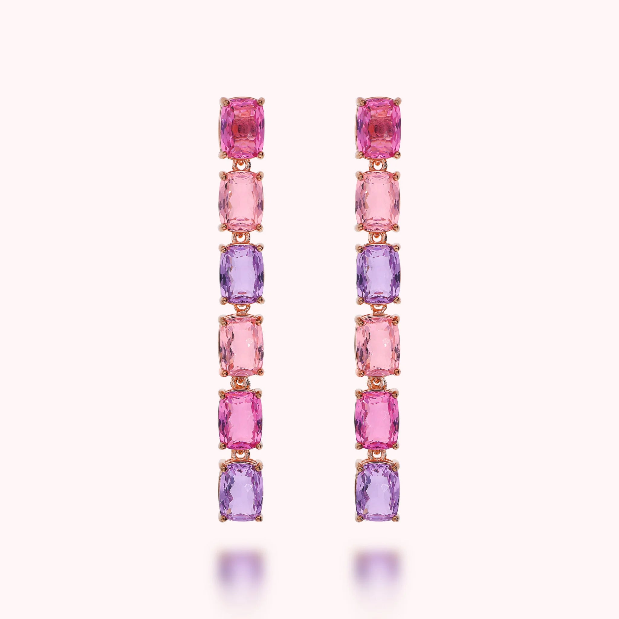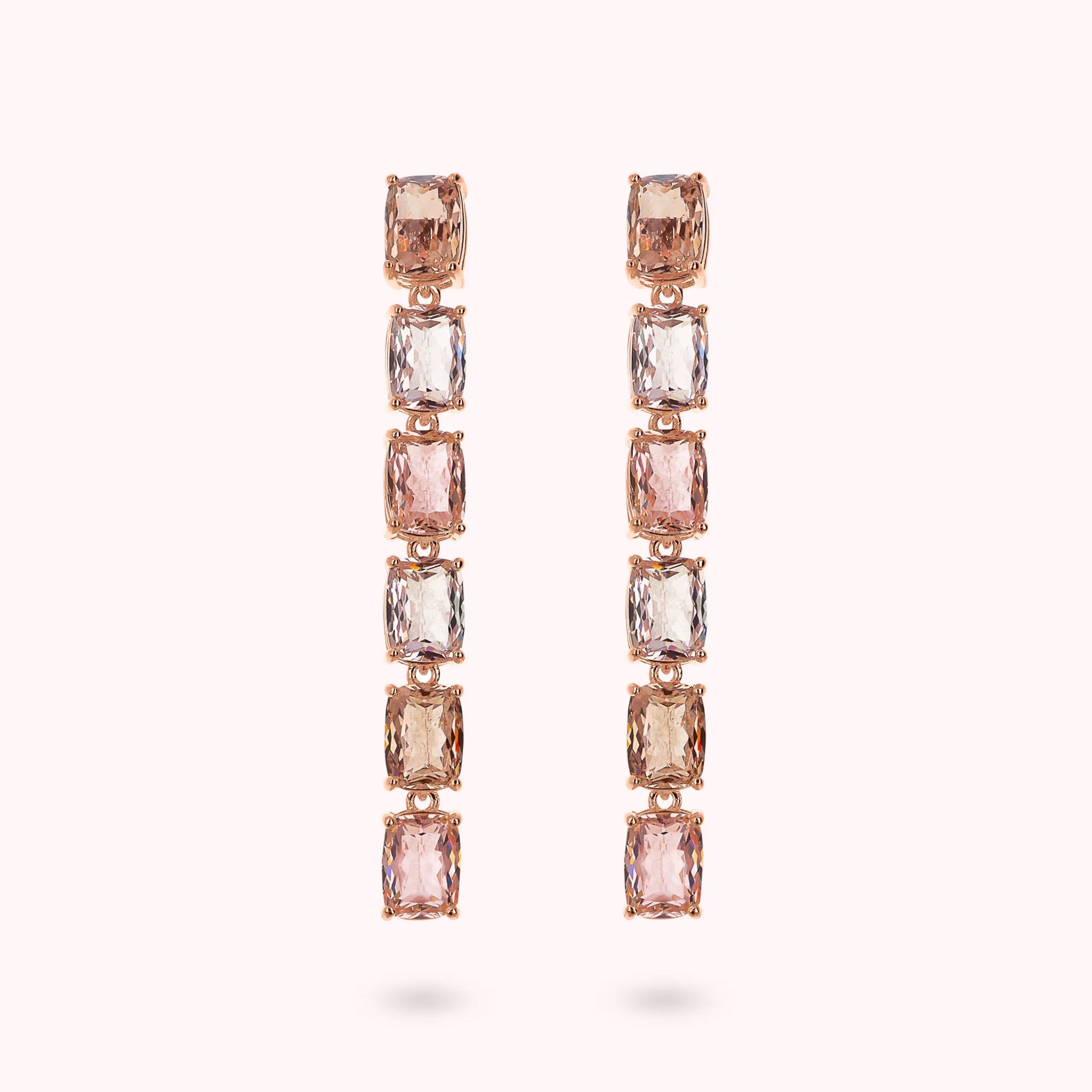 Boucles d'oreilles pendantes Bronzallure en alliage Golden Rosé, plaqué or rose 18 carats, agrémentées de six pierres prismes rectangulaires (6x8 mm) taillées en mosaïque. Longueur 5,5 cm. Fermeture épingle et papillon.