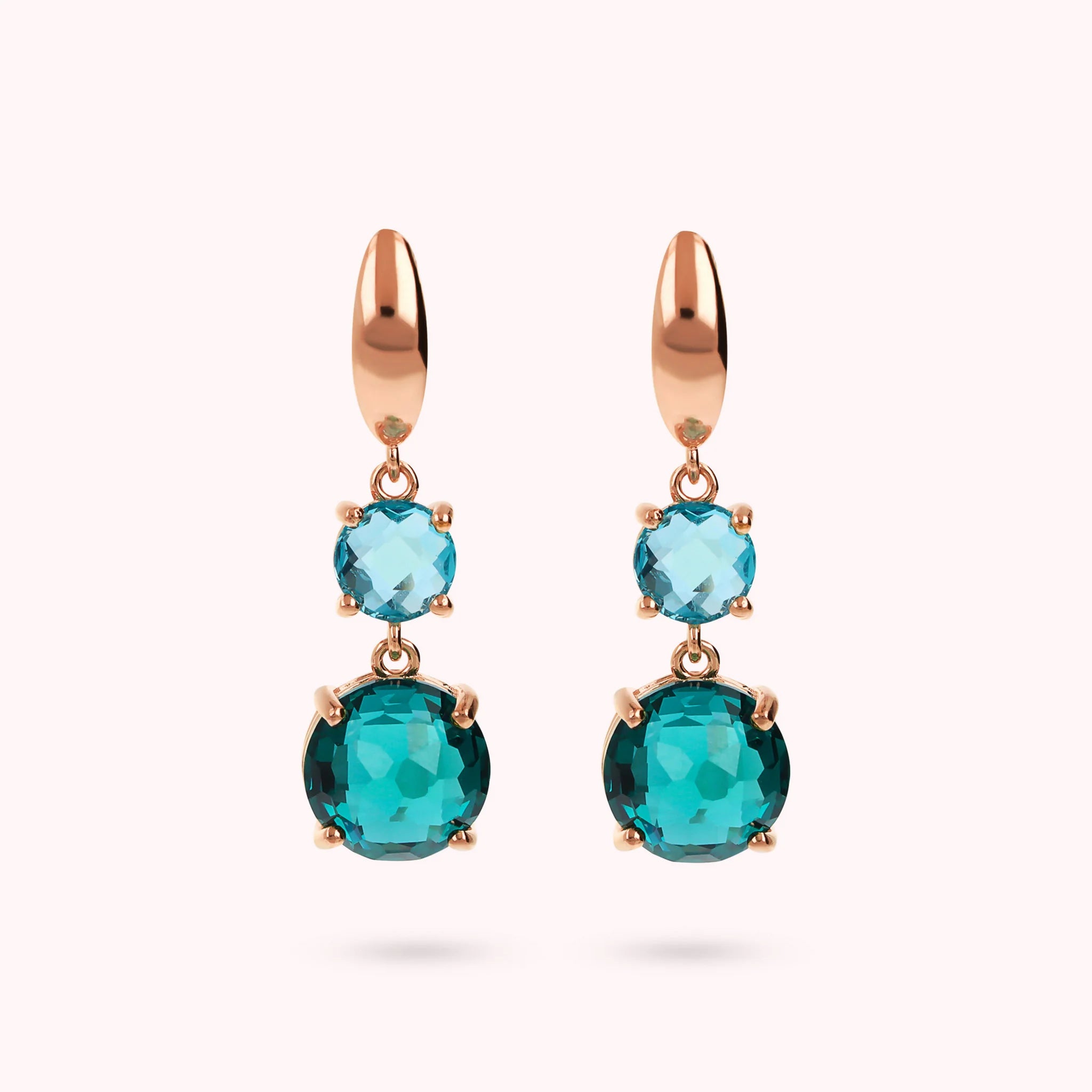 Boucles d'oreilles pendantes Bronzallure en alliage Golden Rosé, doré à l'or rose fin 18ct, avec pierres en prisme gem graduate (6.5/10 mm). Longueur 3 cm. Fermeture avec tige à emboîtement.