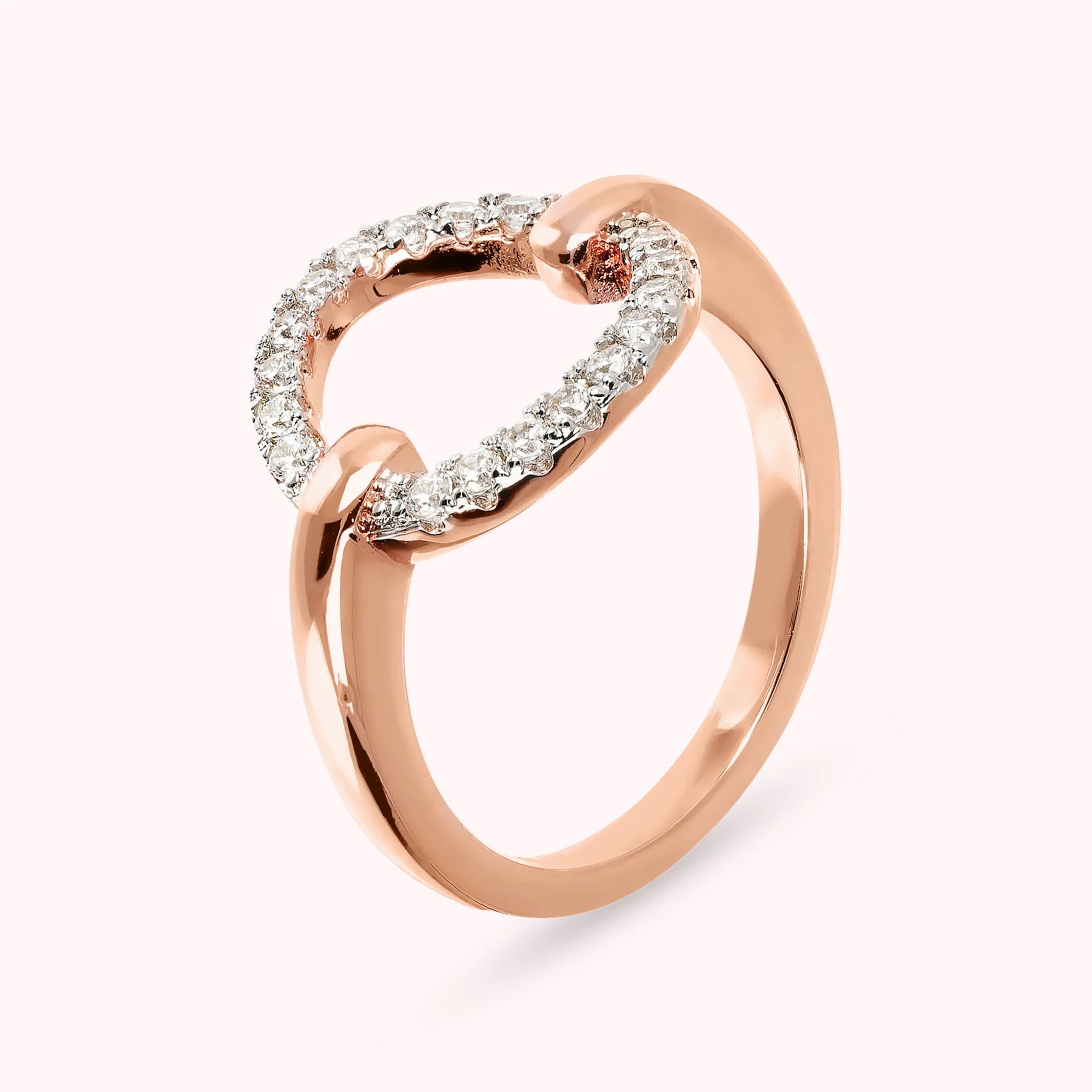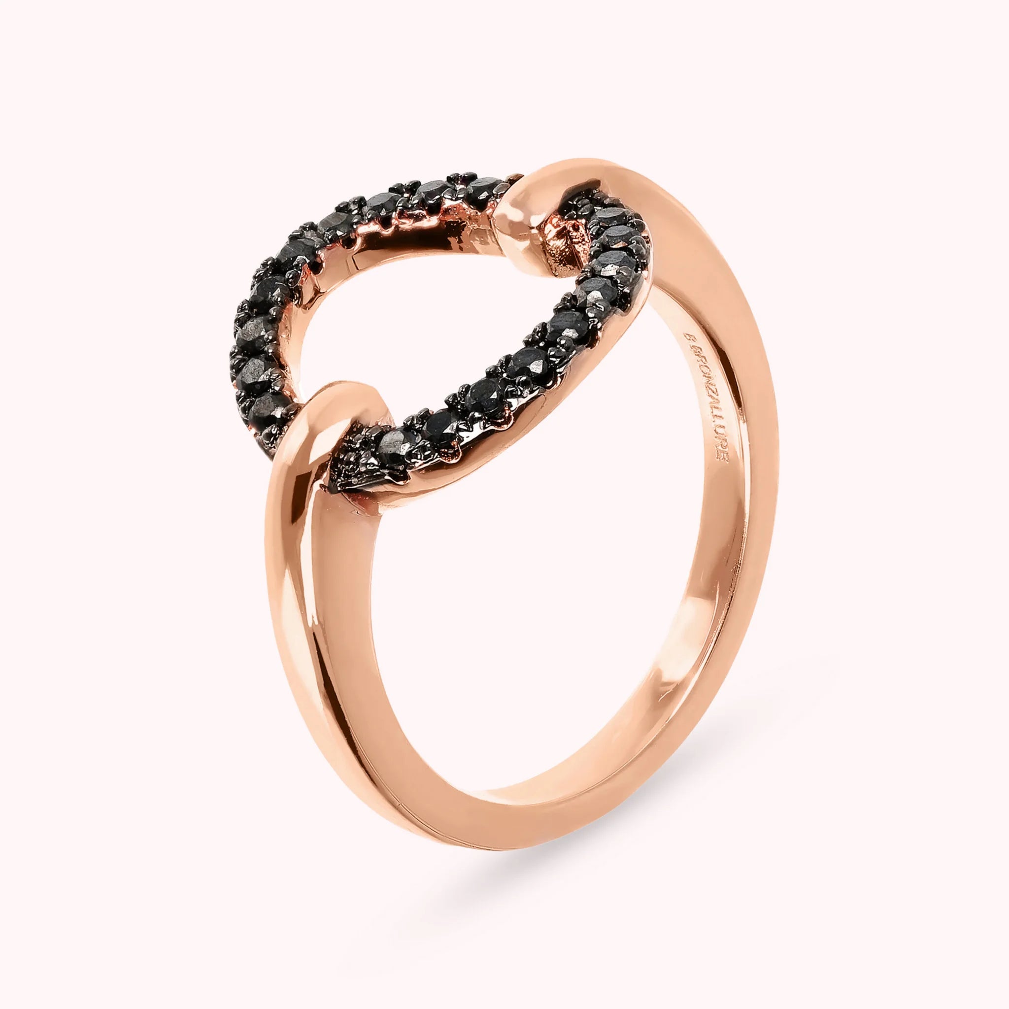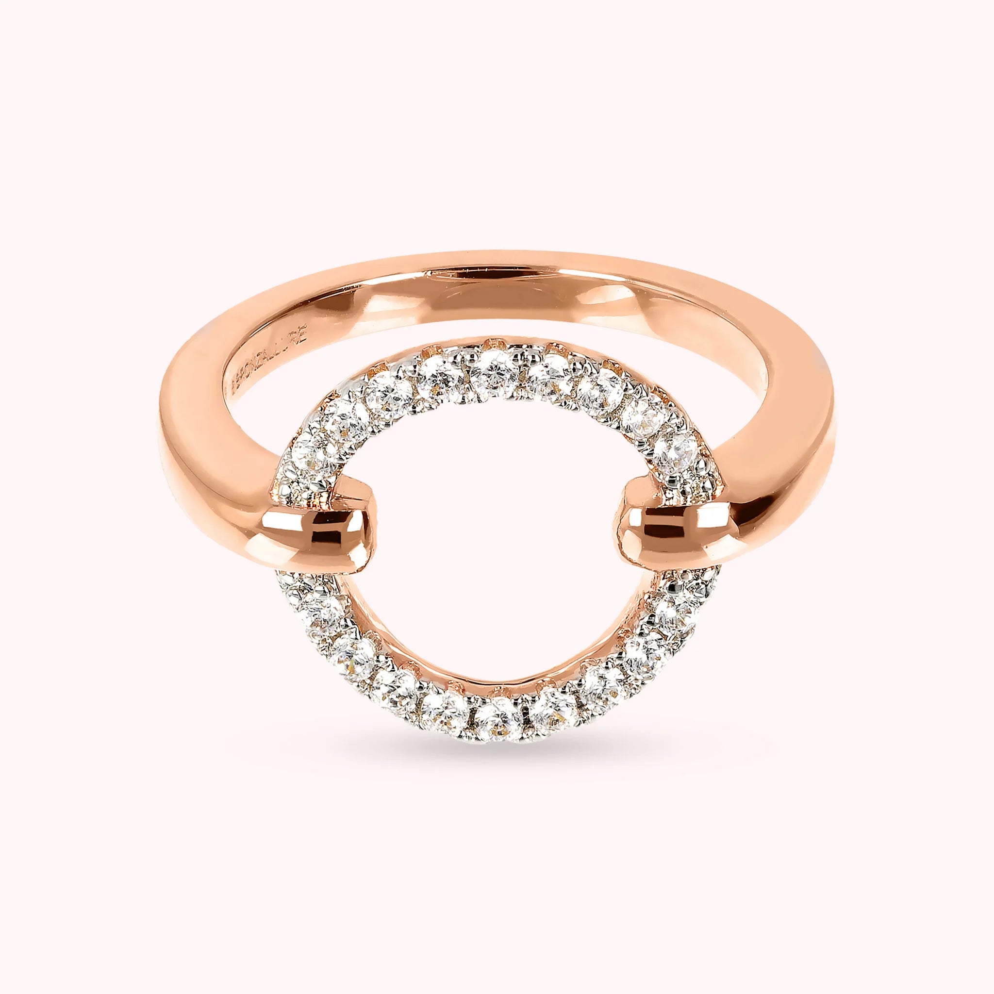 Bague Bronzallure en alliage Golden Rosé, doré à l'or fin 18ct, agrémentée d'un cercle ouvert (1,3 cm de diamètre) positionné sur le dessus et recouvert de petits zircons cubiques, qualité lumineuse, et de spinelles noirs. Création élégante, avec un design parfait pour faire briller votre look.