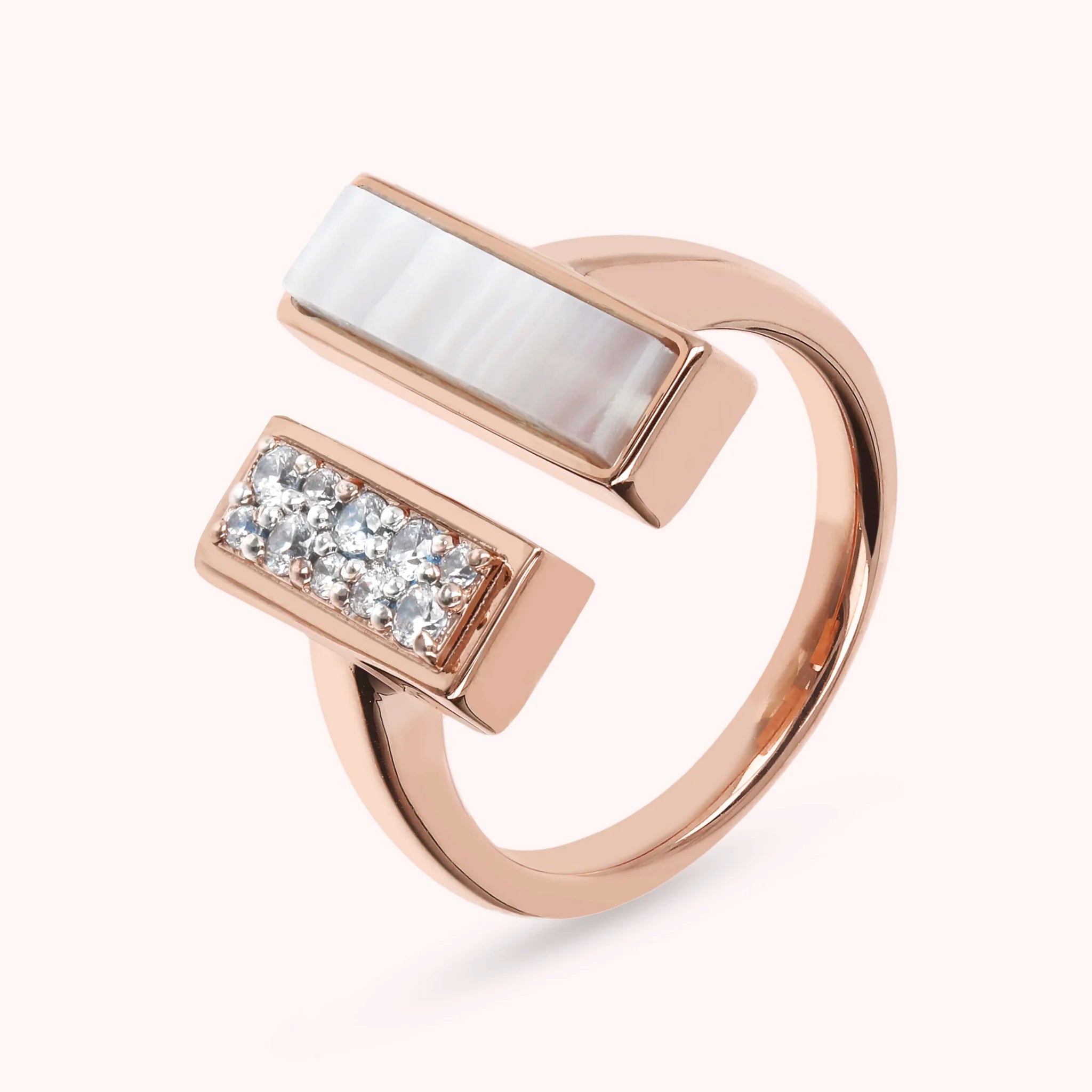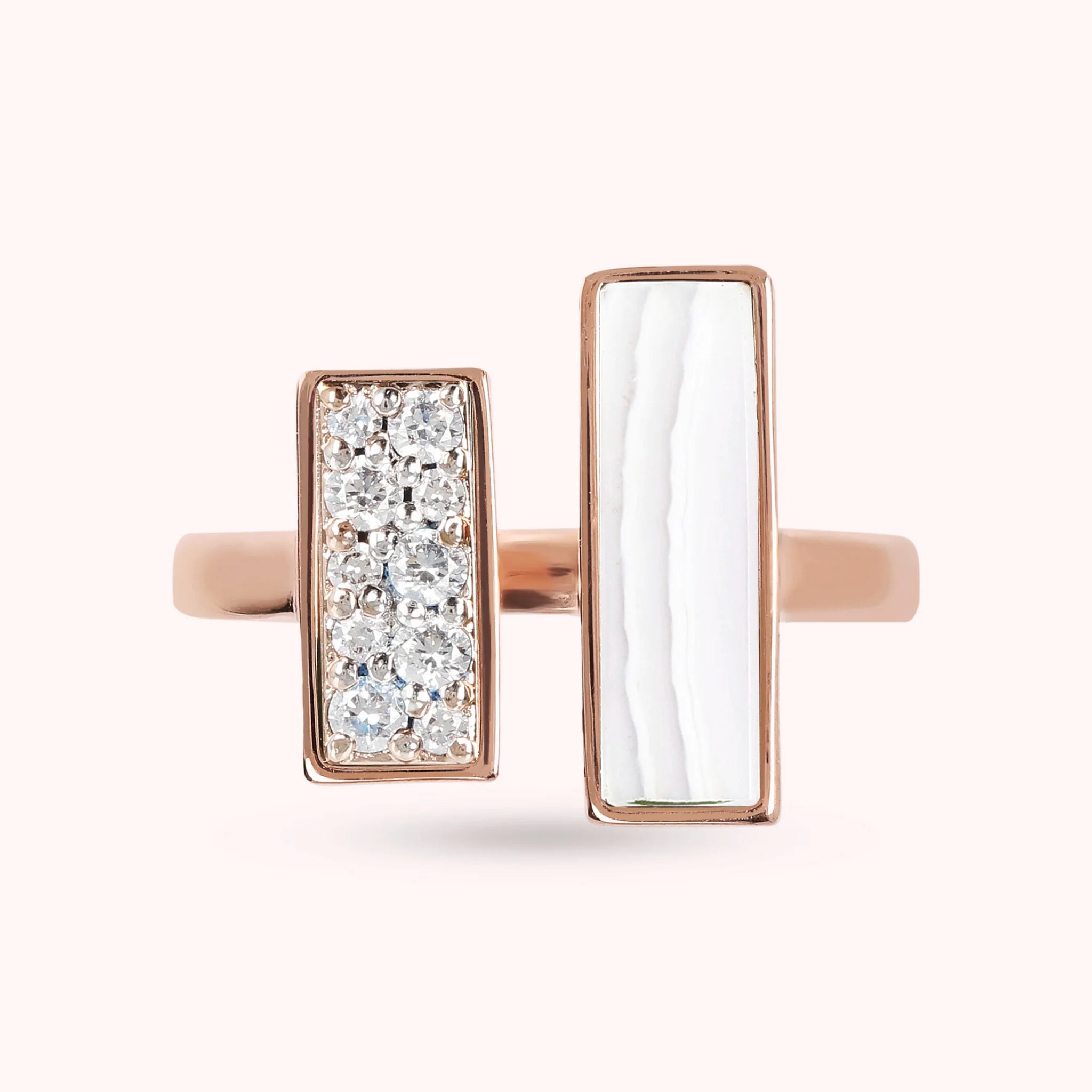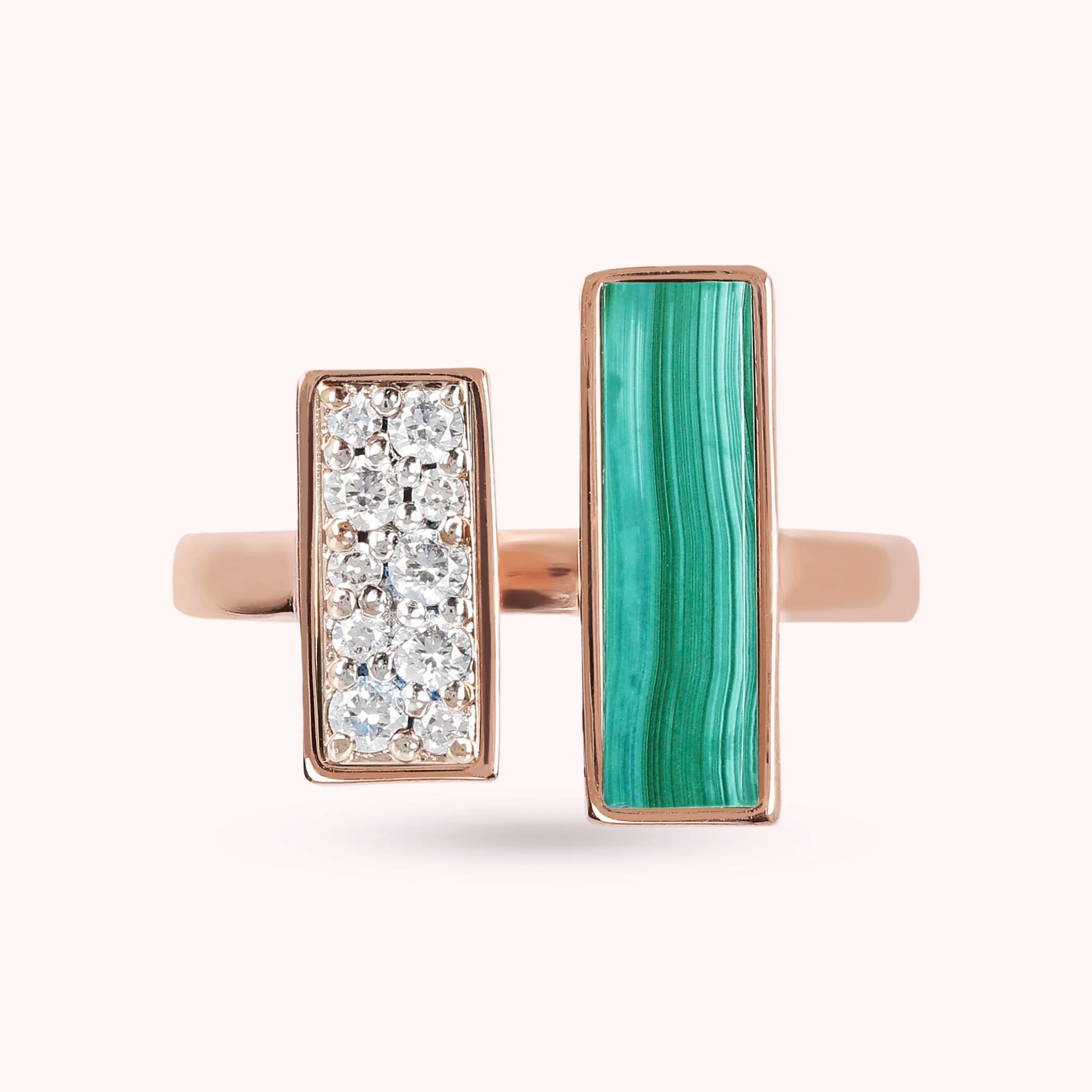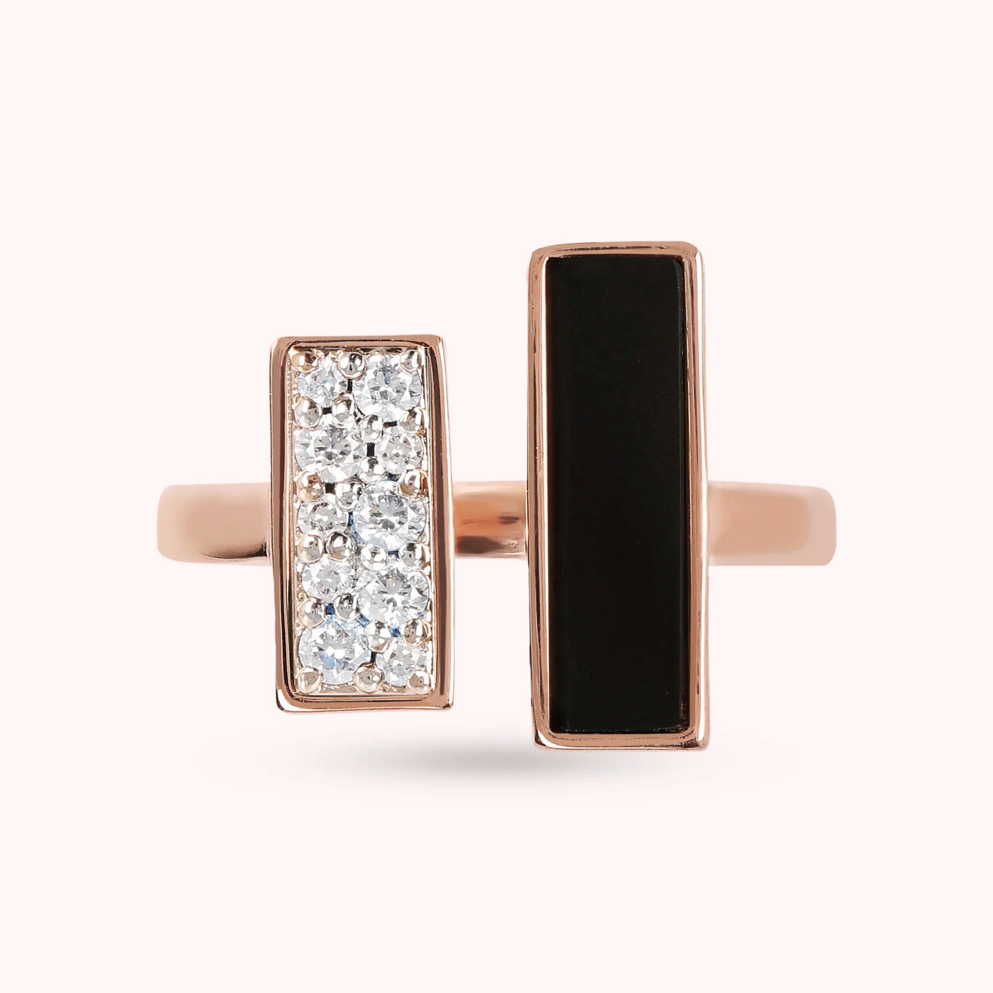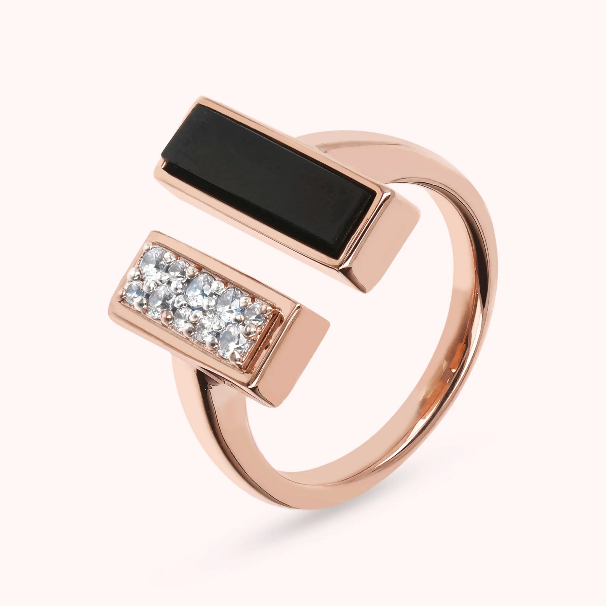 Bague Bronzallure contrarié réalisée sur une base Golden Rosé, doré à l'or fin 18ct, agrémentée de deux éléments rectangulaires en zircone cubique, qualité lumineuse, et pierre naturelle onyx noir, malachite verte ou perle blanche.