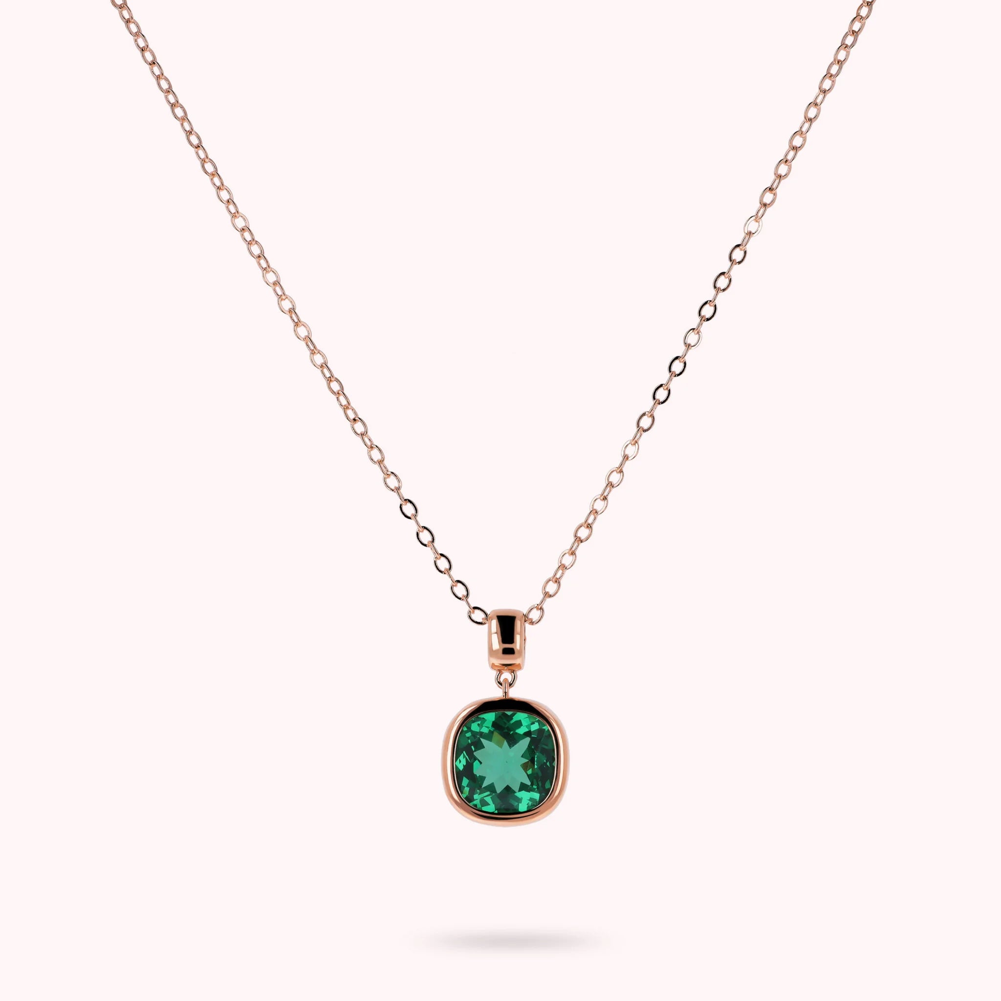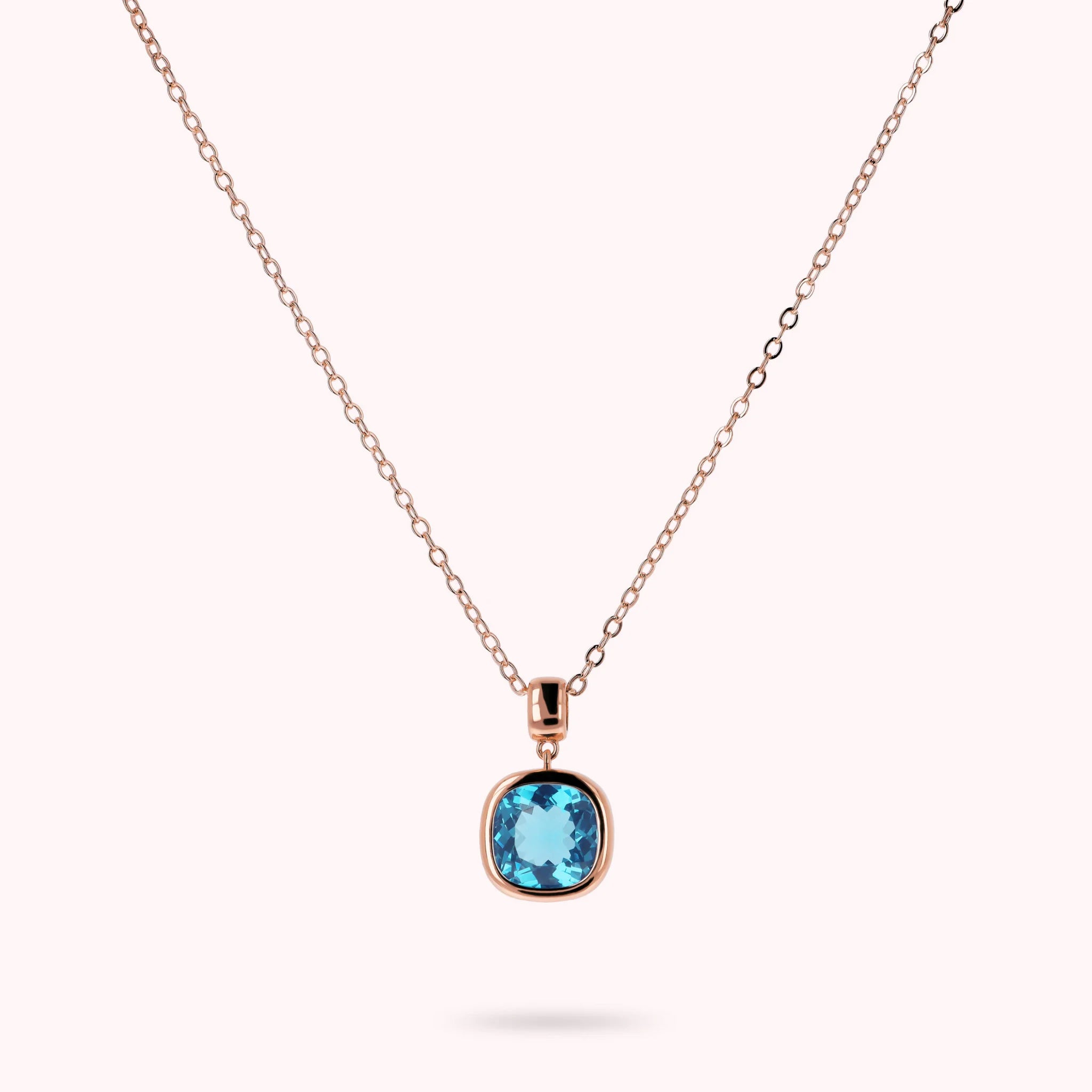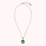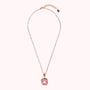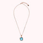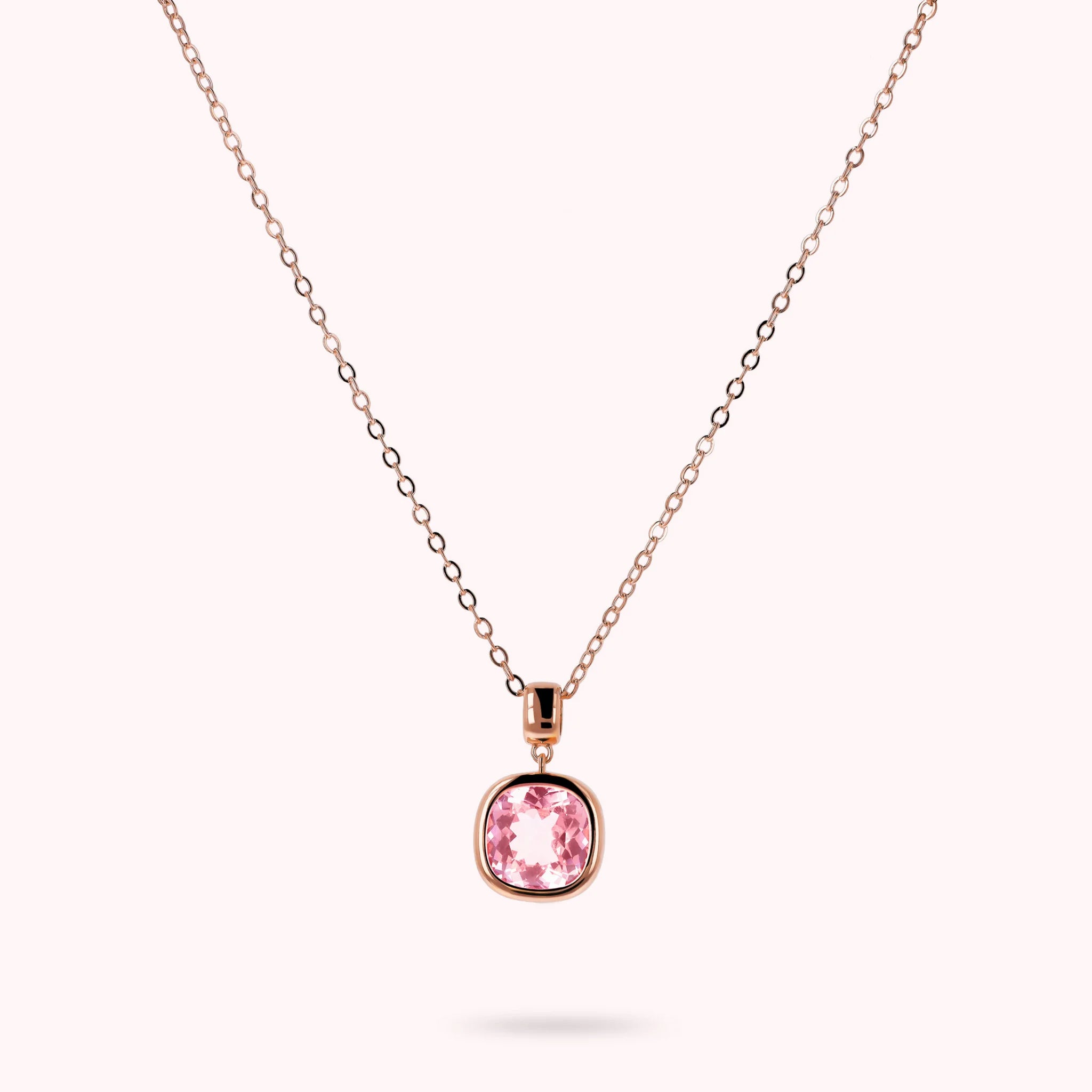 Collier Bronzallure réalisé en alliage Golden Rosé, plaqué or rose 18 carats, avec une chaîne rolo agrémentée d’un pendentif point de lumière en pierre prisma gem (15x15 mm), taille coussin. Fermoir mousqueton.