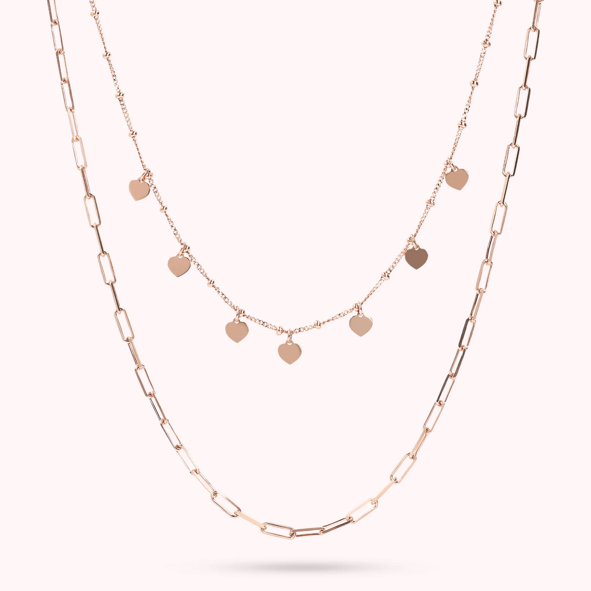 Collier Multi-Rangs Chaîne Forçat avec Breloques Coeur