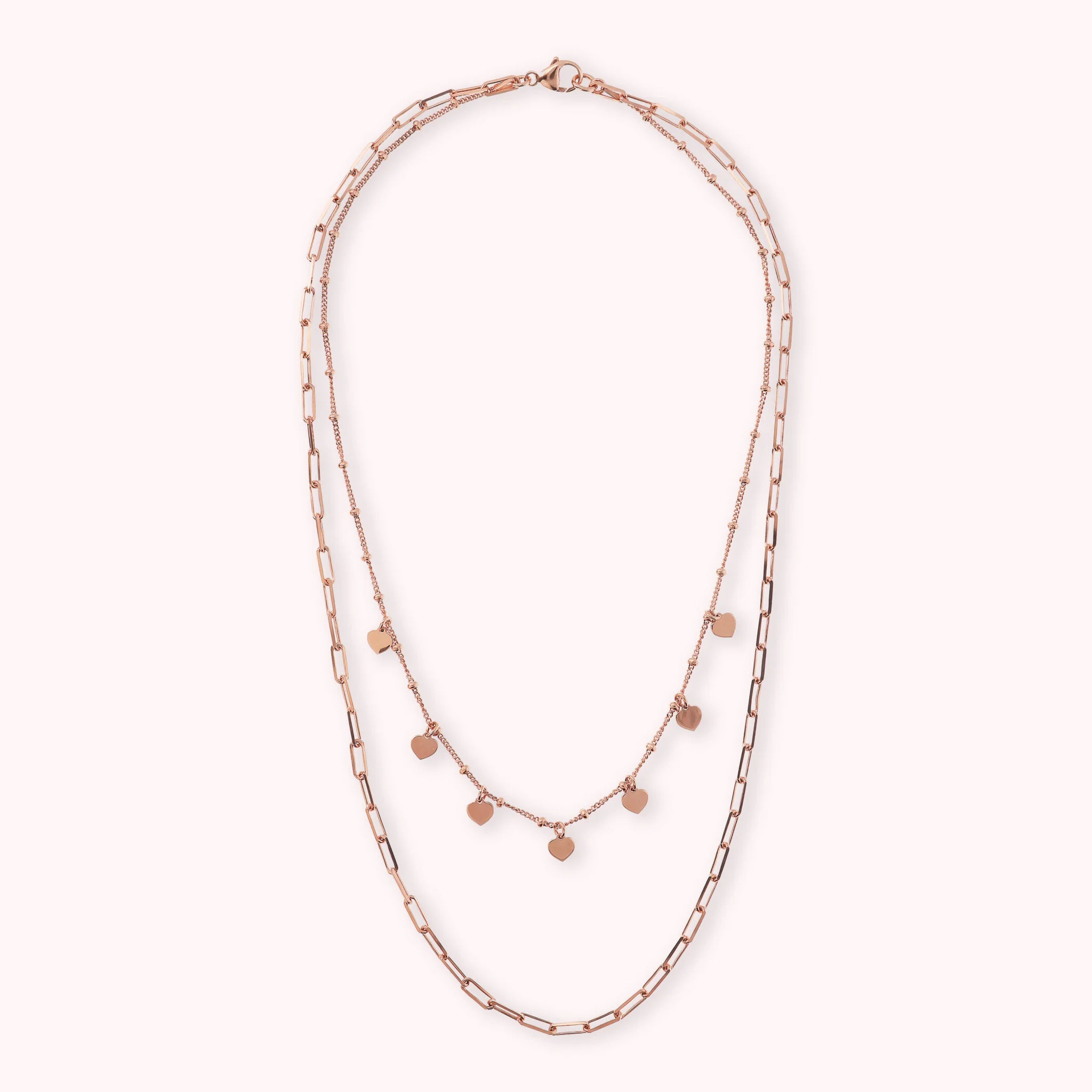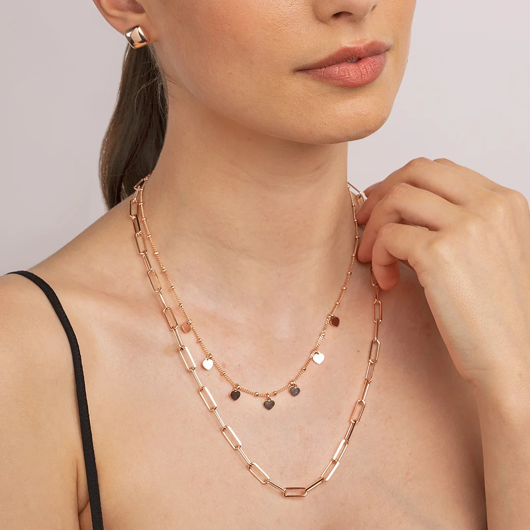 Collier multi-rangs Bronzallure en alliage Golden Rosé, doré à l'or fin 18ct, avec deux rangs de chaîne. Le premier collier est une chaîne avec des boules et des breloques en forme de cœur. Le deuxième collier est une chaîne forçat allongée avec un fermoir mousqueton.