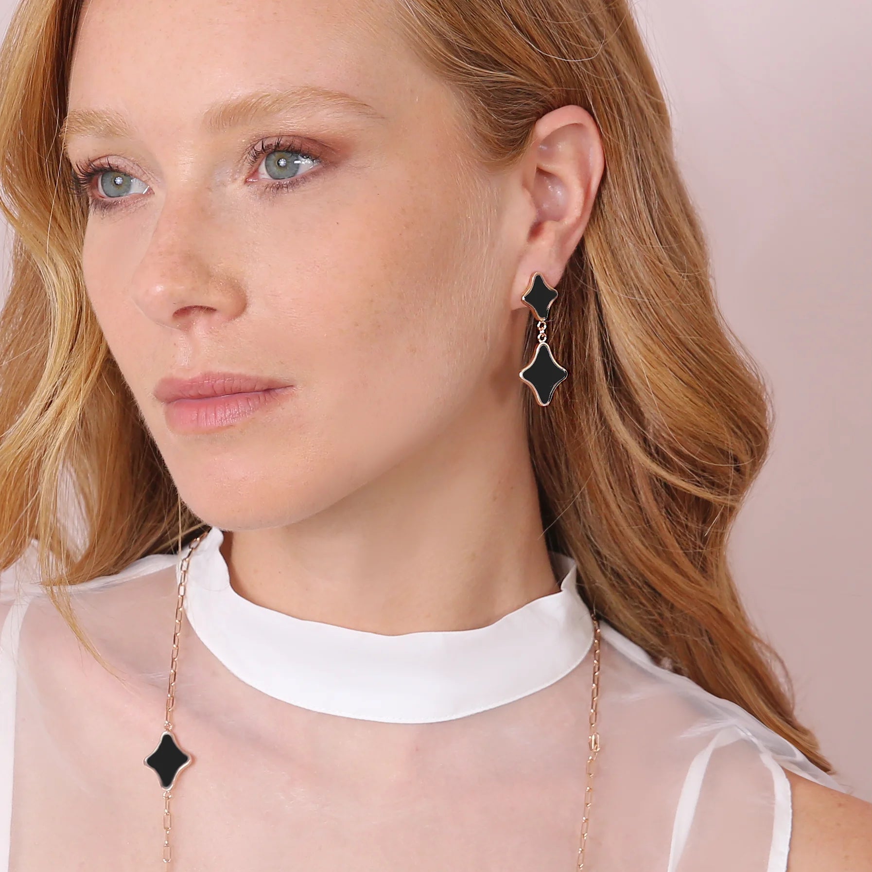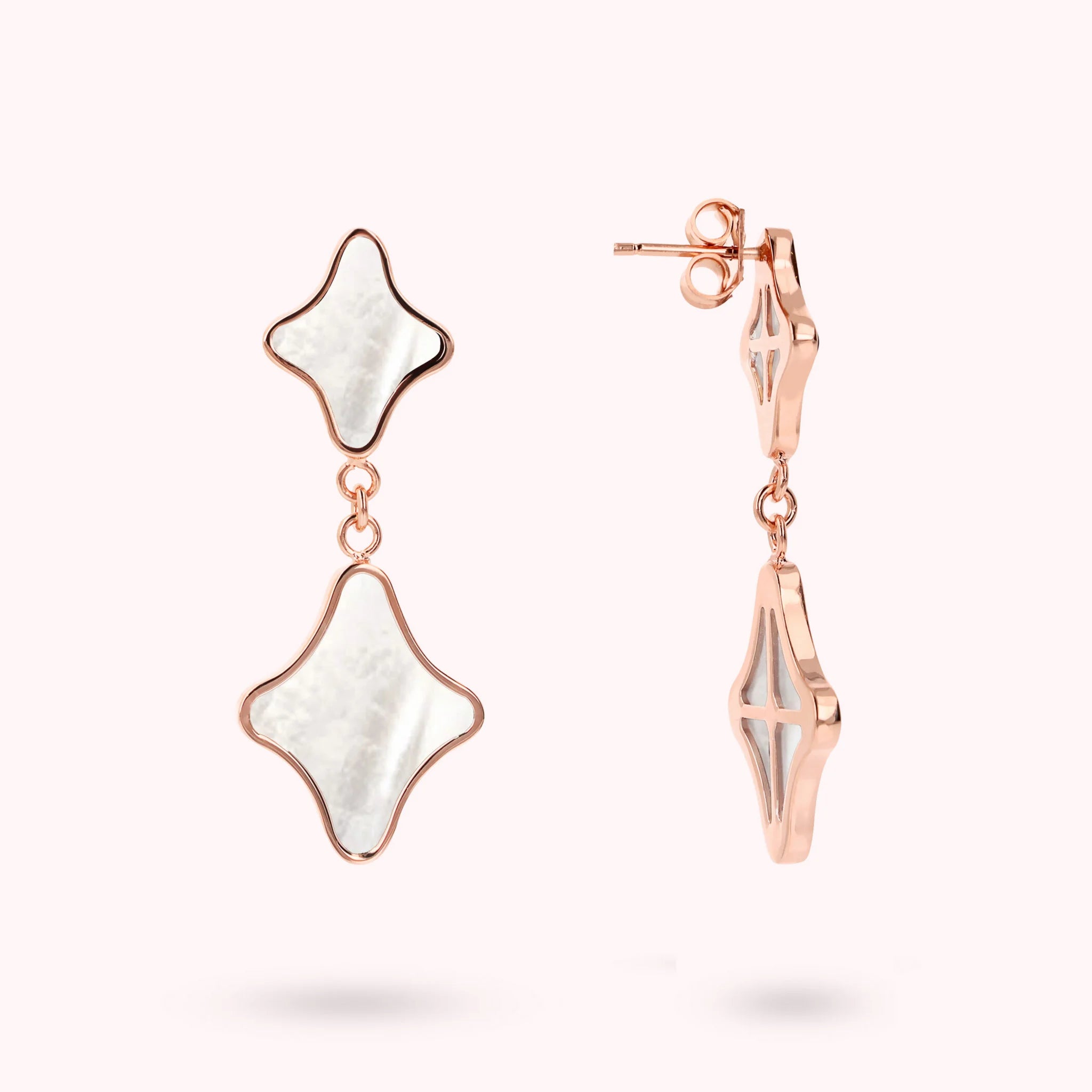 Boucles d'oreilles pendantes Bronzallure en alliage Golden Rosé, doré à l'or fin 18ct, ornées de deux éléments étoile, un petit (14,5x11,5 mm) et un grand (19,5x15,5 mm) en pierre naturelle d'onyx noir ou en nacre blanche ; fermoir papillon.
