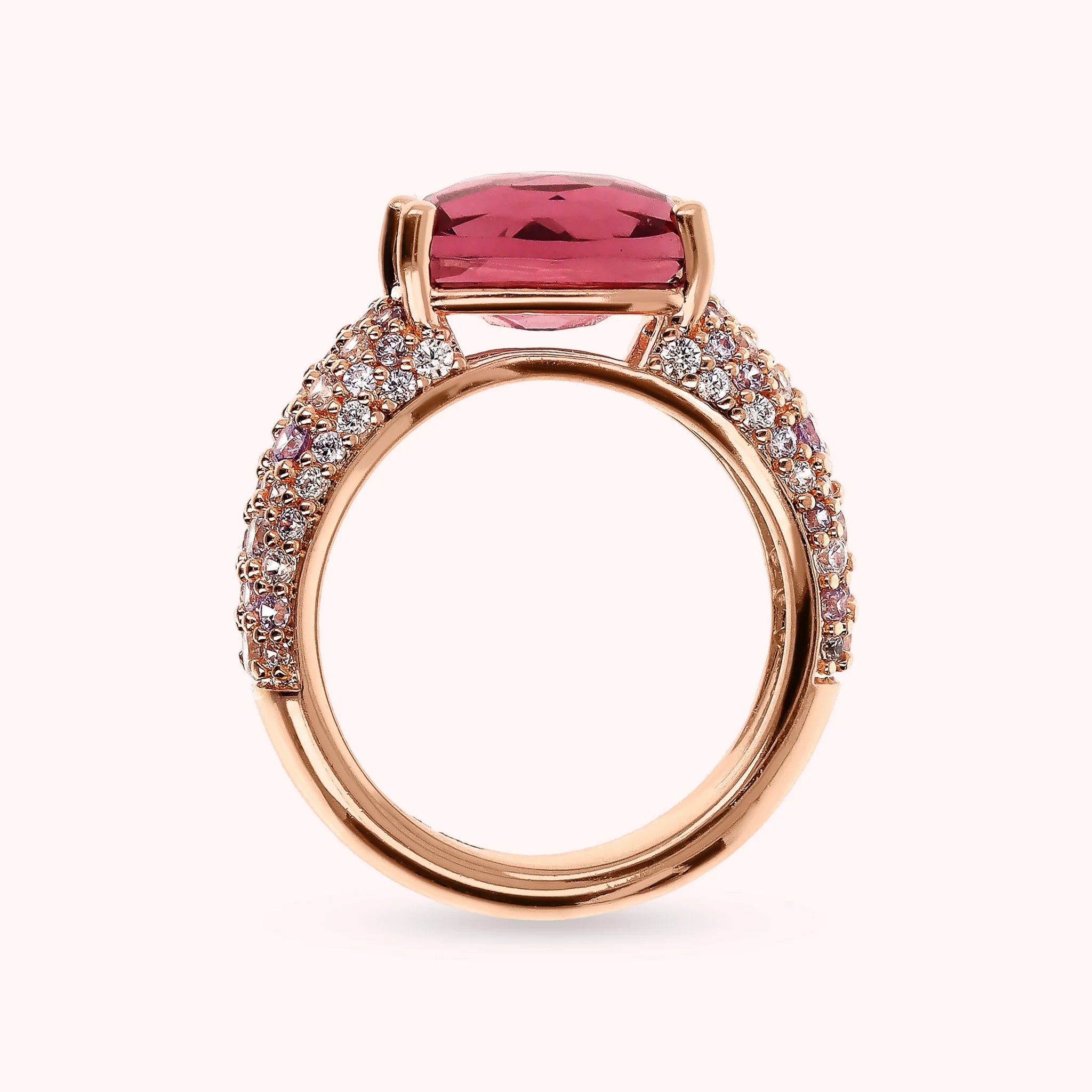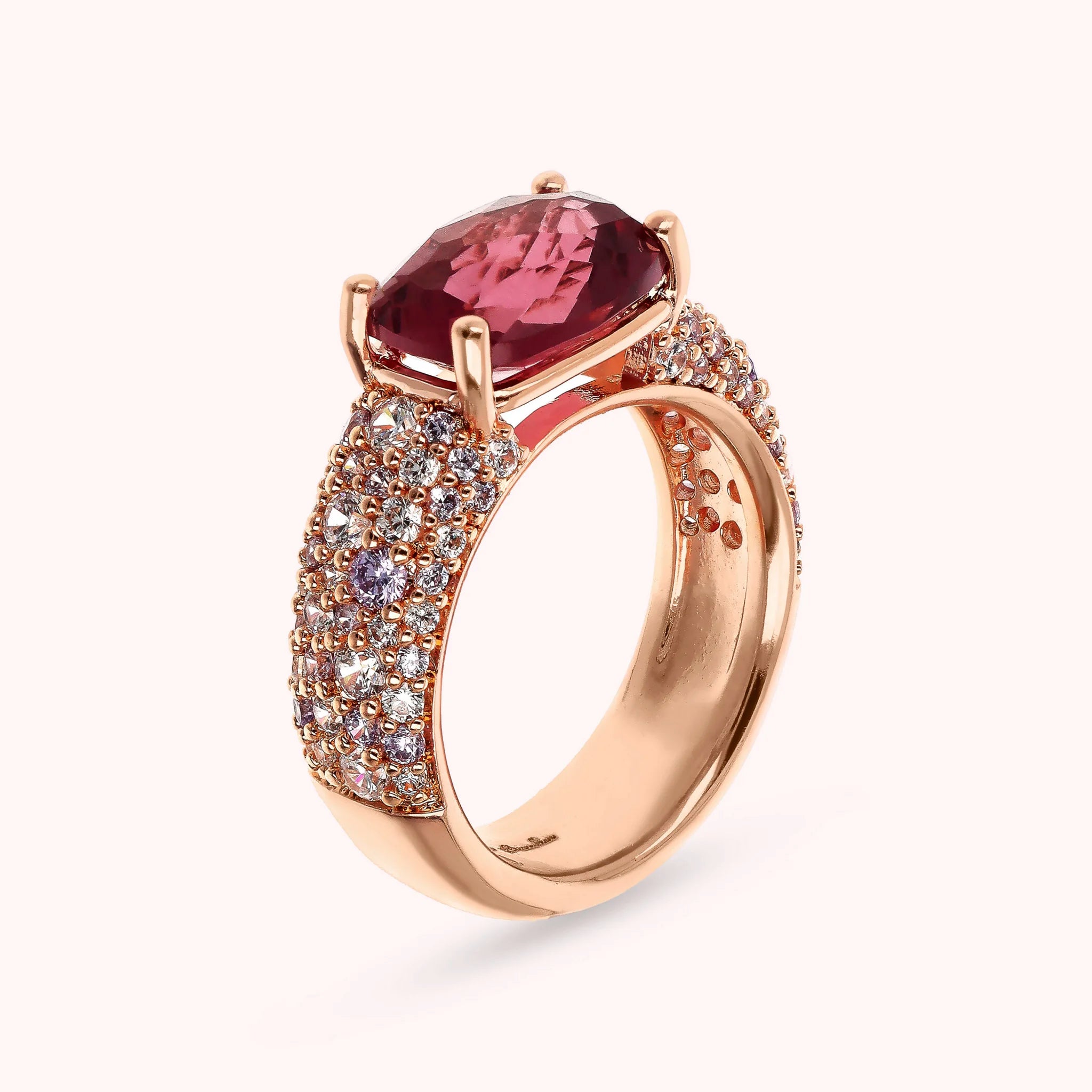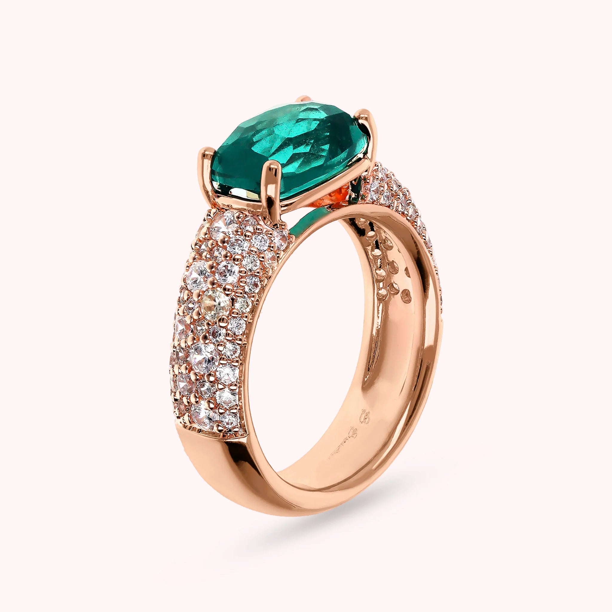 Bague Bronzallure en alliage Golden Rosé, plaqué or rose 18 carats, avec surface pavée de zircones cubiques, qualité lumineuse, agrémentée d'une pierre gemme prisme rectangulaire (8x5 mm) taillée en mosaïque.