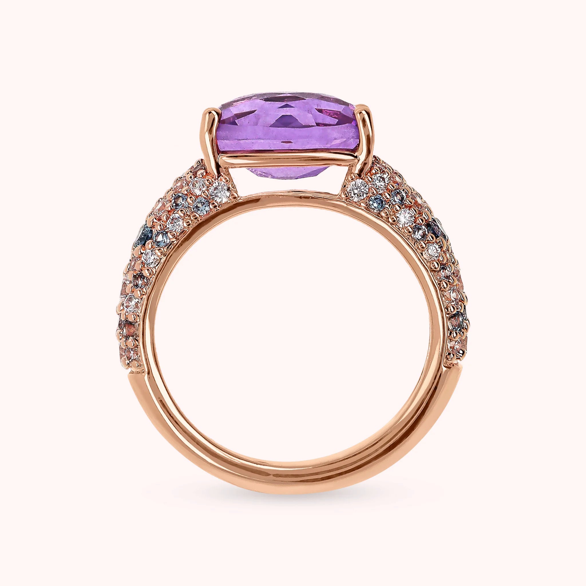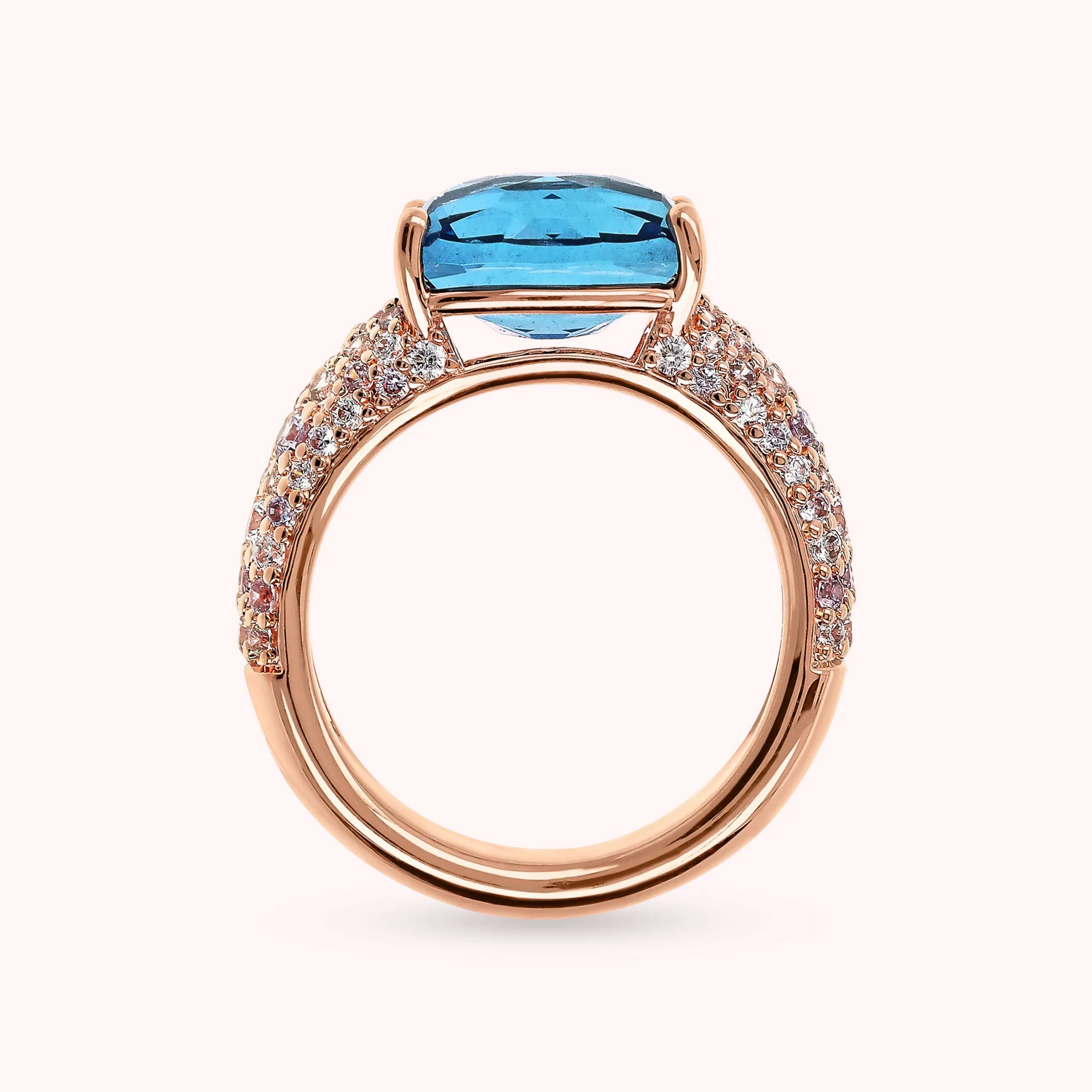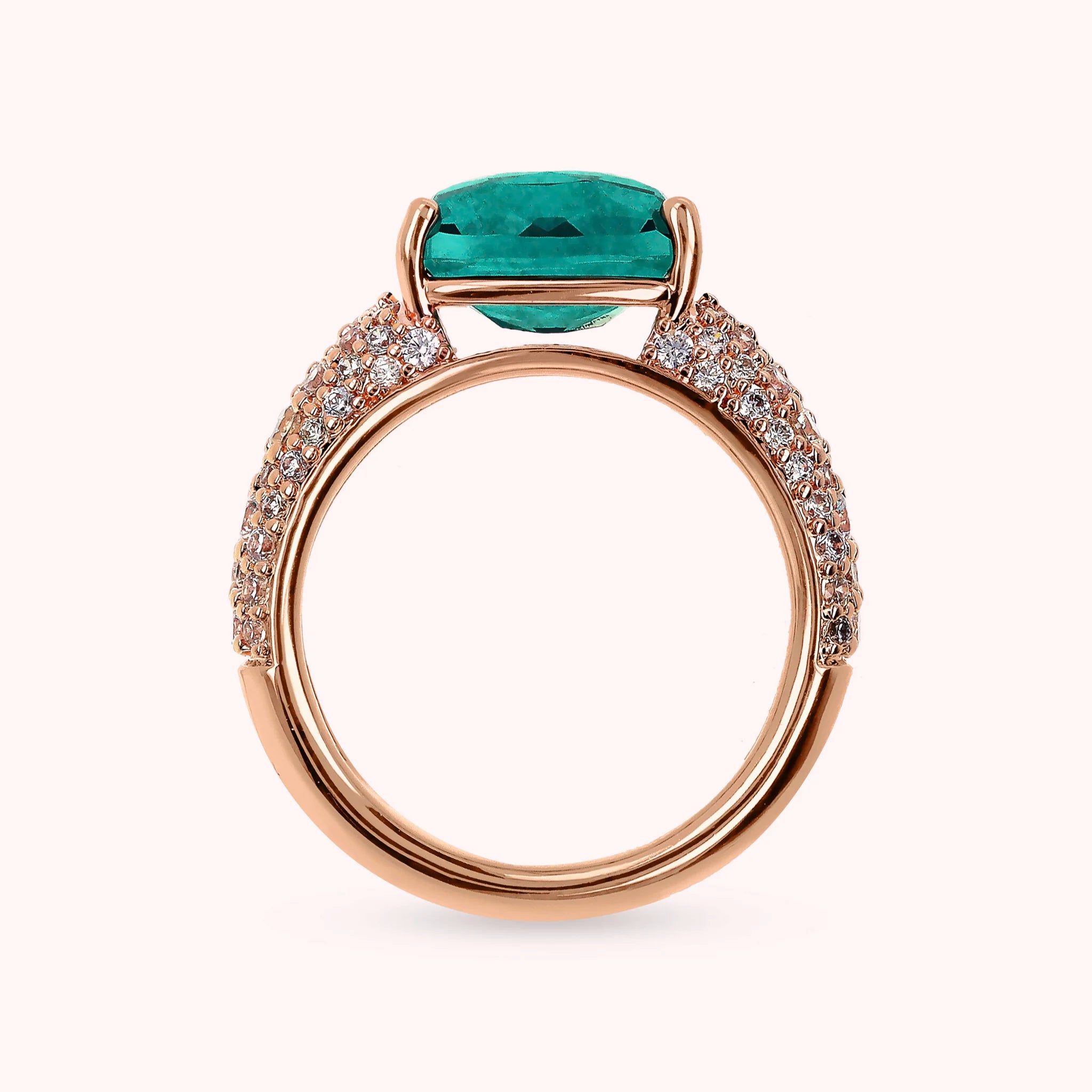 Bague Bronzallure en alliage Golden Rosé, plaqué or rose 18 carats, avec surface pavée de zircones cubiques, qualité lumineuse, agrémentée d'une pierre gemme prisme rectangulaire (8x5 mm) taillée en mosaïque.