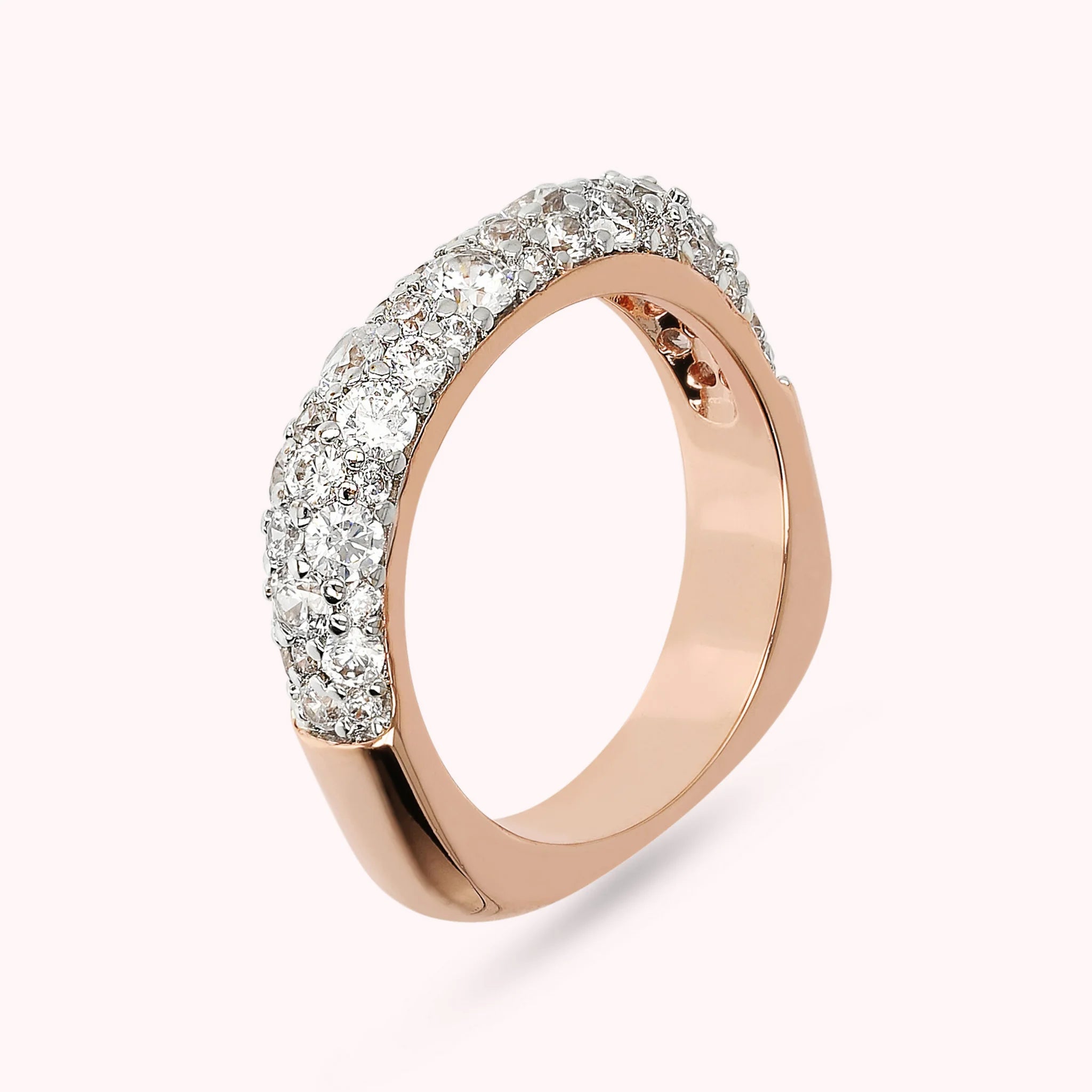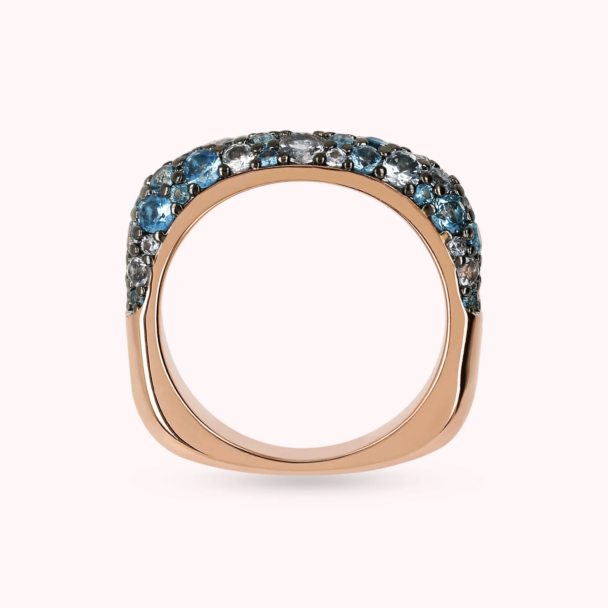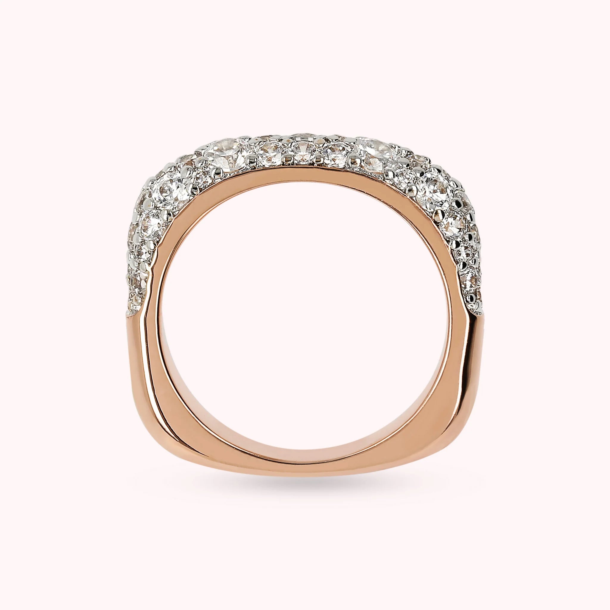 Bague Bronzallure Riviera, de forme carrée, en alliage Golden Rosé doré à l'or fin 18ct agrémentée d'un pavé d'oxydes de zirconium cubiques, qualité lumineuse. La position des pierres est étudiée pour créer un effet d'ombre délicat et jeune.