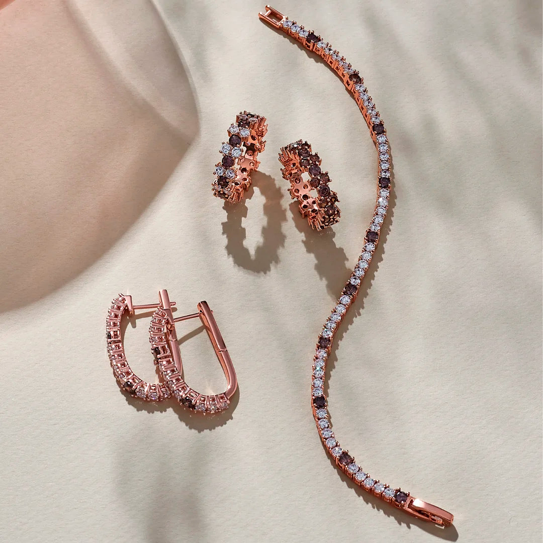 - Évite les produits chimiques, y compris les savons, les produits ménagers et les produits de jardin, et veille à ne pas les exposer excessivement à des environnements hostiles pouvant endommager, au fil du temps, à la fois le plaquage en or rose et les pierres précieuses.