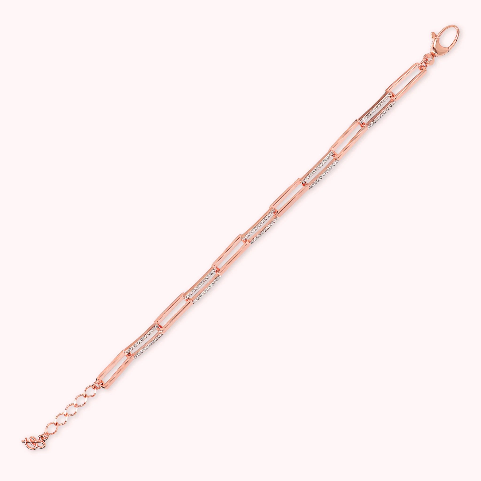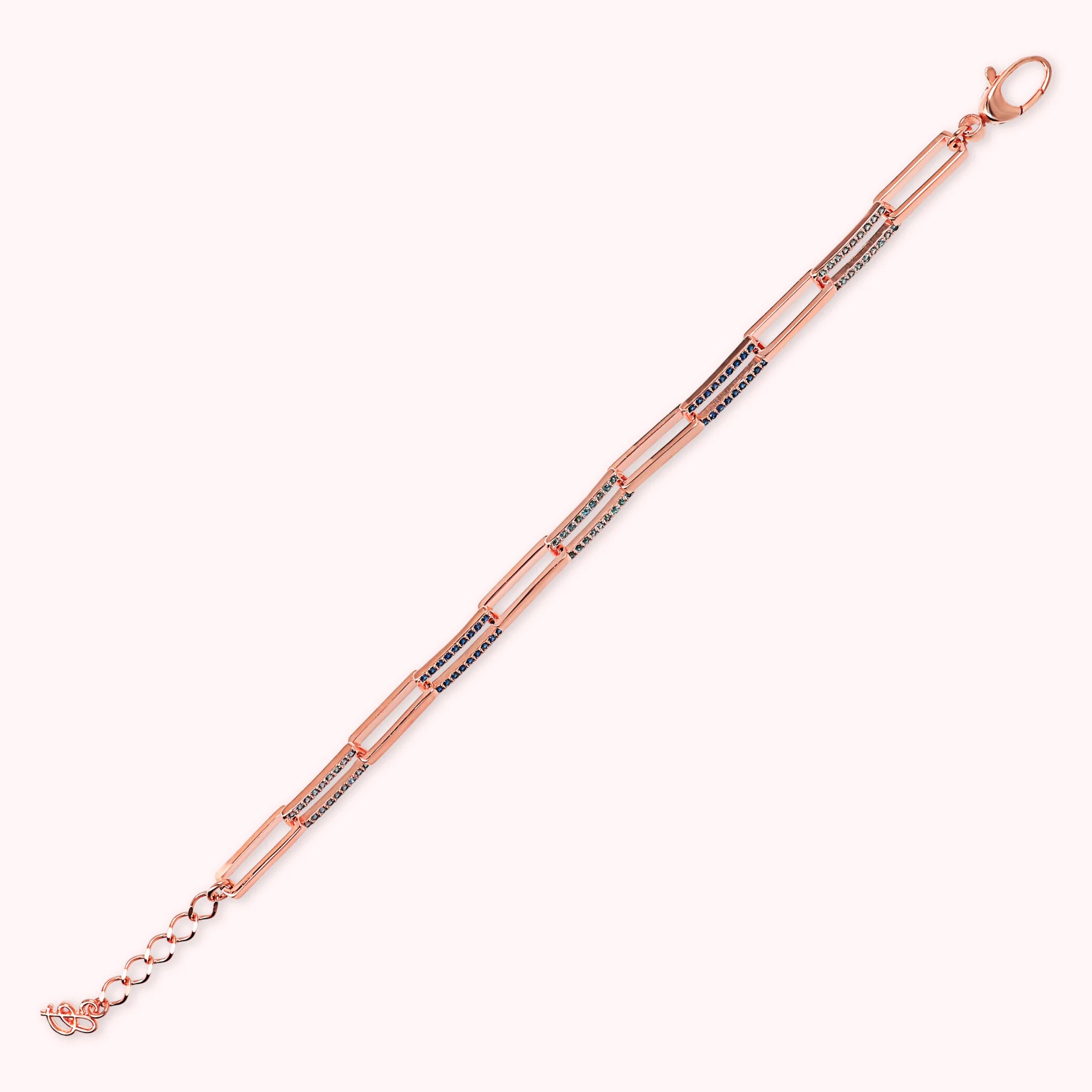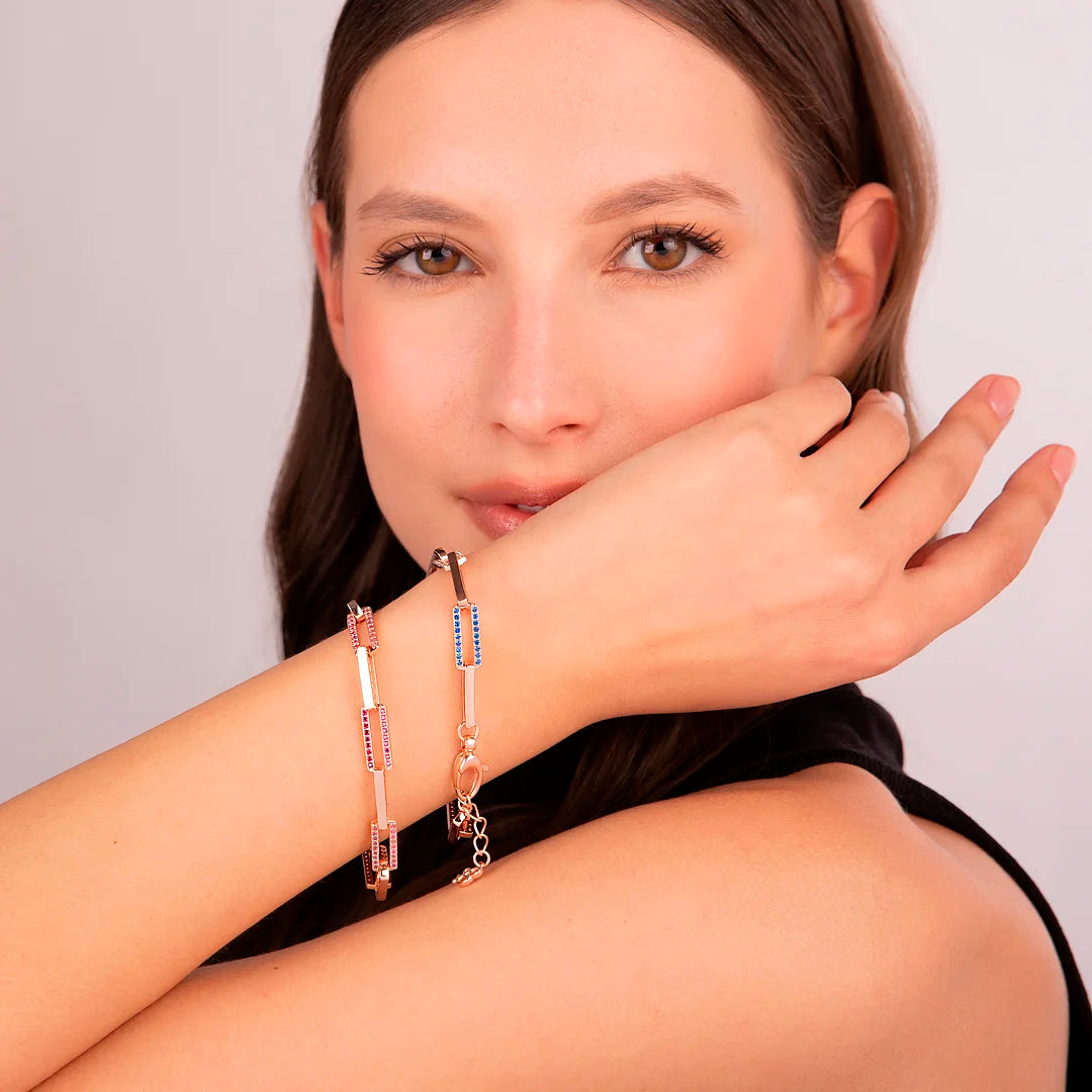 Bracelet Bronzallure réalisé sur une base Golden Rosé, doré à l'or fin 18ct, avec chaîne forçat trombone allongé ornée de zircons cubiques lumineux, pratique à porter avec fermeture à mousqueton et rallonge. Création de style, parfaite pour être portée en toute occasion.