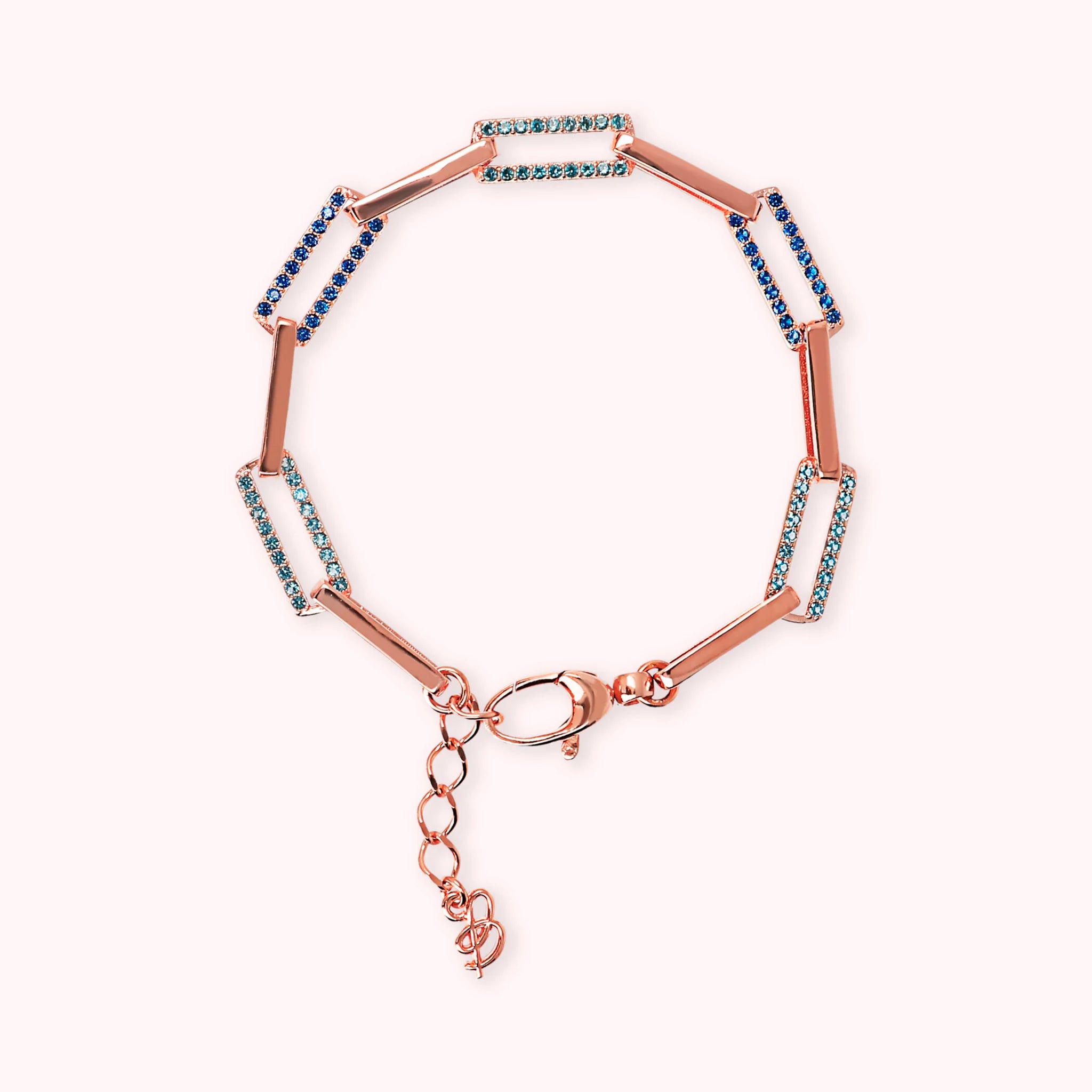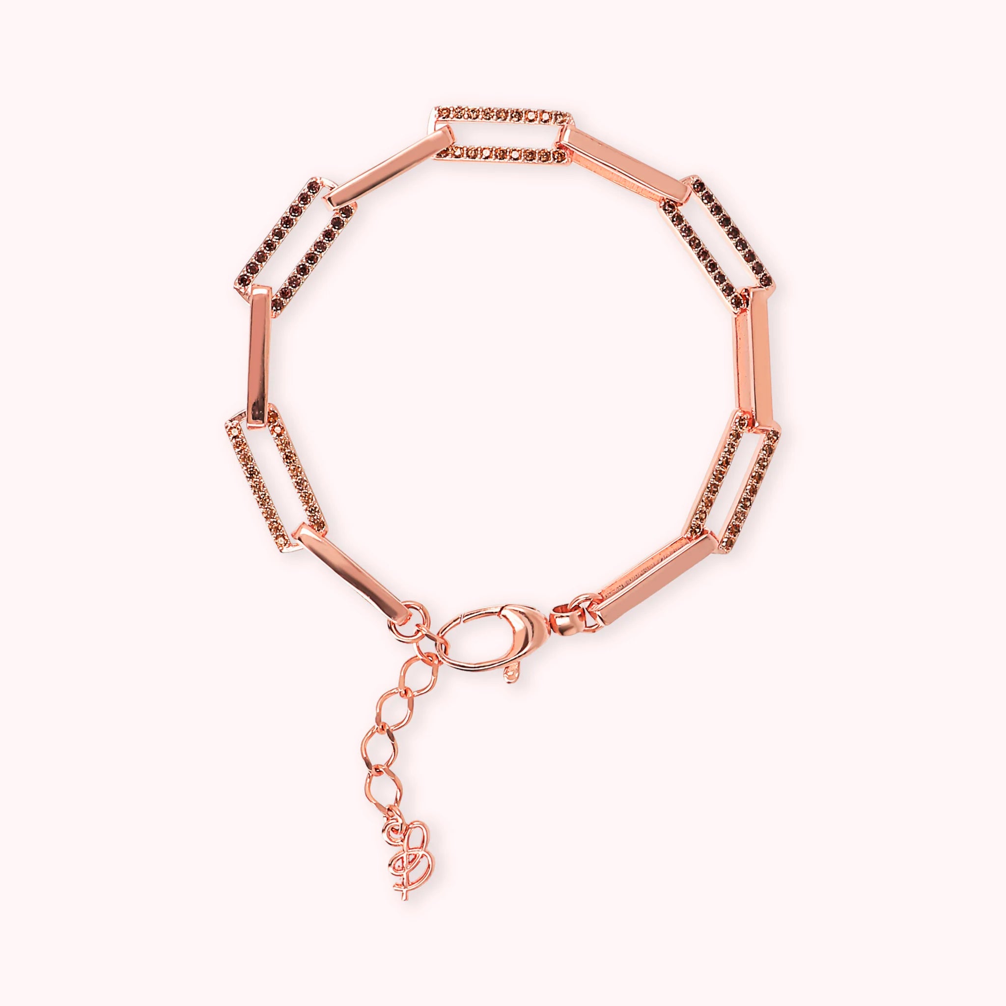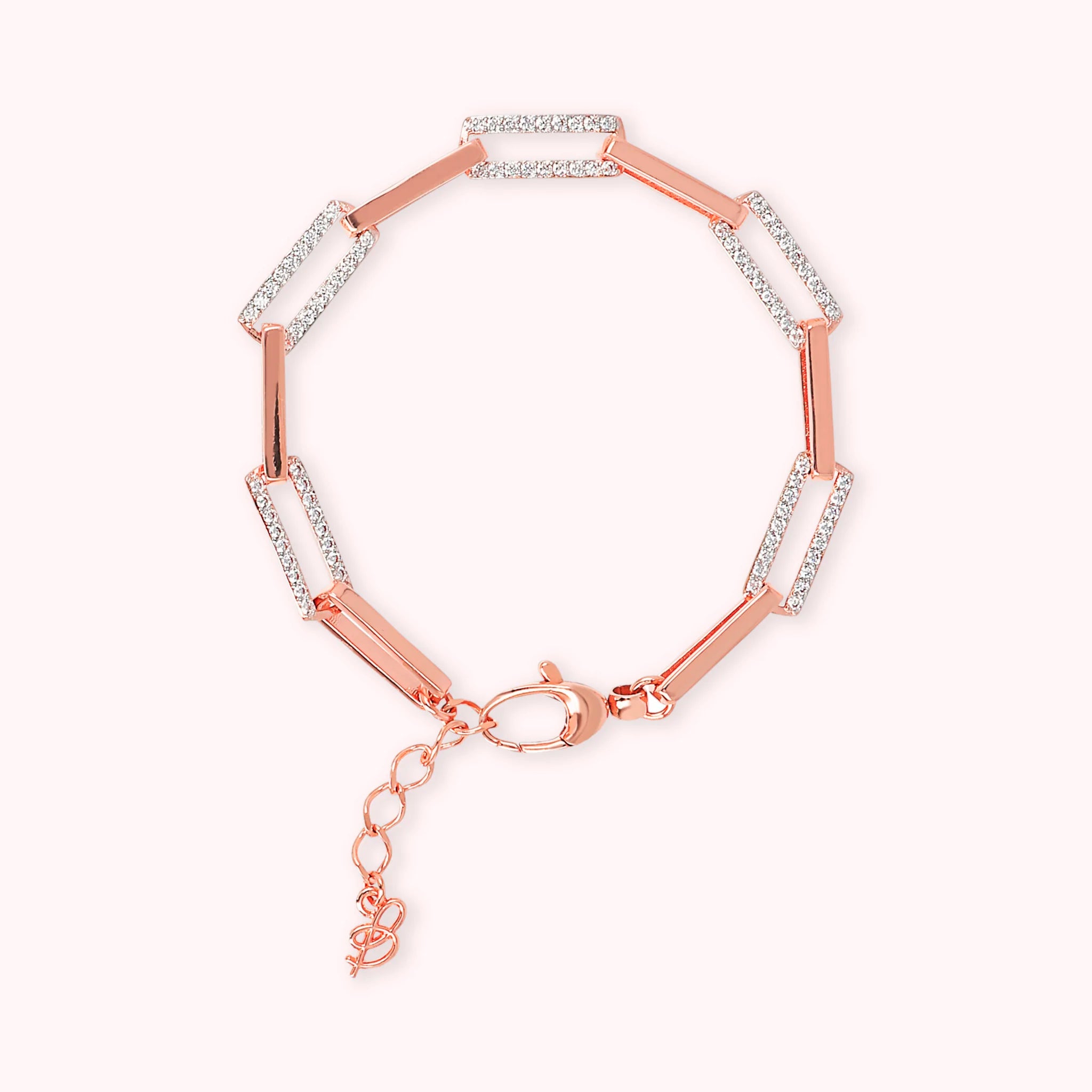 Bracelet Bronzallure réalisé sur une base Golden Rosé, doré à l'or fin 18ct, avec chaîne forçat trombone allongé ornée de zircons cubiques lumineux, pratique à porter avec fermeture à mousqueton et rallonge. Création de style, parfaite pour être portée en toute occasion.