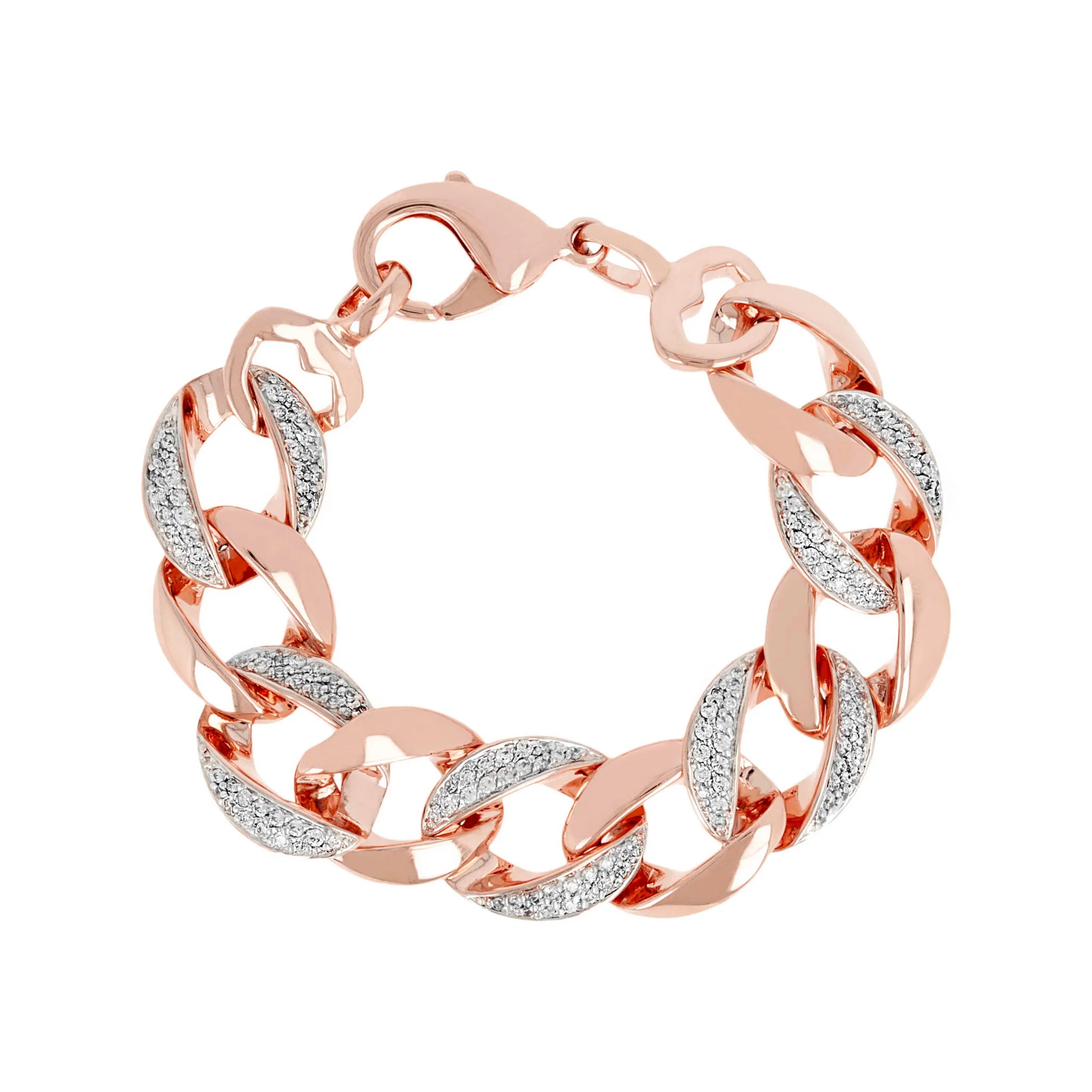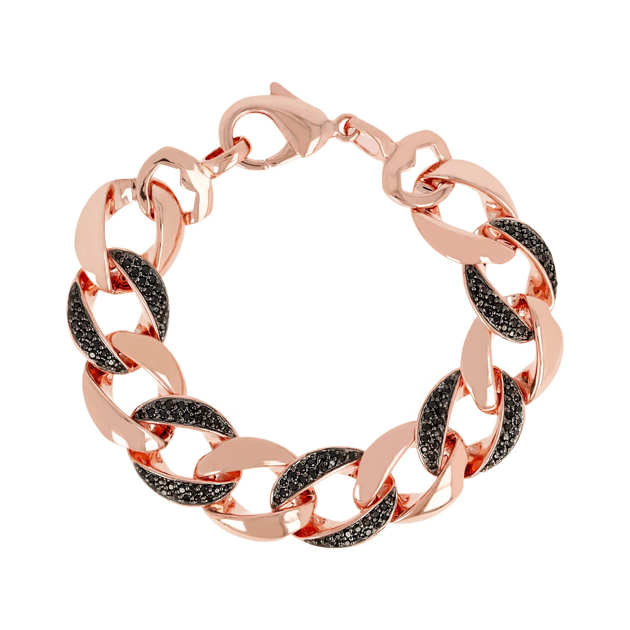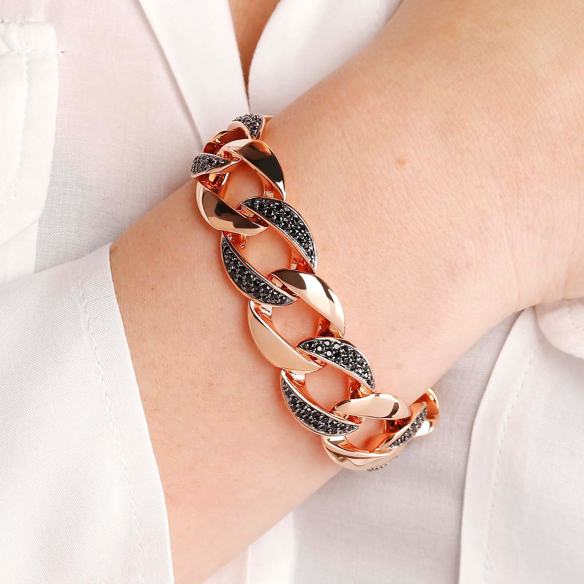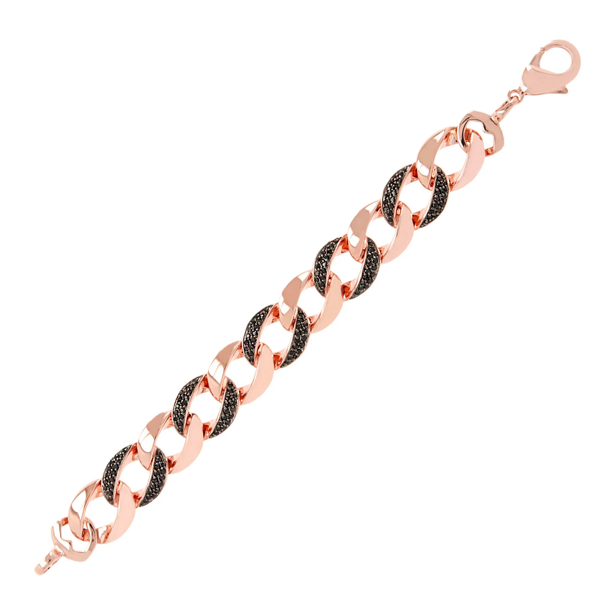 Bracelet réalisé sur une base Golden Rosé, doré à l'or fin 18ct, avec chaîne gourmette dont les maillons sont agrémentés d'éléments pavés en onyx noir ou zircone cubique, qualité lumineuse, de couleur blanche; Fermoir à homard. Création élégante, avec un design parfait pour faire briller votre look.