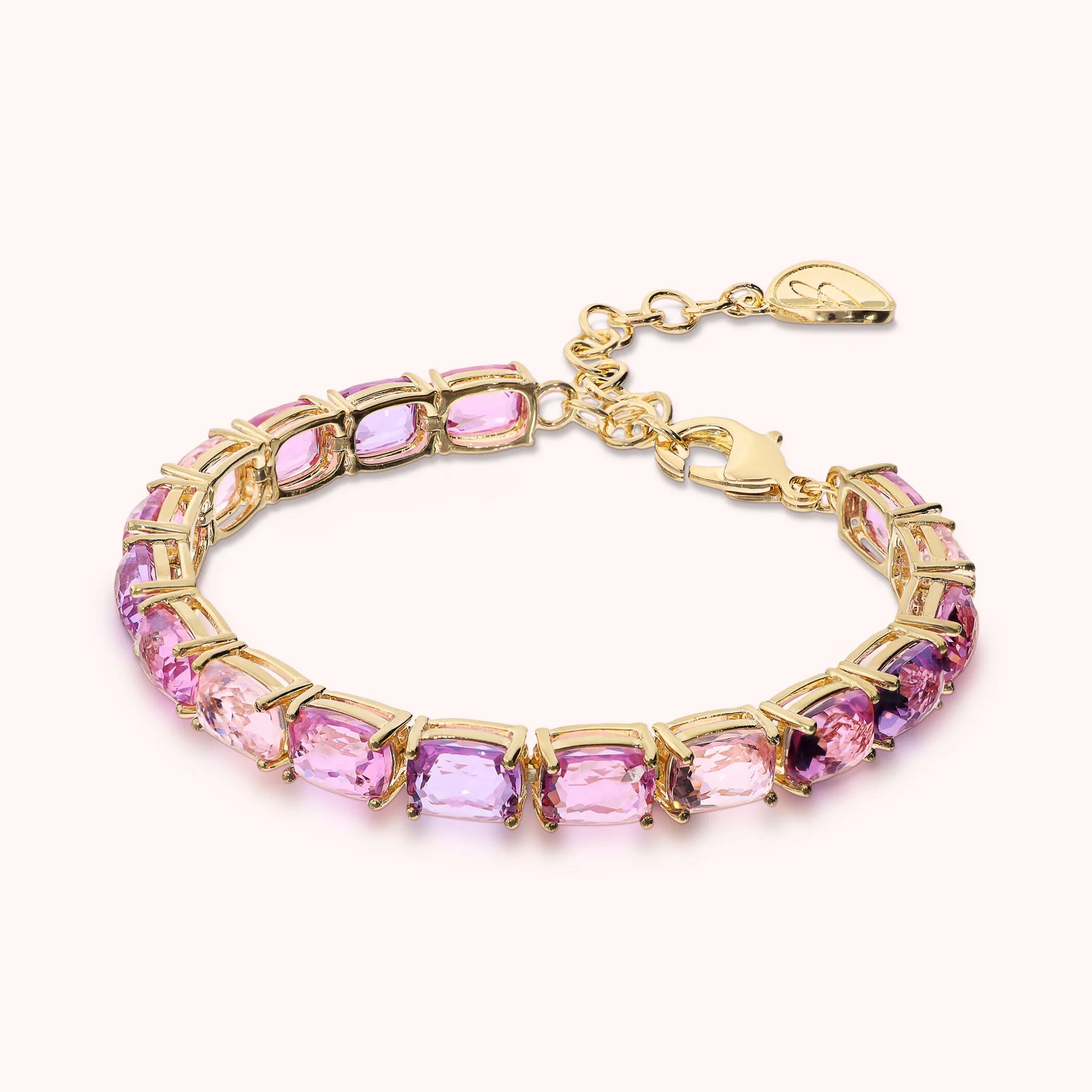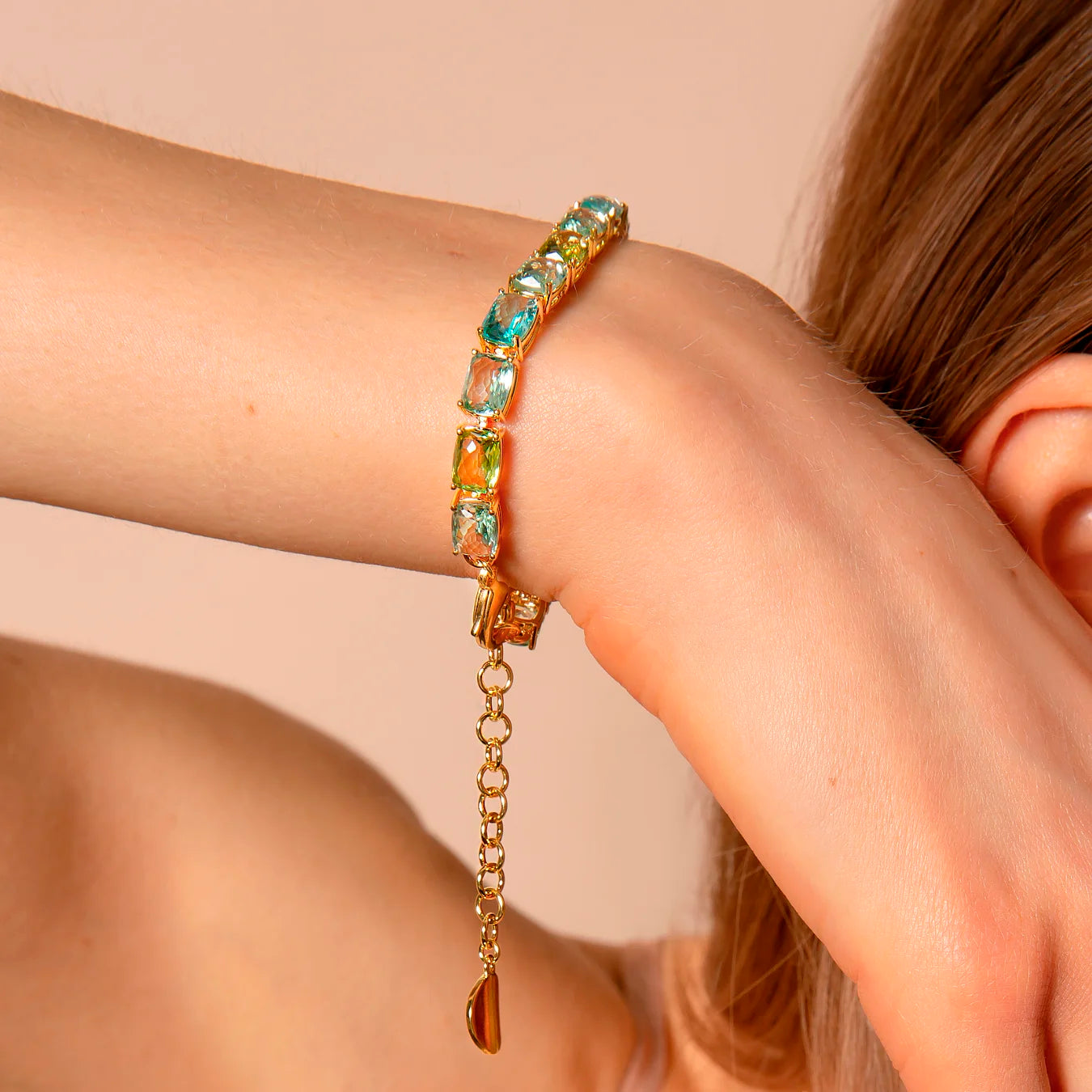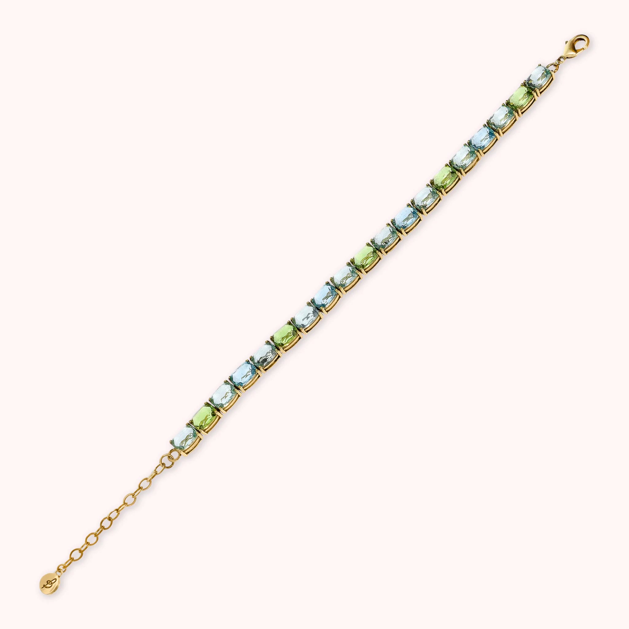 Bracelet tennis doré avec pierres précieuses prismes vertes et bleues taillées en mosaïque