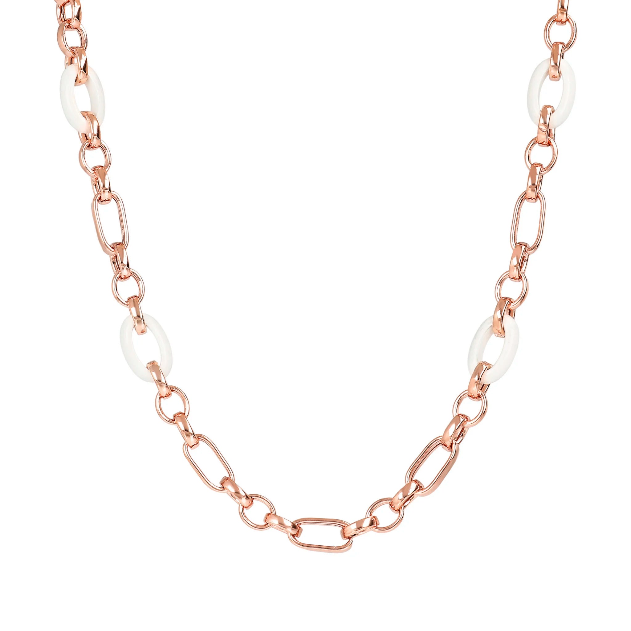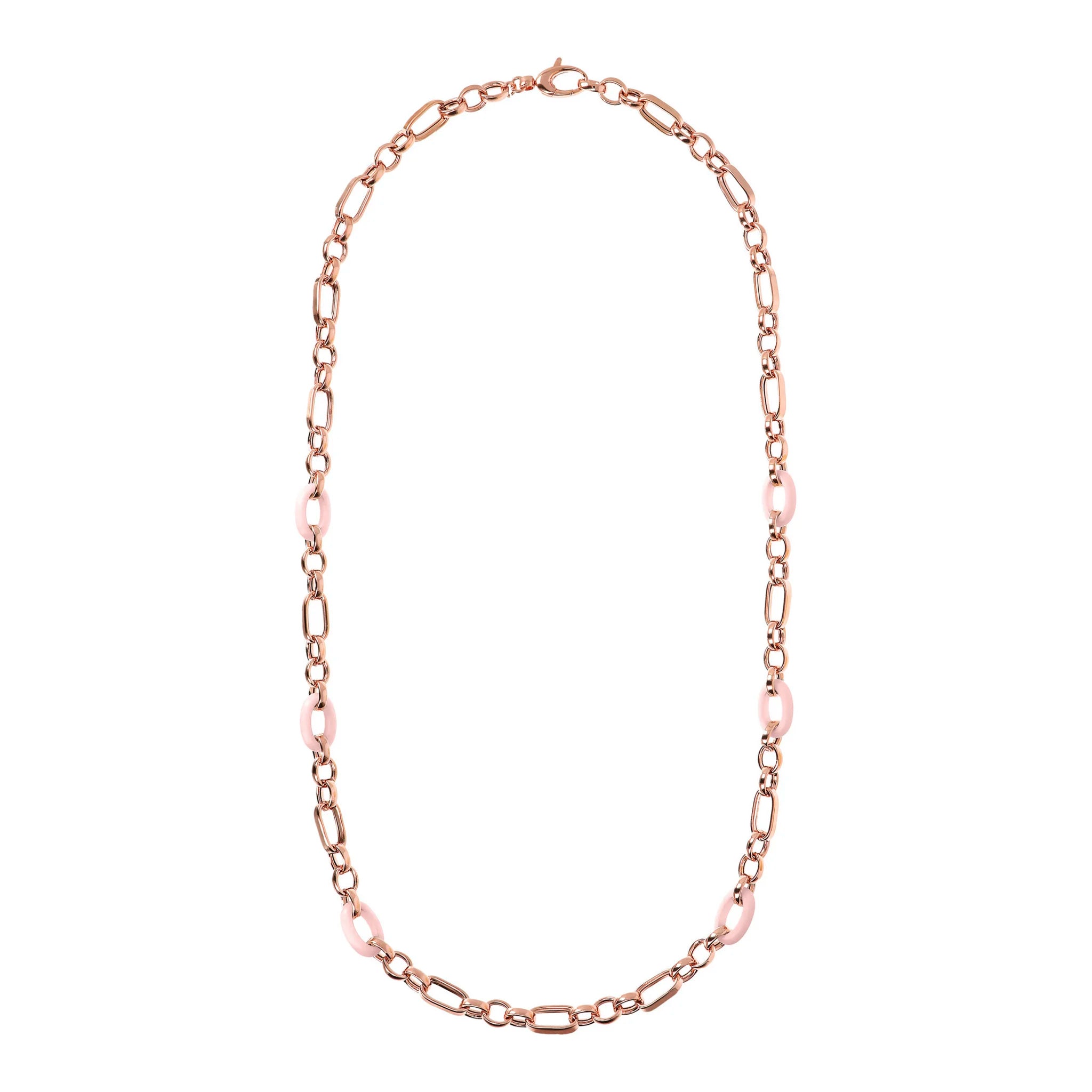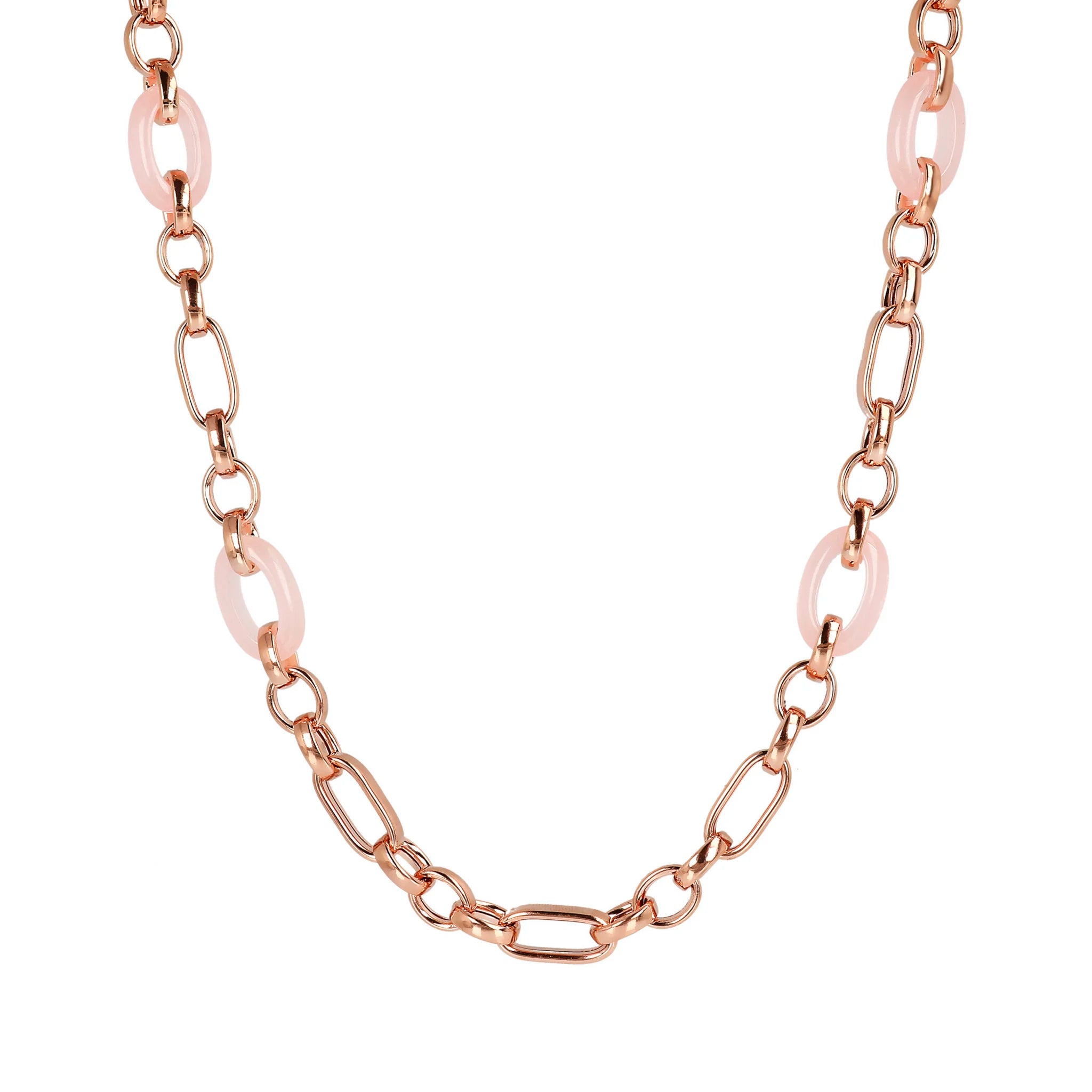 Sautoir Bronzallure réalisé sur une base Golden Rosé, doré à l'or fin 18ct, avec chaîne figaro composée d'un maillon rolo 3+1 alternant avec des maillons en pierre naturelle (13 mm), onyx noir, quartz rose ou agate blanche; Fermoir à homard.