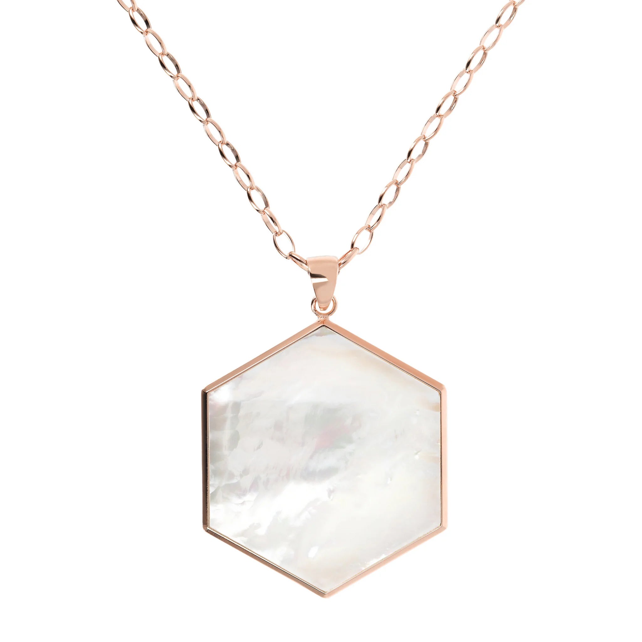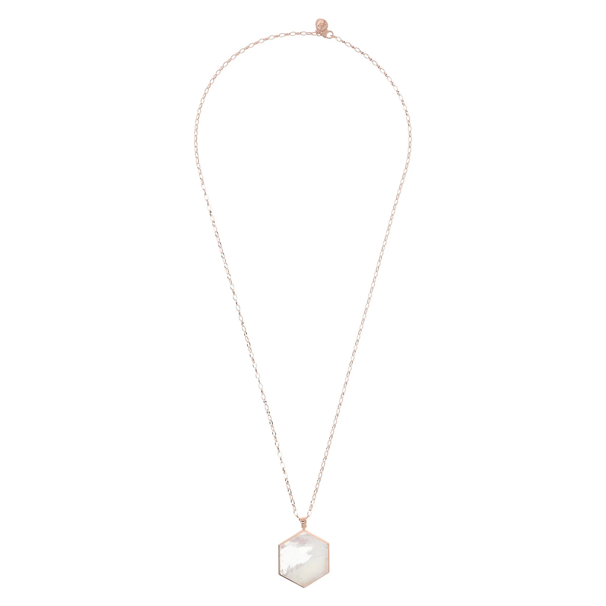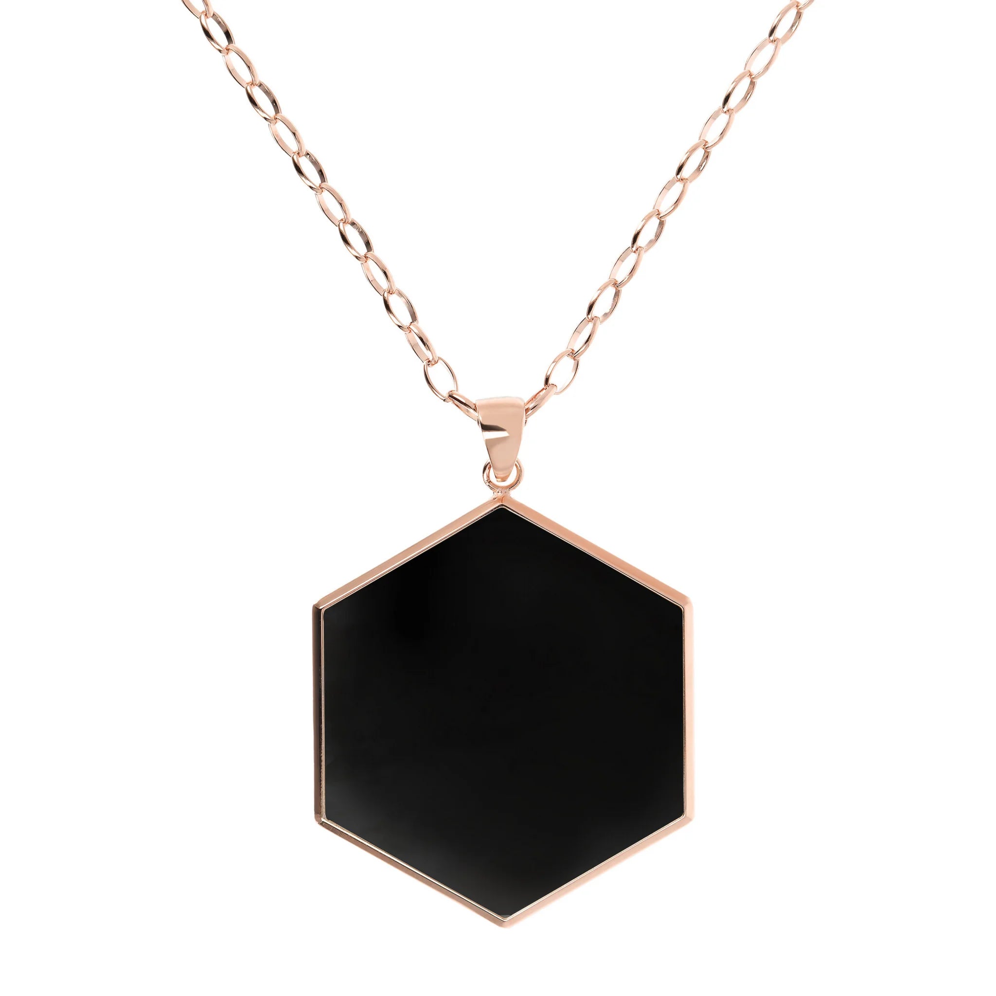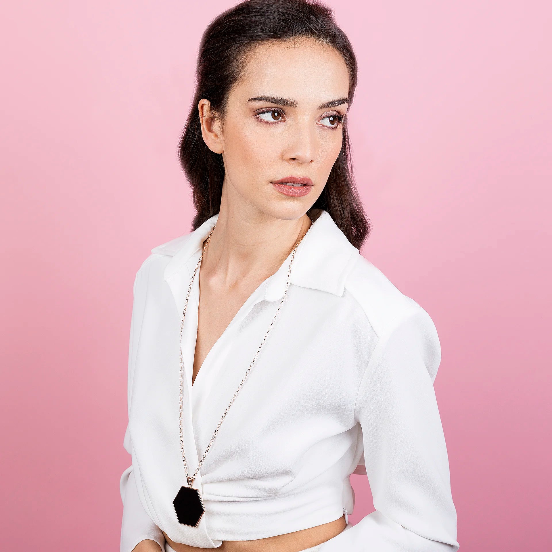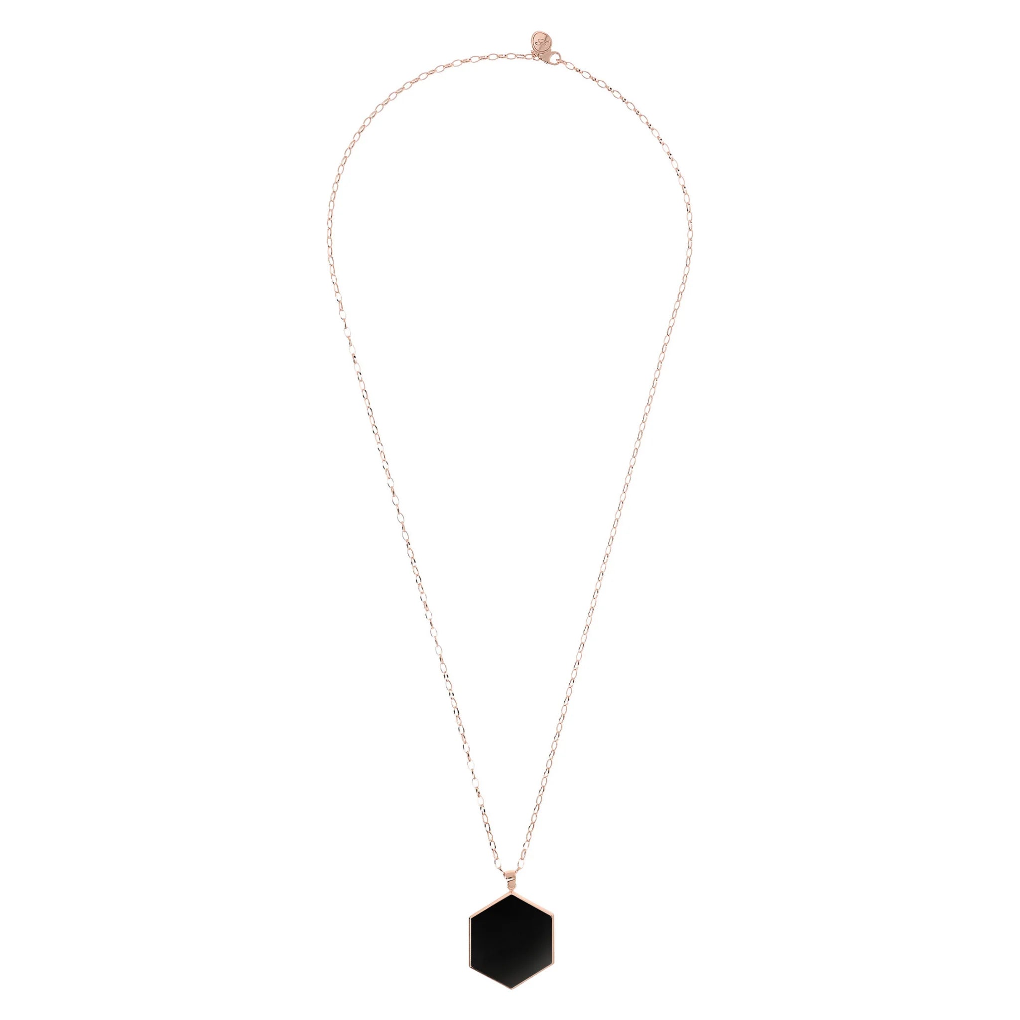 Sautoir Bronzallure en alliage Golden Rosé, doré à l'or fin 18ct, avec chaîne rolo allongée agrémentée d'un pendentif de forme hexagonale en pierre naturelle (40 mm), onyx noir ou perle blanche ; Fermoir à homard.