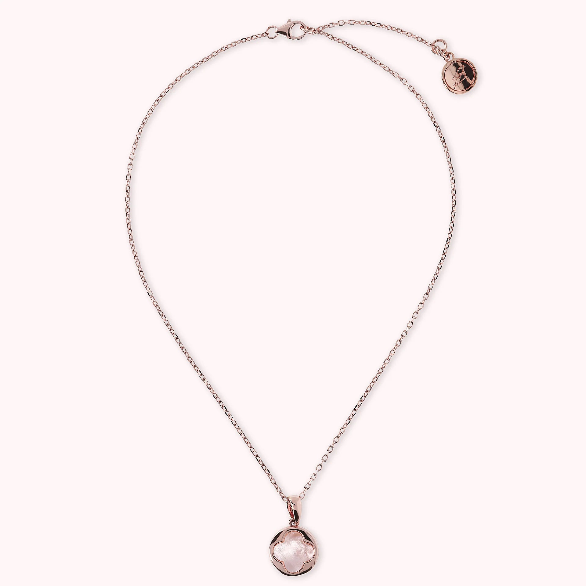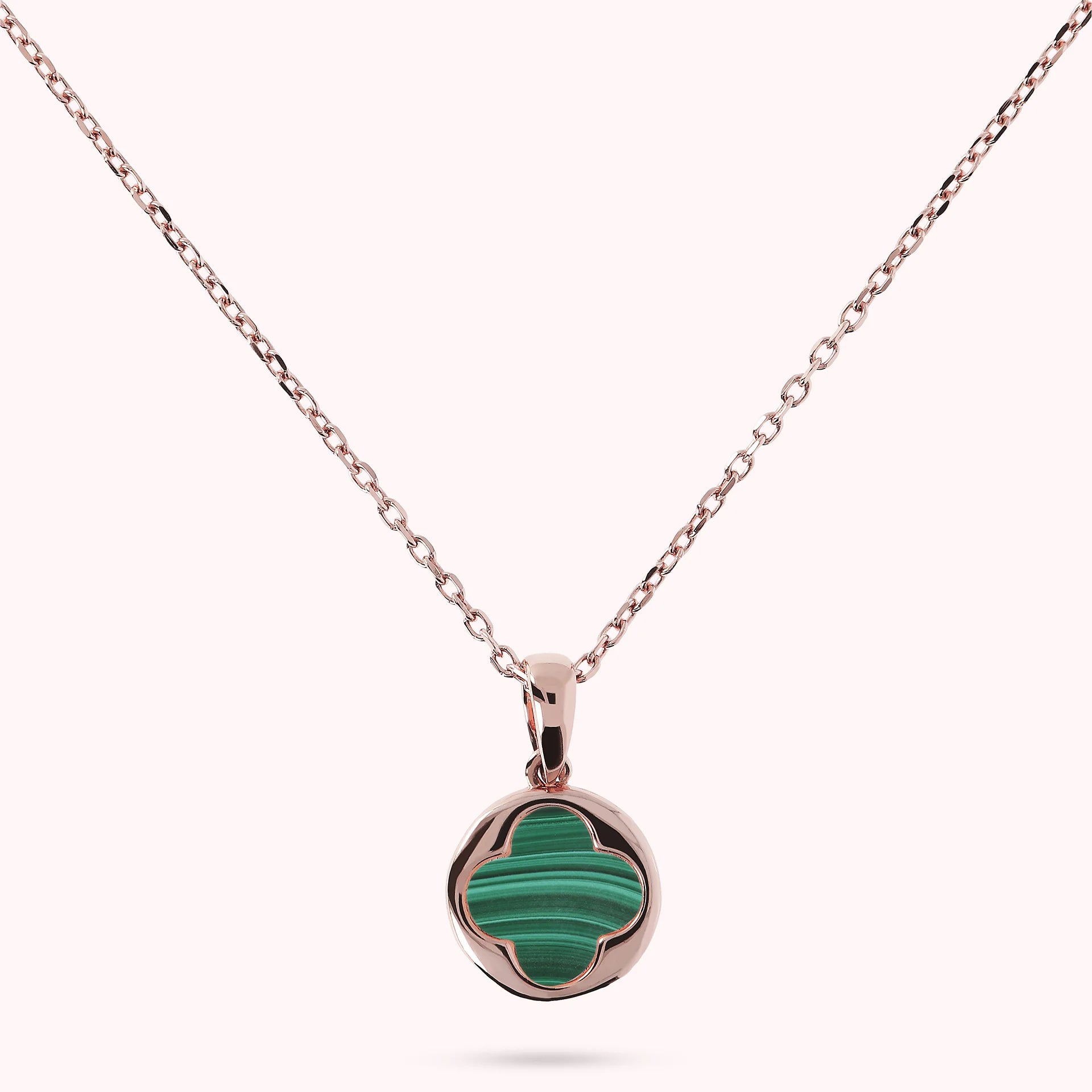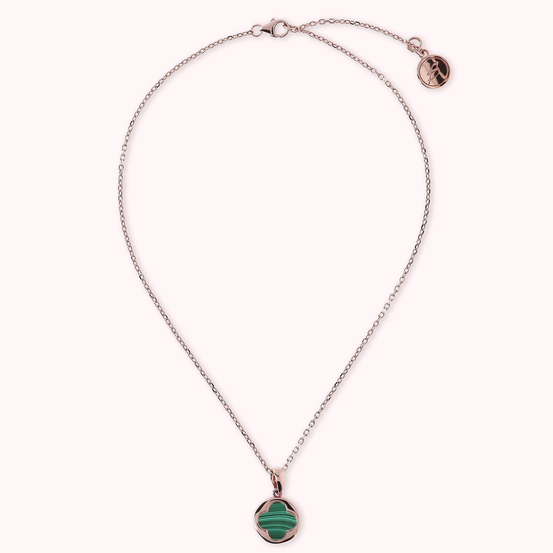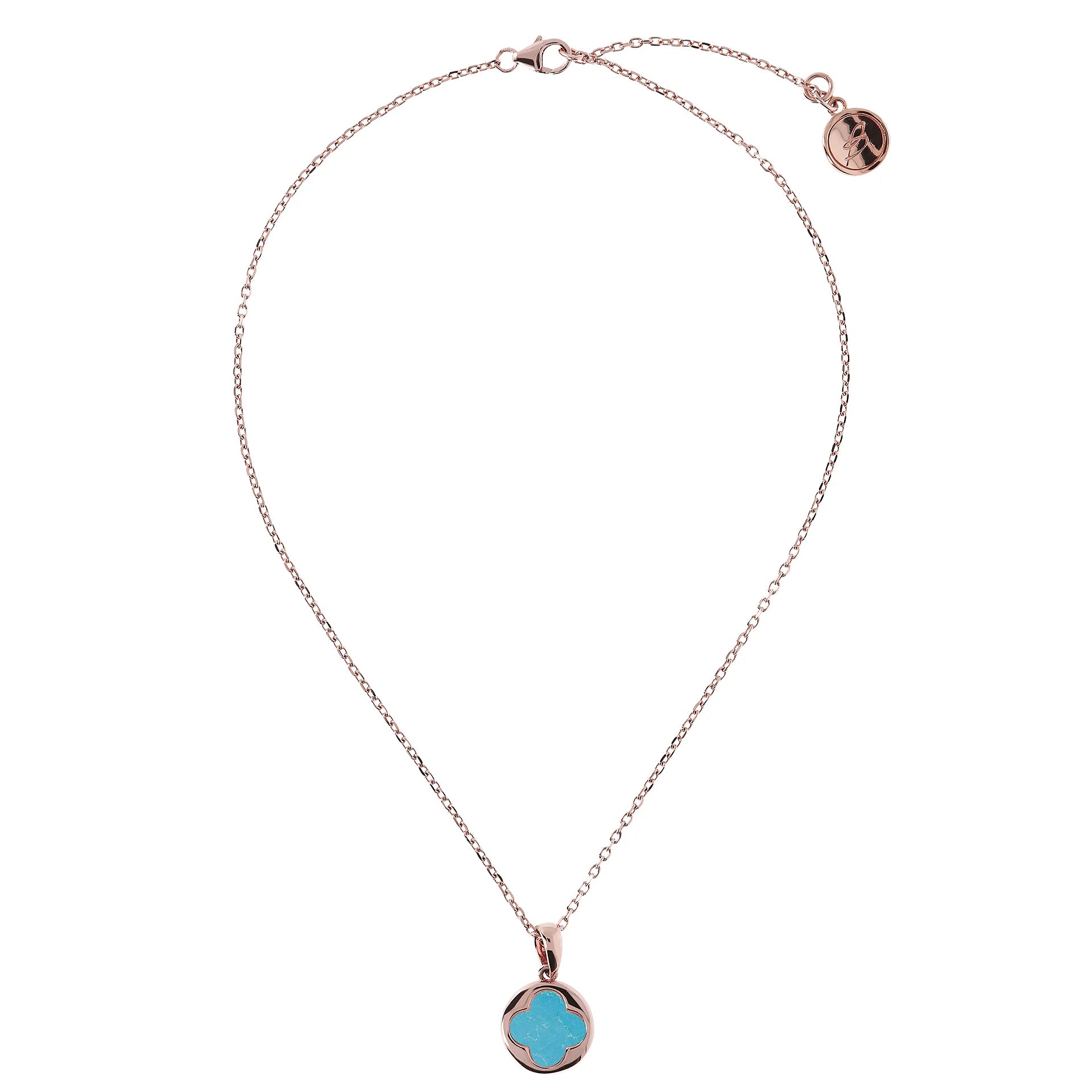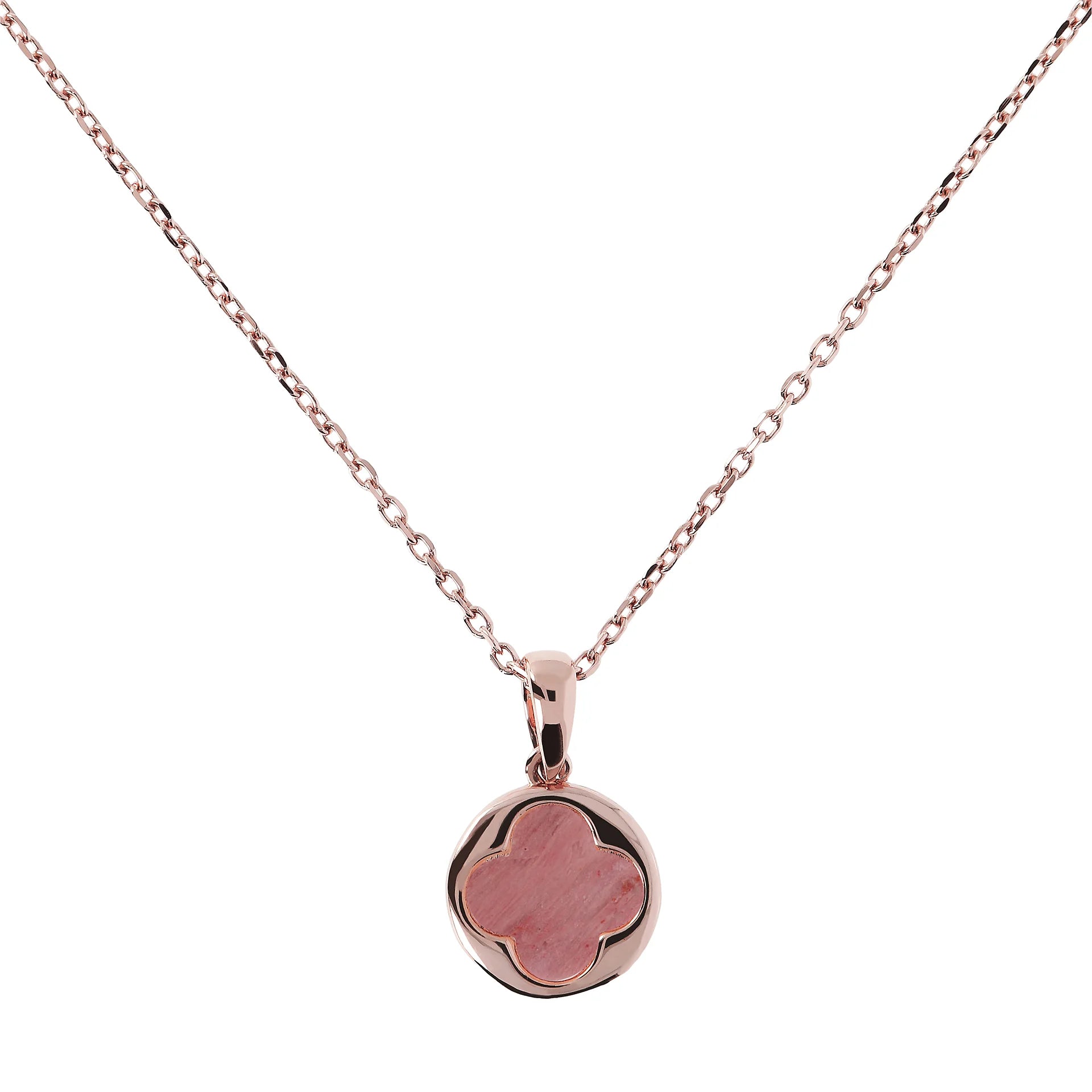Collier Bronzallure en alliage Golden Rosé, doré à l'or fin 18ct, avec chaîne rolo ornée d'un pendentif avec un petit trèfle à quatre feuilles en pierre naturelle, fermeture à mousqueton avec rallonge.