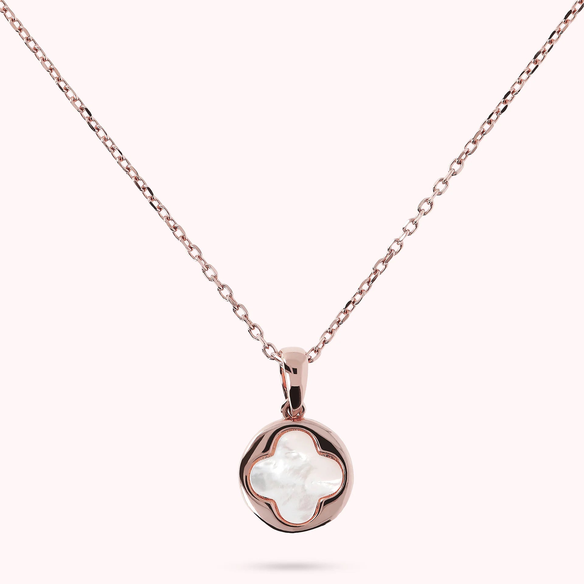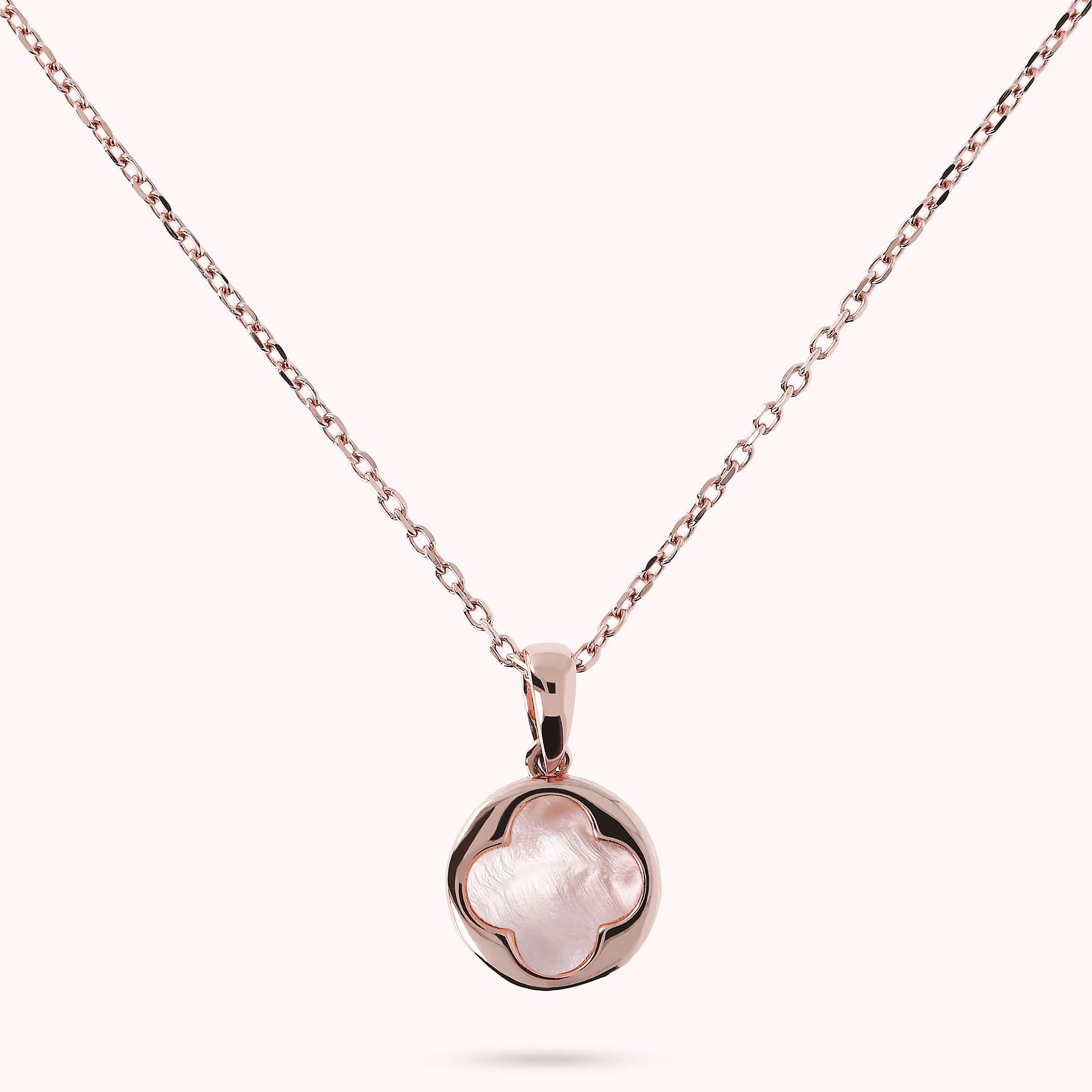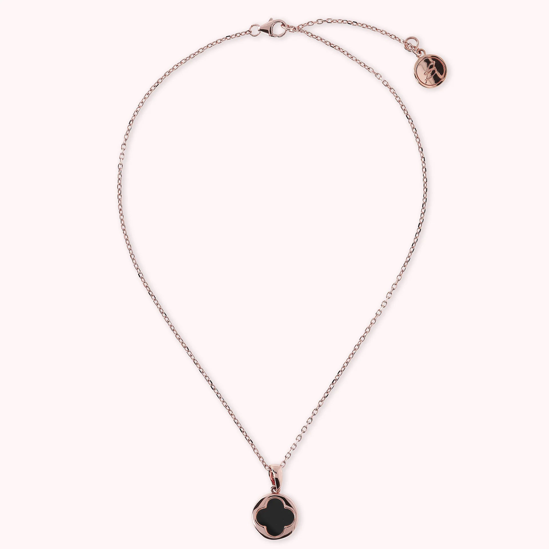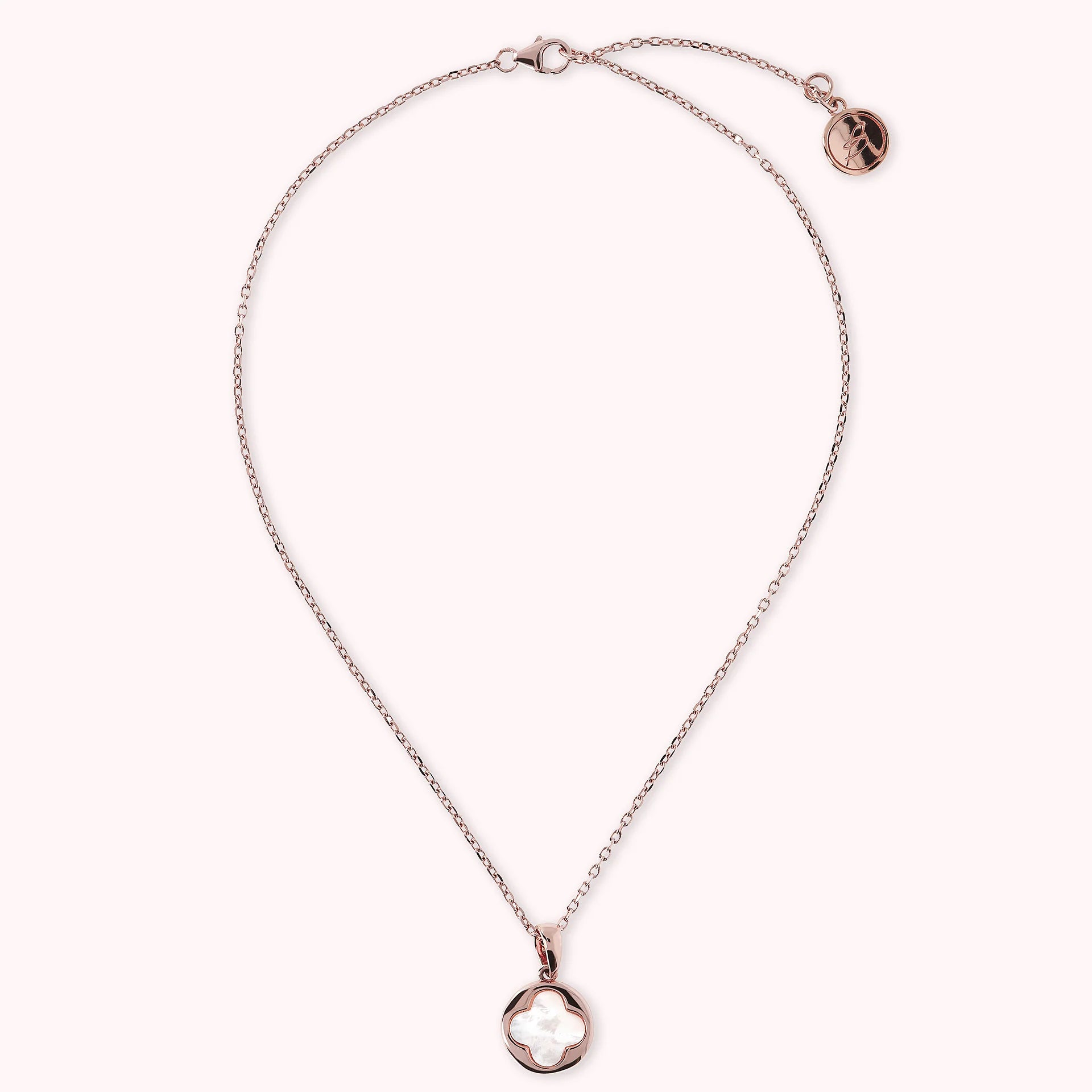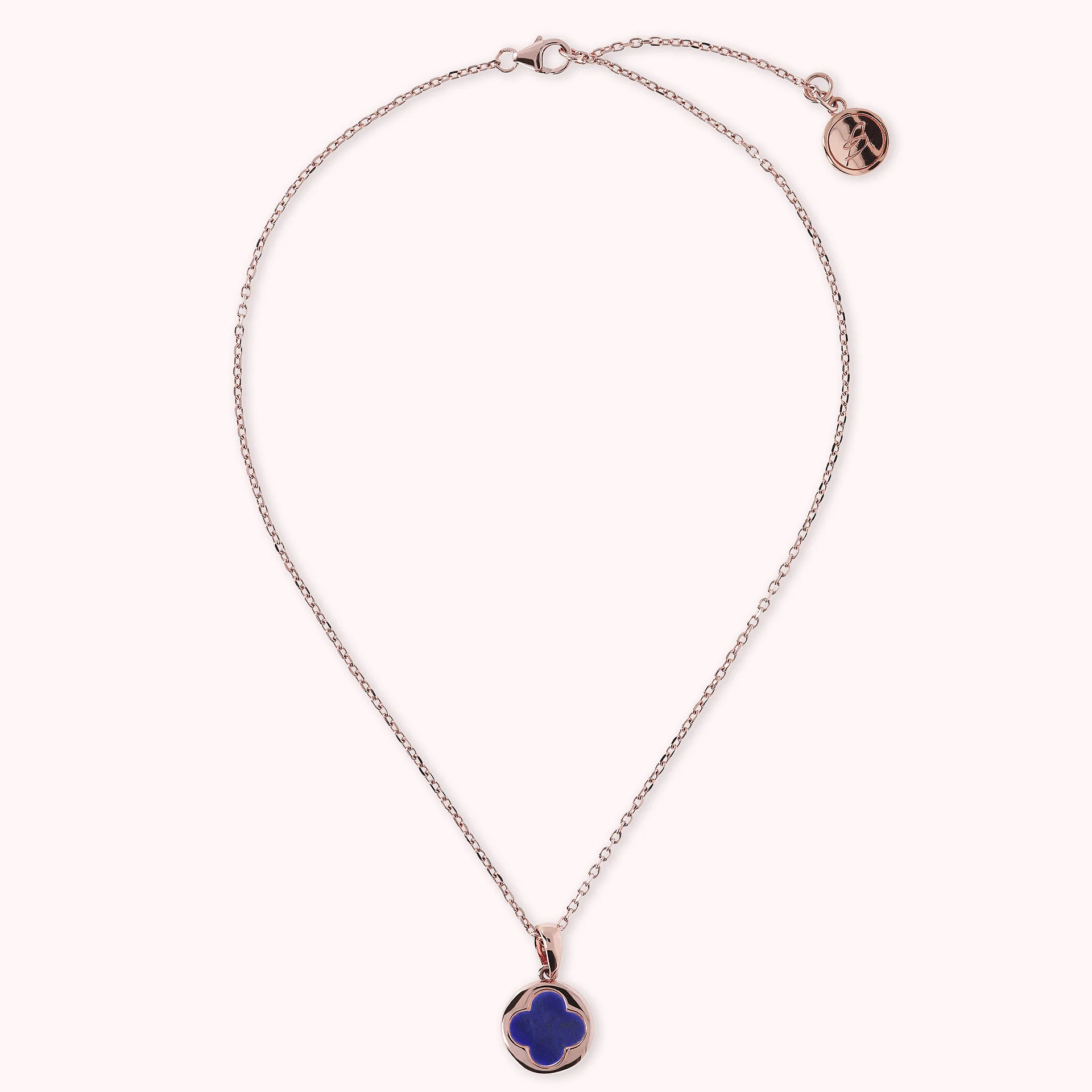 Collier Bronzallure en alliage Golden Rosé, doré à l'or fin 18ct, avec chaîne rolo ornée d'un pendentif avec un petit trèfle à quatre feuilles en pierre naturelle, fermeture à mousqueton avec rallonge.