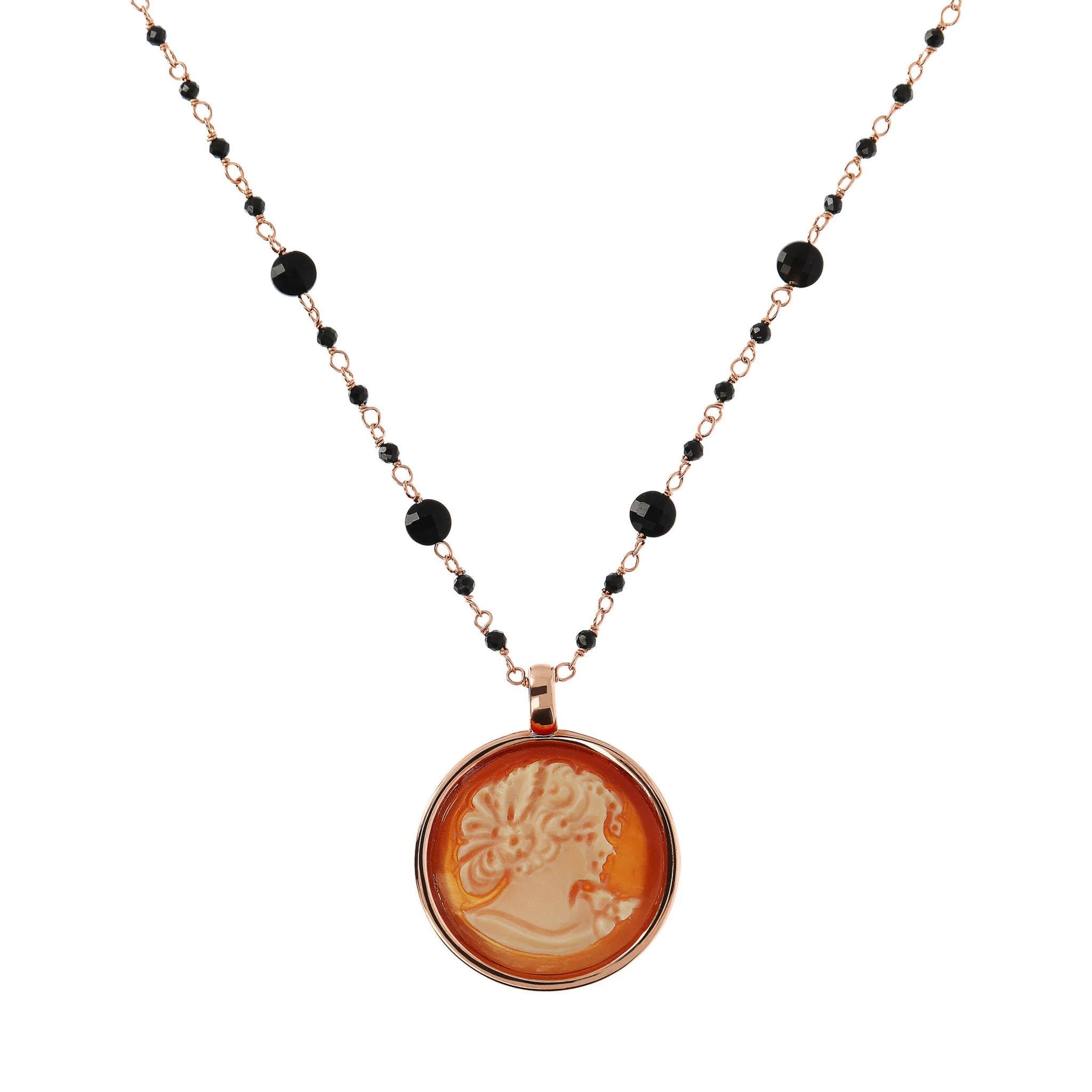 Collier chapelet Bronzallure en alliage Golden Rosé, doré à l'or fin 18ct, agrémenté d'un pendentif avec camée et petits spinelles noirs ou pierres naturelles de calcédoine orange; Fermoir à homard.