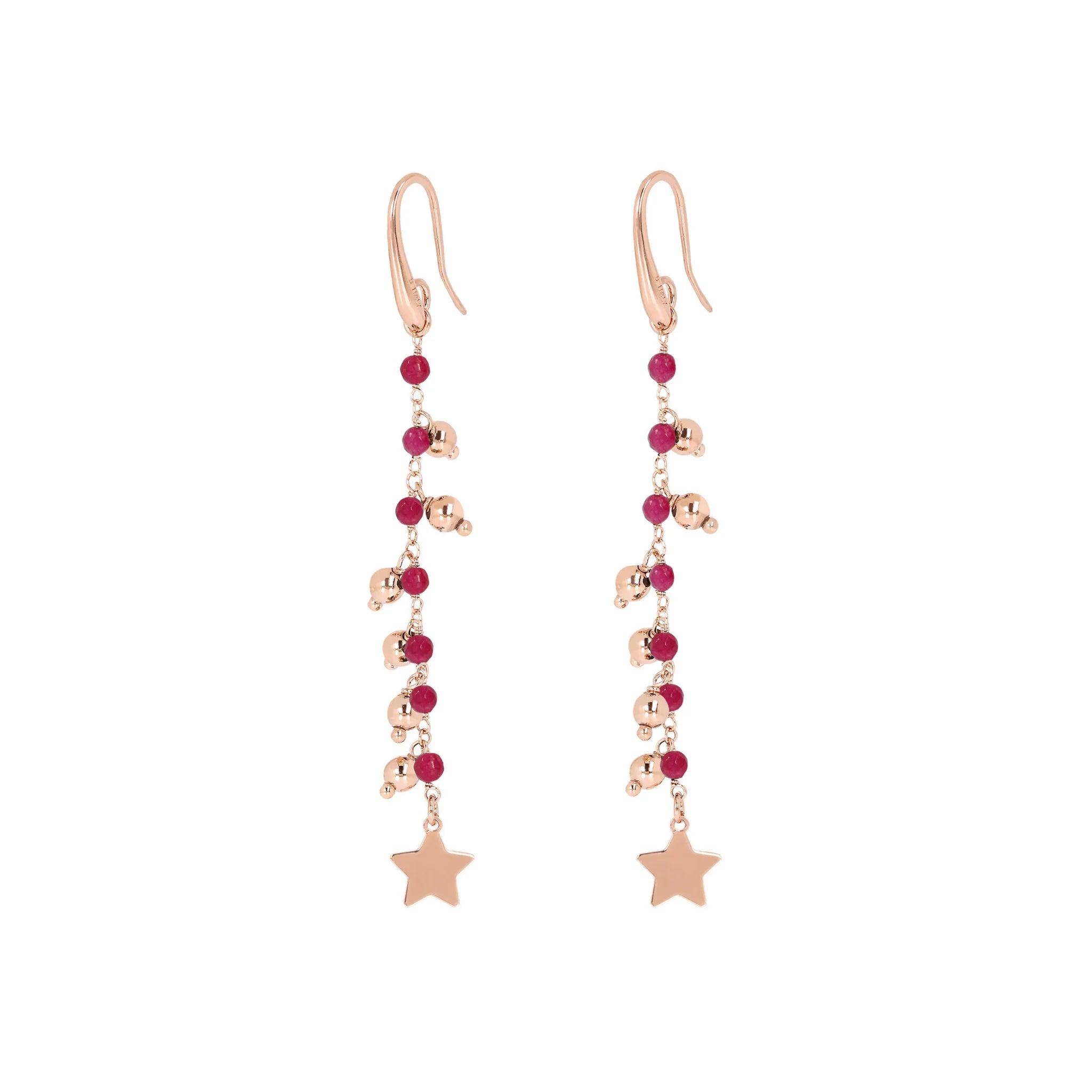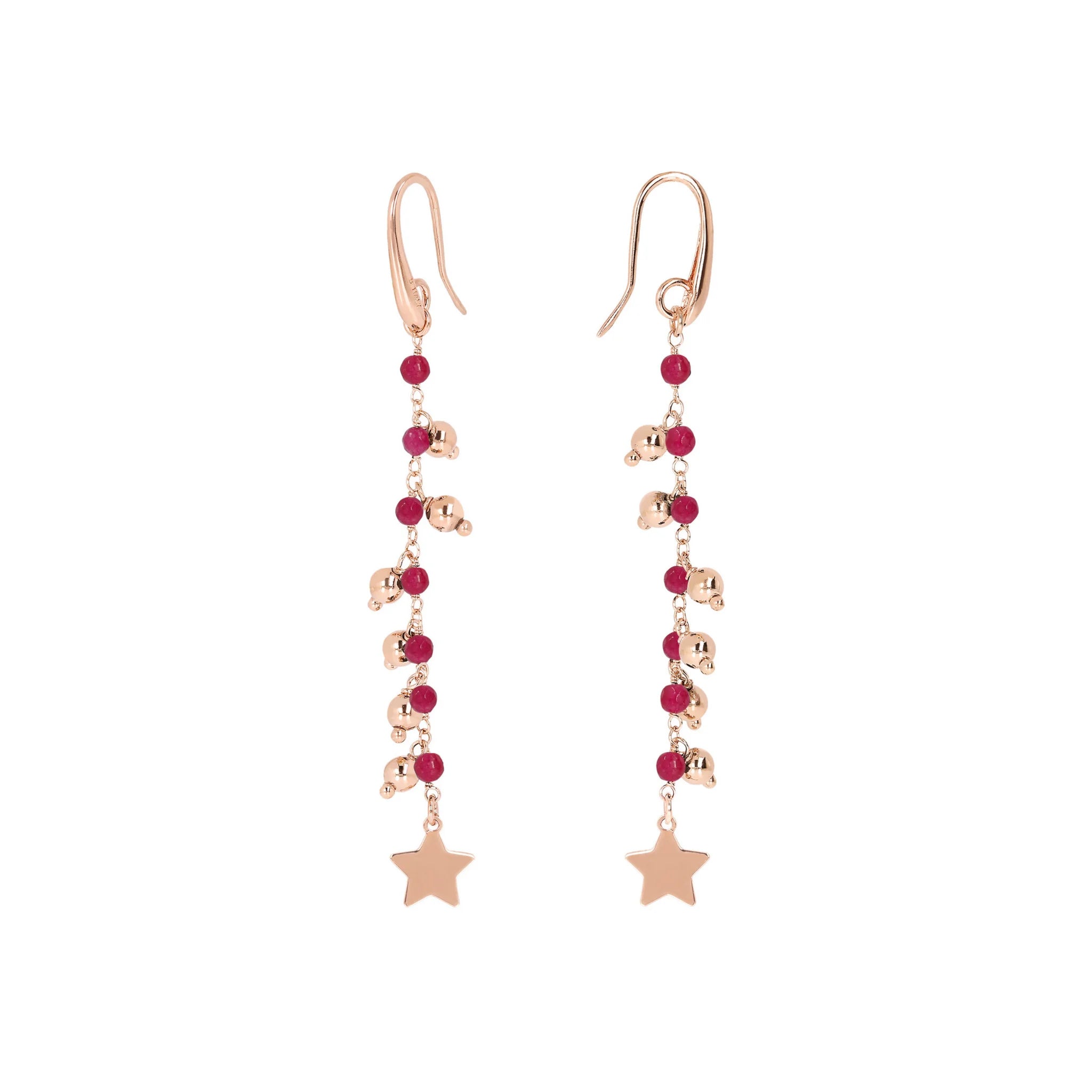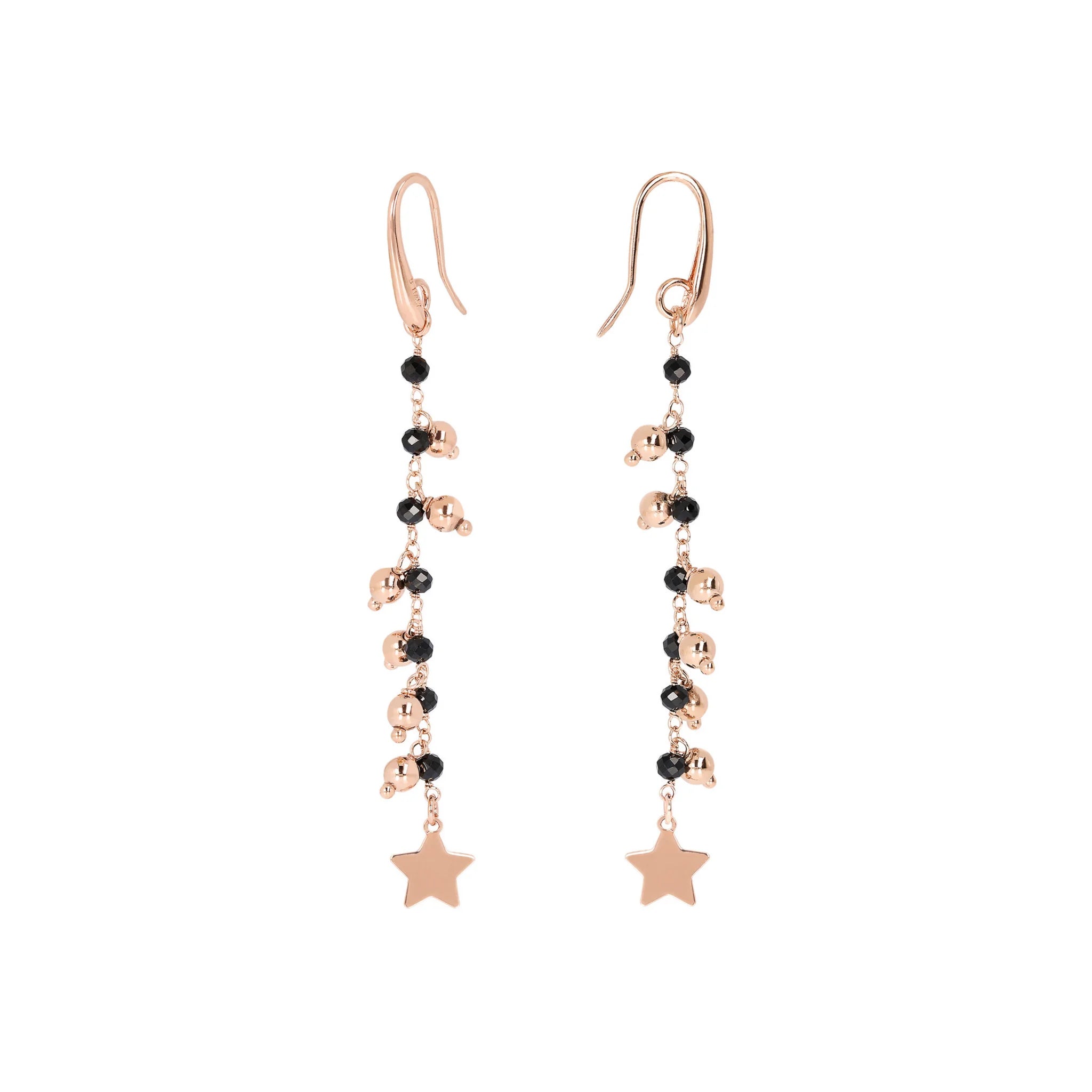 Boucles d'oreilles Bronzallure en alliage Golden Rosé, doré à l'or fin 18ct, agrémentées de petites pierres naturelles de spinelle noir ou d'agate rouge et d'un pendentif final doré ; fermoir papillon.