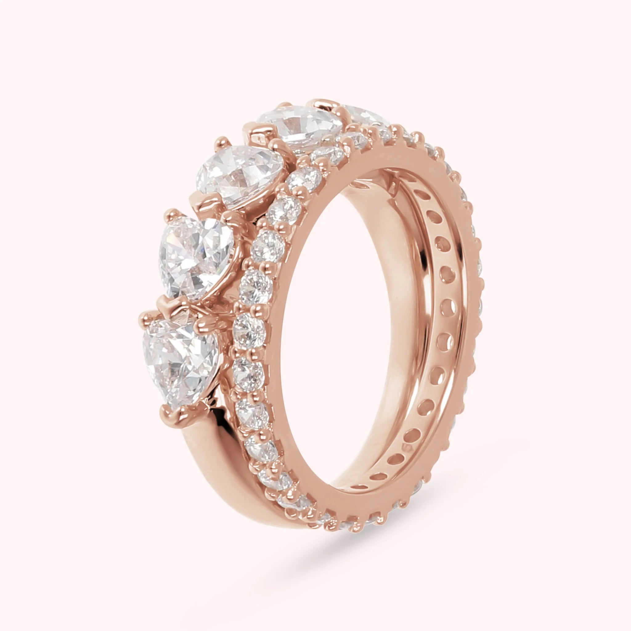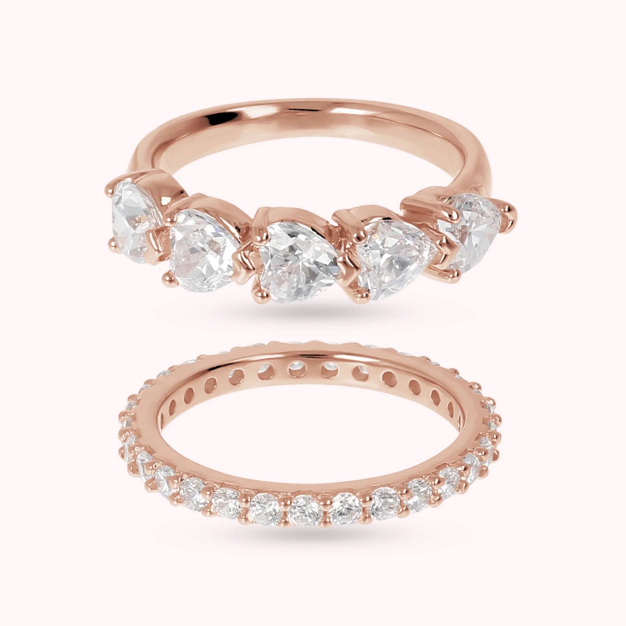 Ensemble de bagues Bronzallure en alliage Golden Rosé, doré à l'or fin 18ct. La parure se compose d'une bague rivière avec des cœurs en zircons cubiques et d'une bague éternity entièrement recouverte de petits zircons.