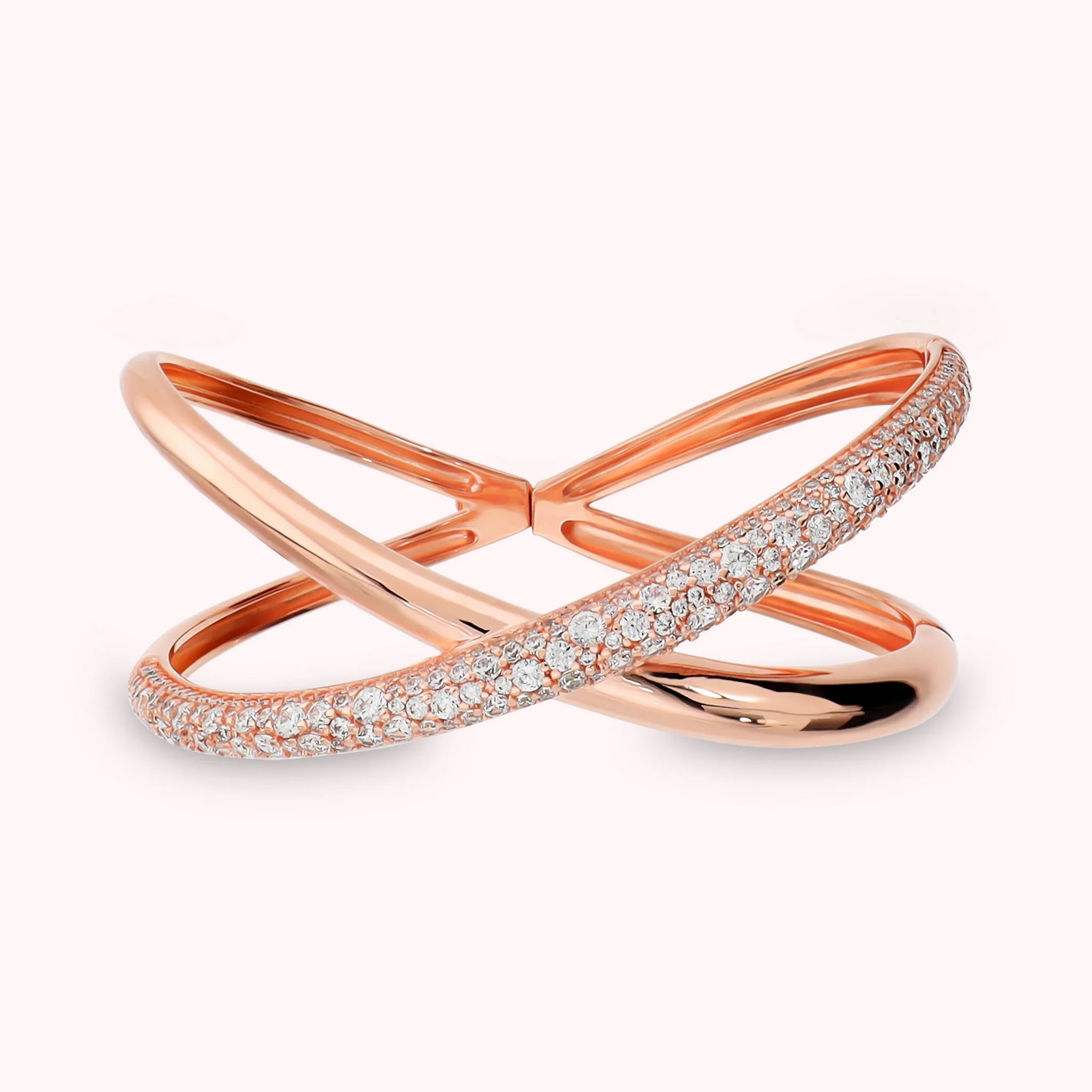 Bracciale rigido Bronzallure realizzato in lega Golden Rosé, placcata Oro 18kt, dal design a incrocio con superficie lucida e in pavé di cubic zirconia, qualità luminosa.