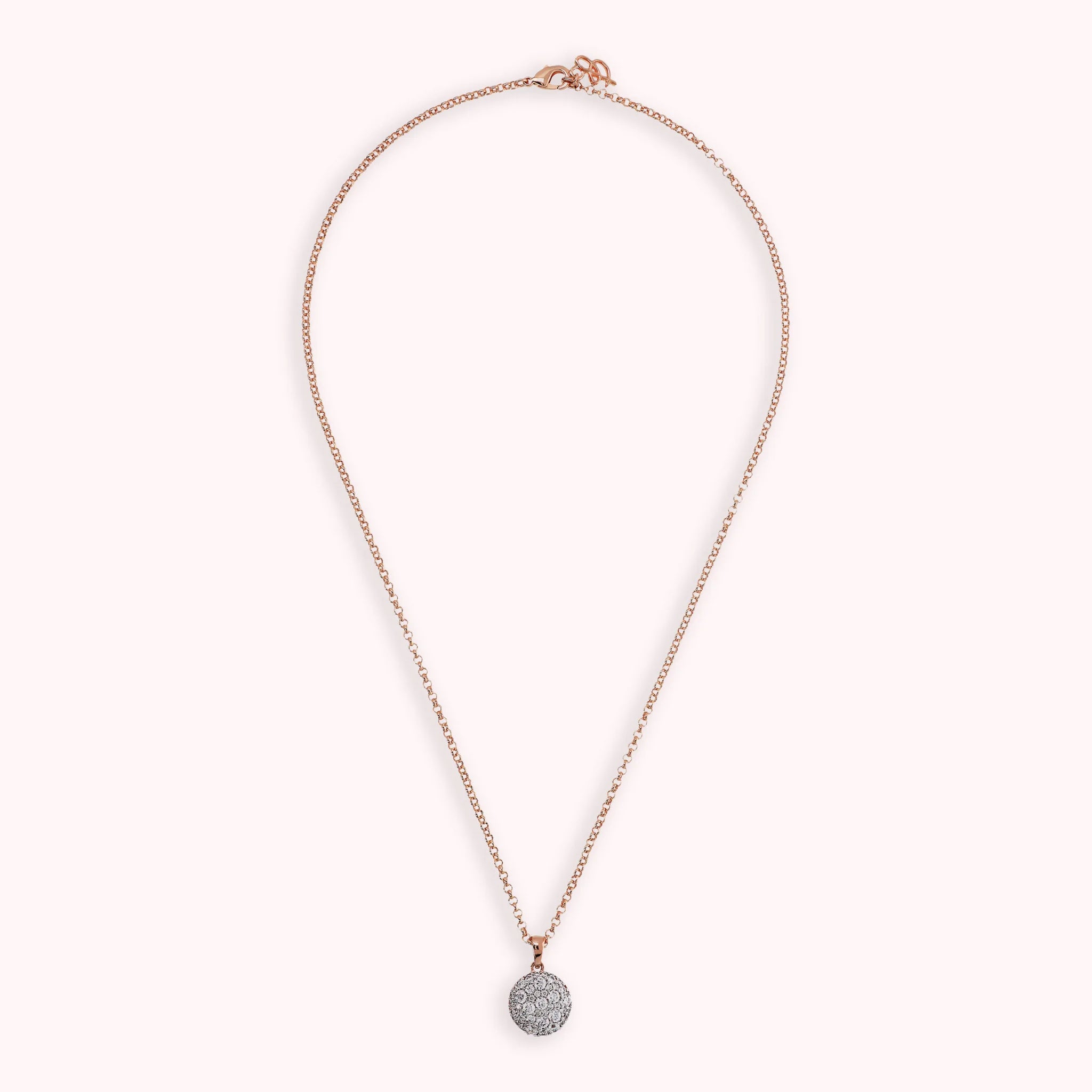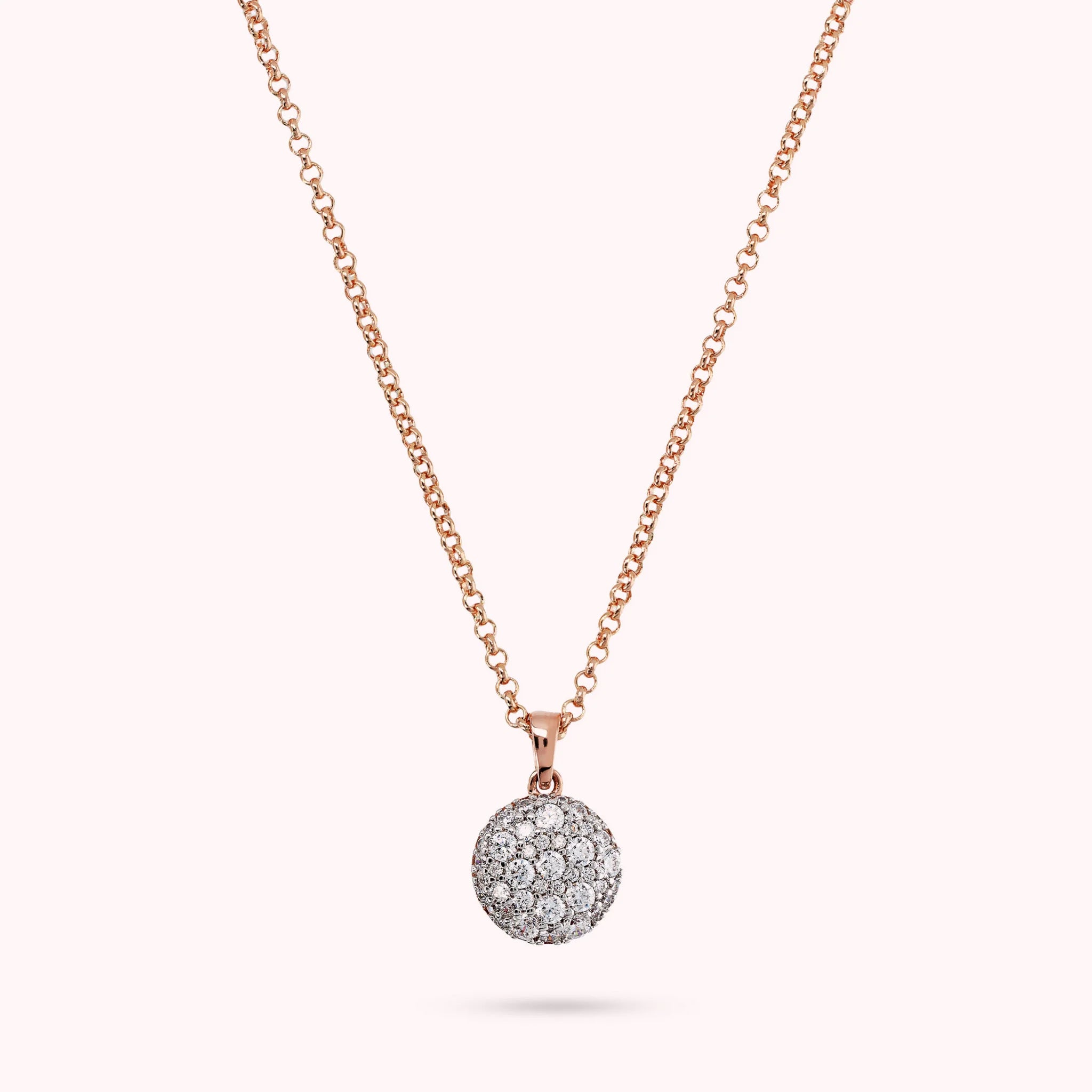 Collana Bronzallure realizzata in lega Golden Rosé, placcata Oro rosa 18kt, con catena rolo impreziosita da un ciondolo tondo (15 mm) con superficie pavé in cubic zirconia, qualità luminosa. Chiusura a moschettone.